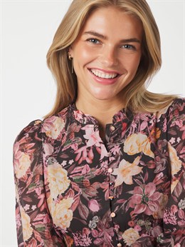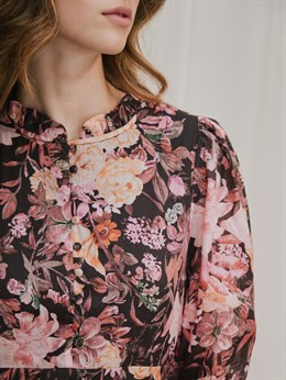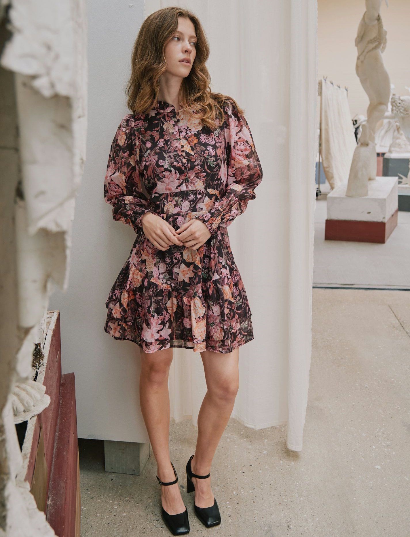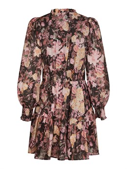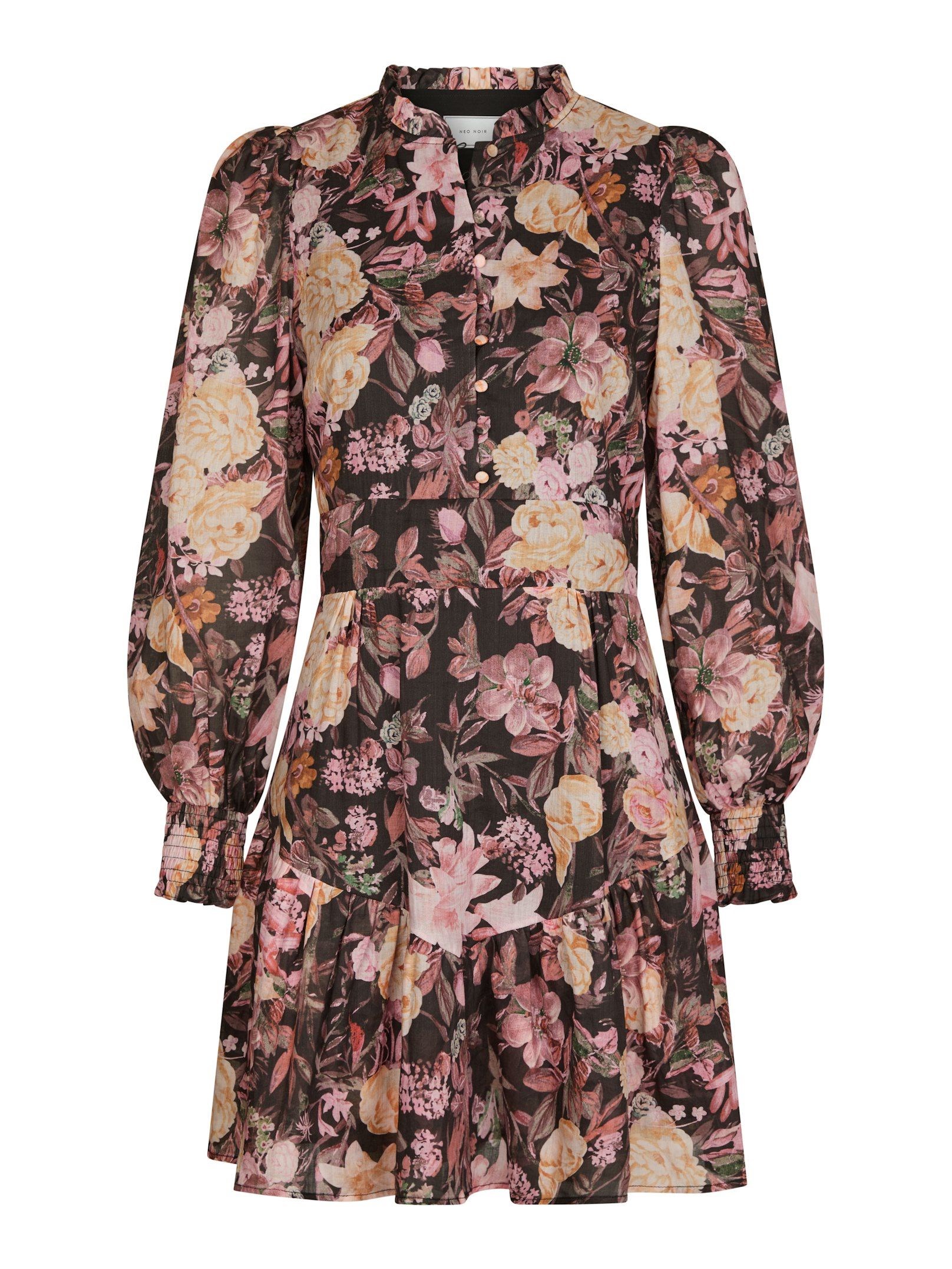 Smuk kjole fra Neo Noir med blomsterprint og figursyet facon. Kjolen har knaplukning foran og elastisk talje i ryggen. Den har et feminint a-formet skørt og lange ærmer med smock ved håndleddet. Modellen er 176 cm og bærer en størrelse 36.