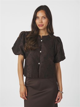 Fine mørkebrun bluse fra Neo Noir i en flot struktureret brokade kvalitet med korte pufærmer og dekorativ knappelukning foran. Modellen er 176 høj og iført størrelse 36.