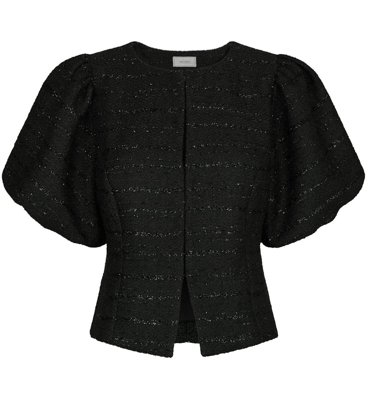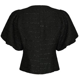 Smuk sort bluse fra Neo Noir i lækker boucle kvalitet med delikat glittereffekt og store pufærmer samt knappelukning foran. Modellen på billedet er 176 cm og iført størrelse 36.