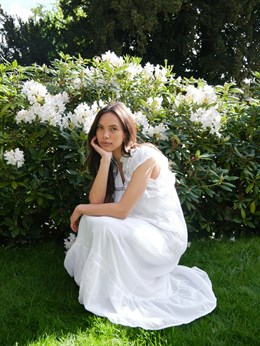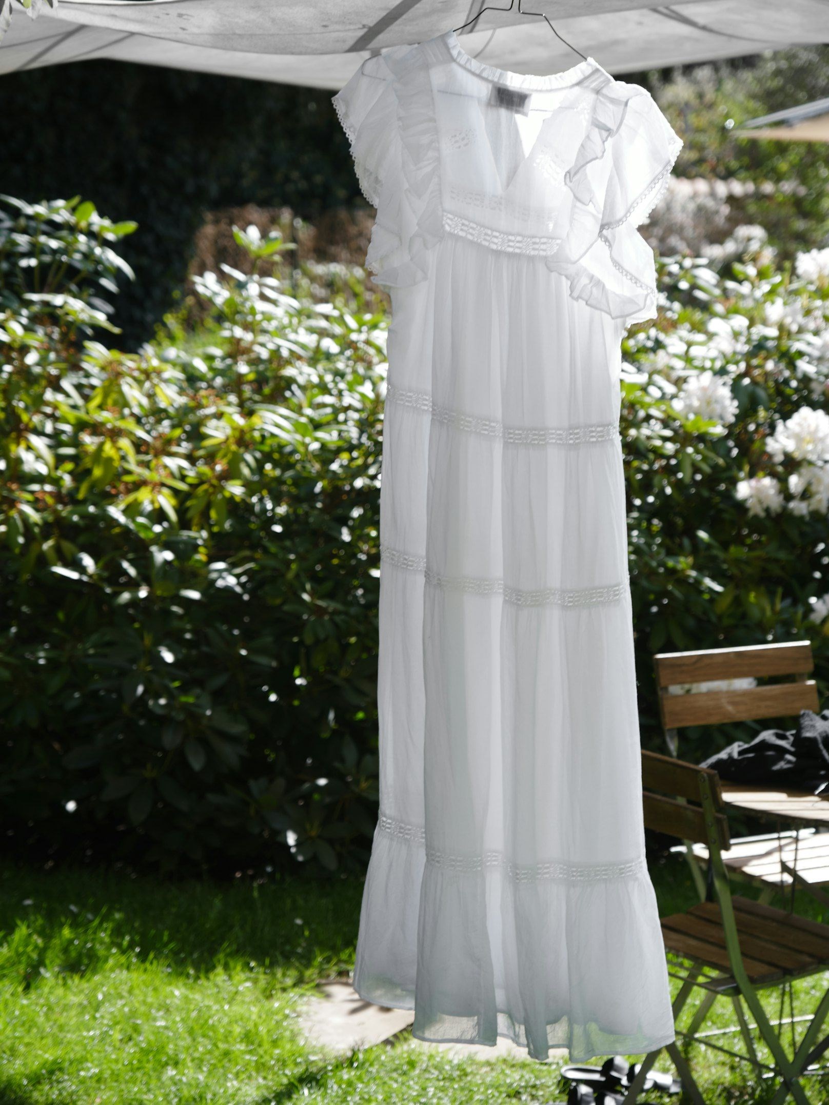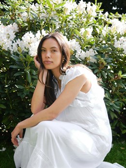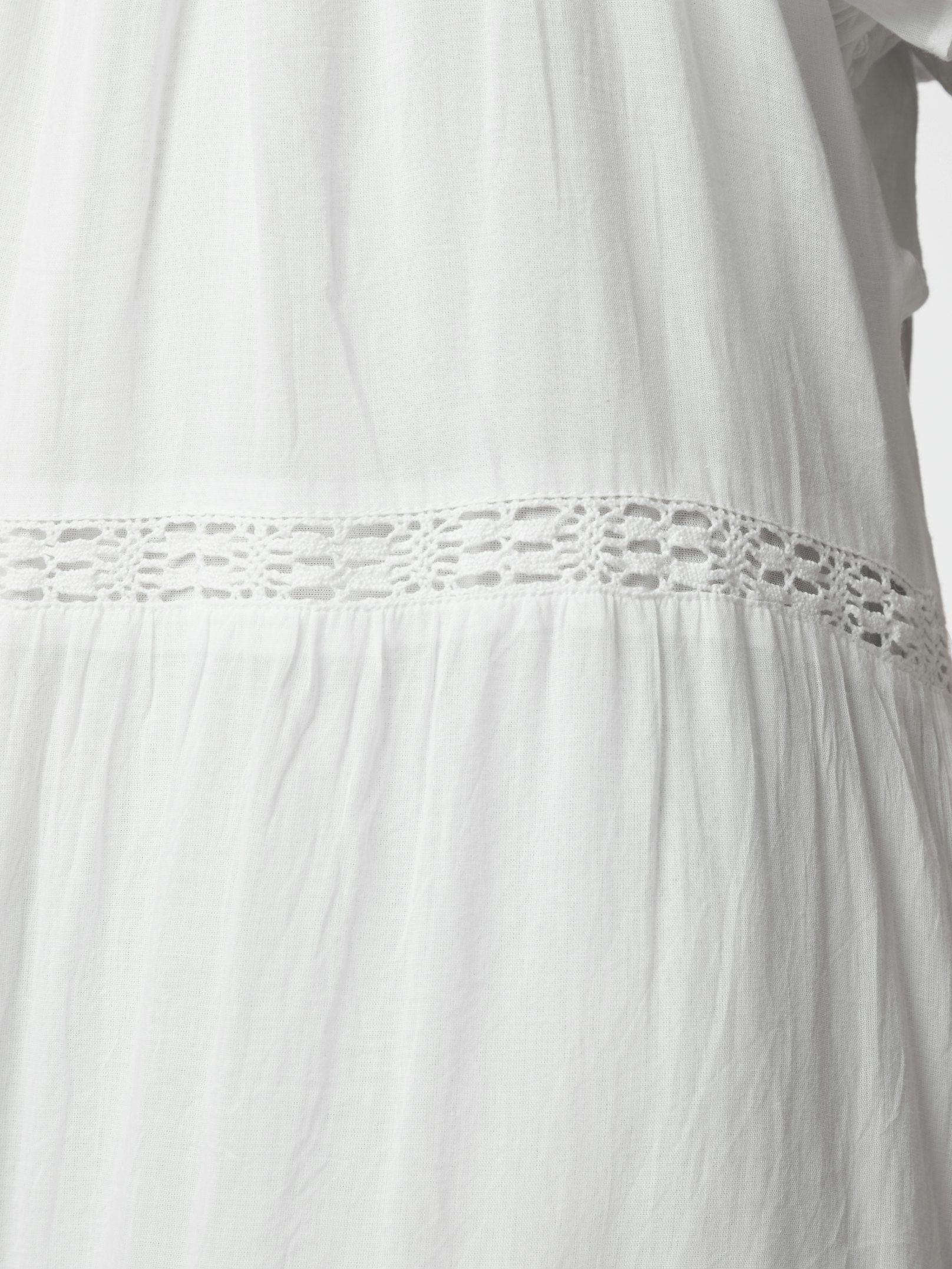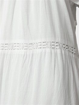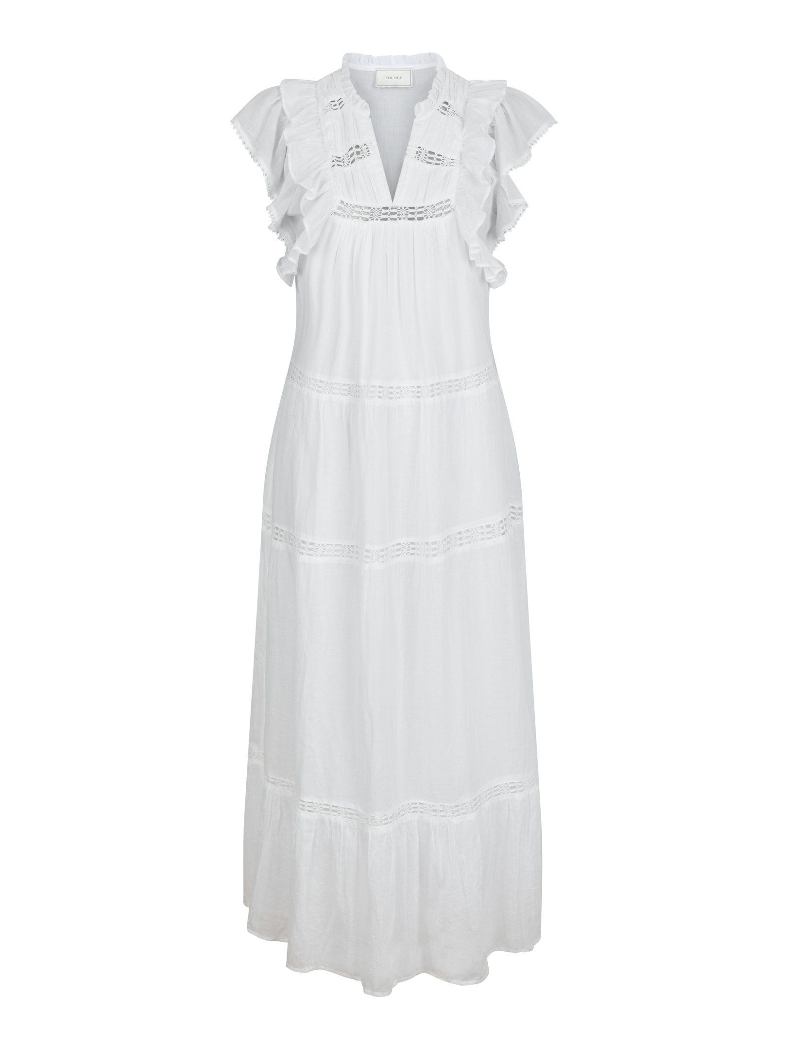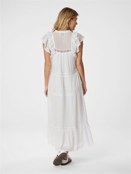 Smuk hvid bomuldskjole fra Neo Noir med feminine broderede bånd detaljer, lag og flæser. Øverst har den en lille v-udskæring og små flæseærmer. Modellen er 176 cm og bærer en størrelse 36.
