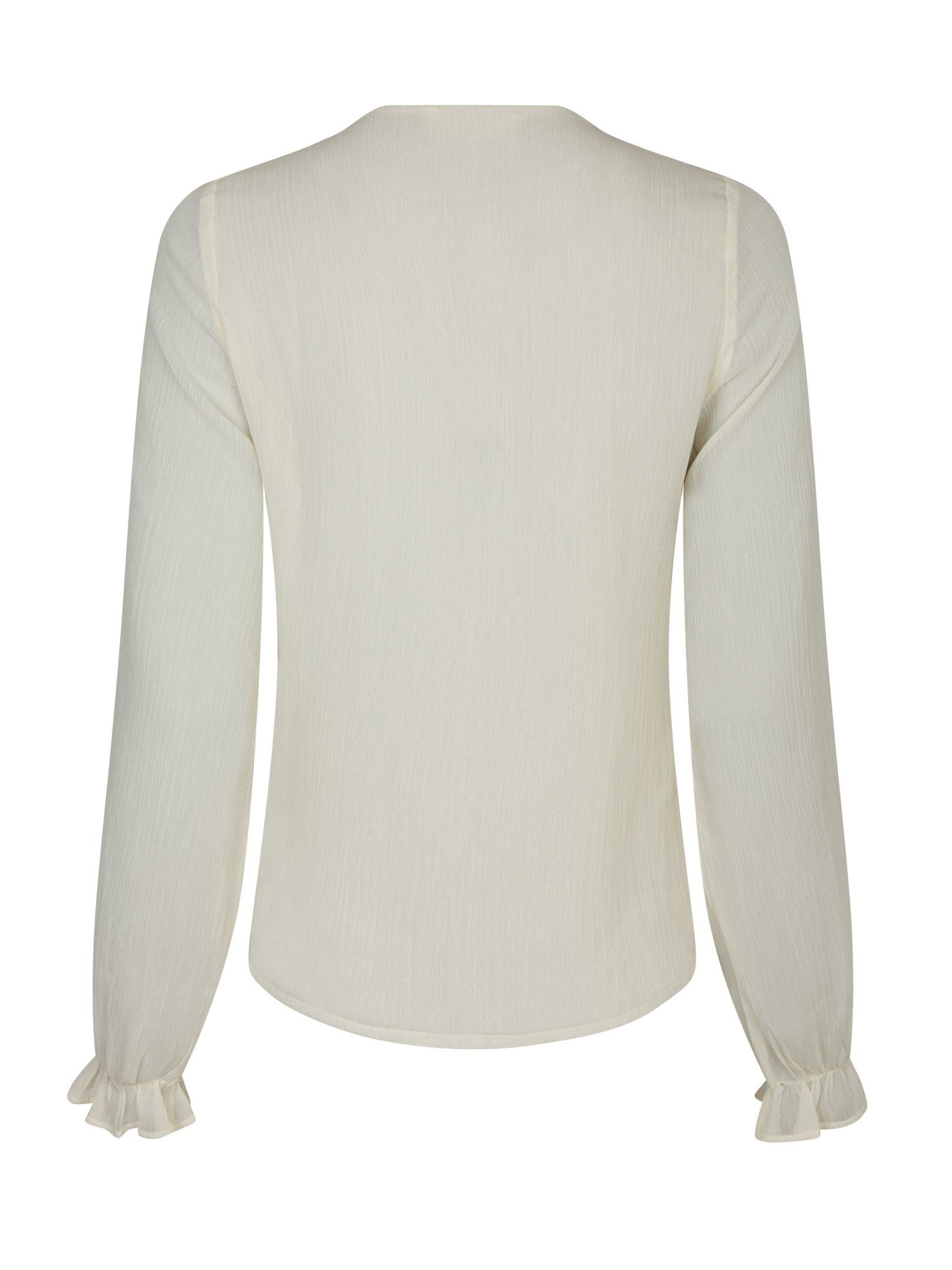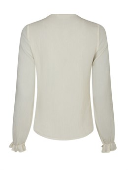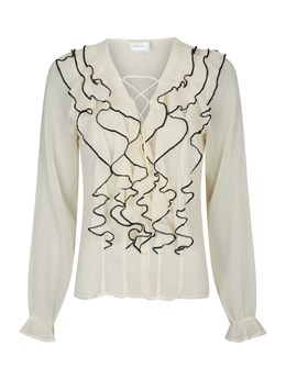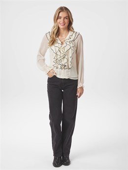Lækker cremefarvet bluse fra Neo Noir i blød chiffonkvalitet med sorte kontrastfarvede flæsedetaljer og snørebånd ved åbningen foran. Modellen er 176 høj og iført størrelse 36.