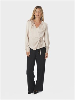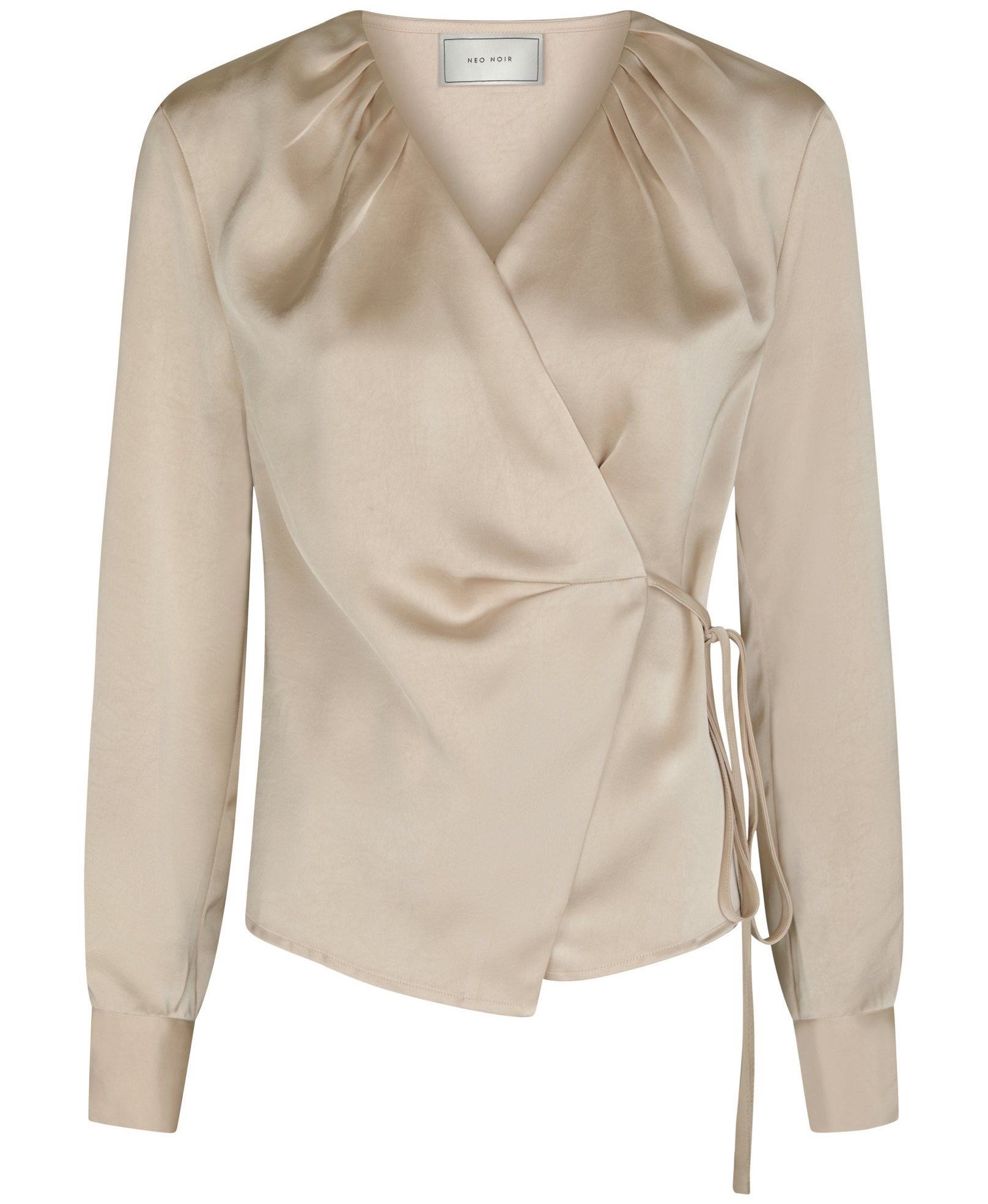 Smuk champagnefarvet satinbluse fra Neo Noir med slå om effekt og bindebånd i siden. Blusen har en virkelig flot pasform og et meget lækkert blødt materiale. Modellen er 176 cm høj og er iført en str. 36.