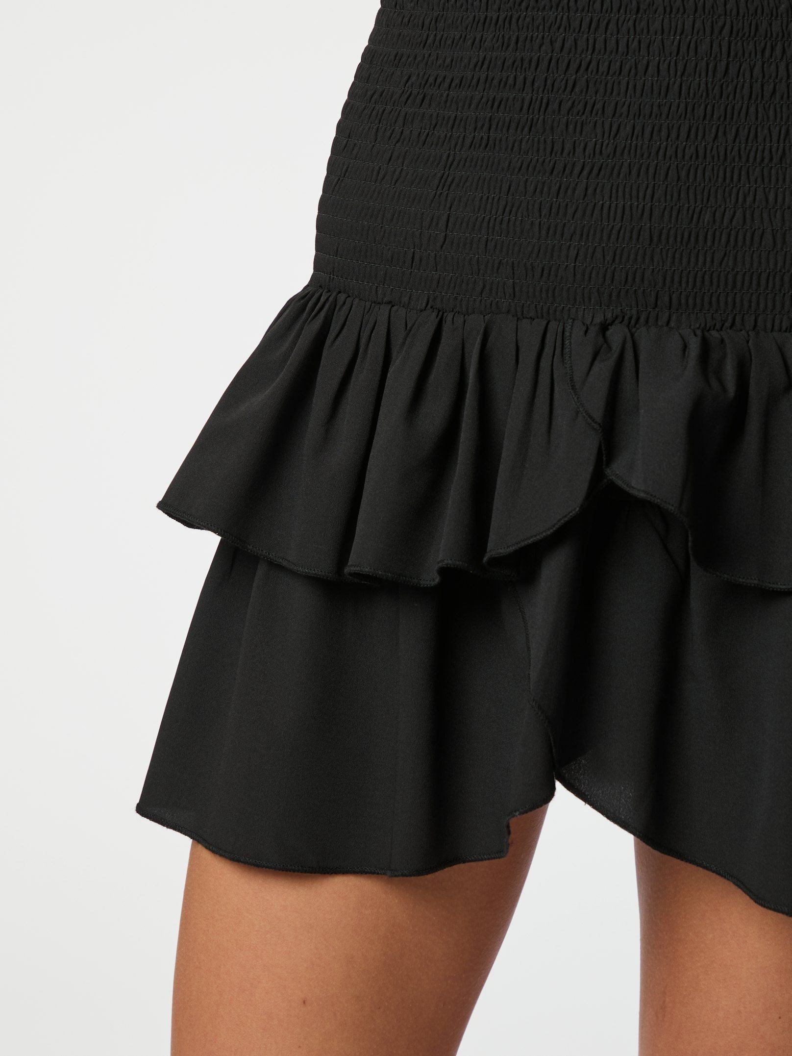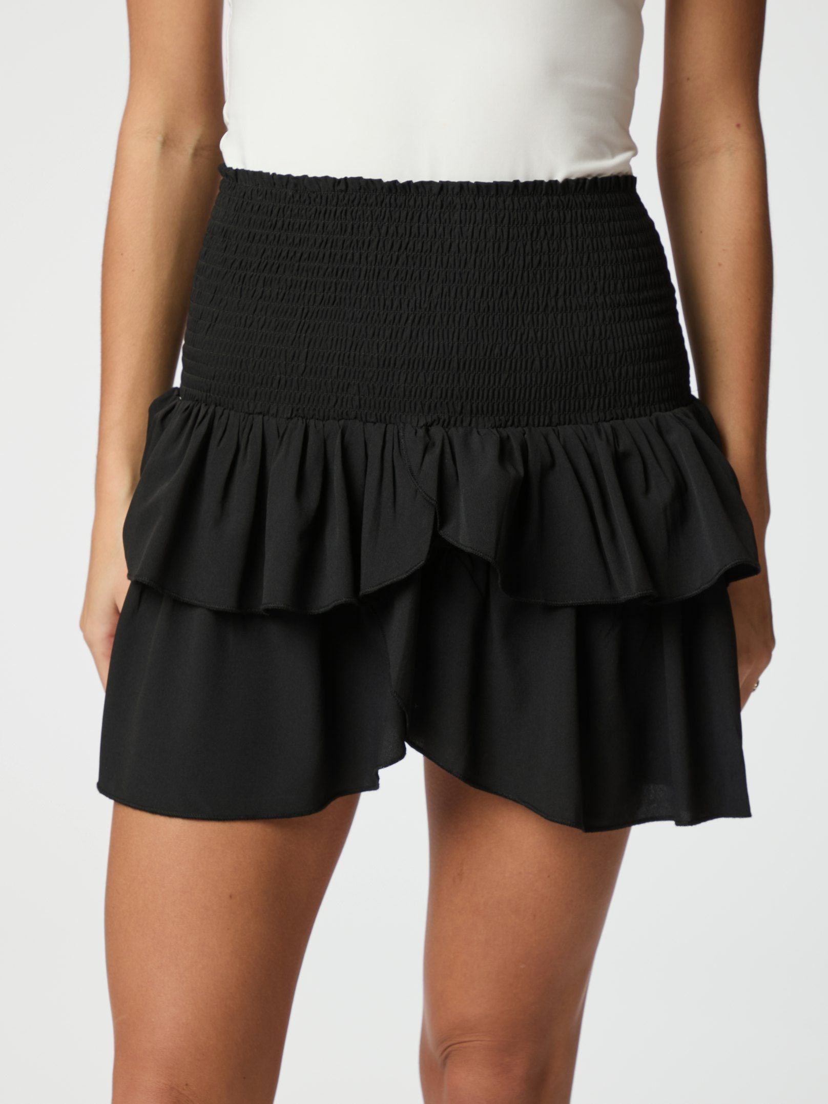 Kort sort flæsenederdel fra Neo Noir med smockelastik i taljen og to lag flæser med buet slids foran. Nederdelens pasform er super komfortabel og kan let styles til enhver overdel. Modellen er 176 cm høj og iført størrelse 36.