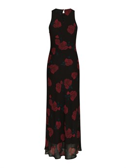 Smuk lang ærmeløs kjole fra Neo Noir i lækkert tætsiddende materiale med flot rødt roseprint på sort bund. Modellen er 176 cm og bærer en størrelse 36.