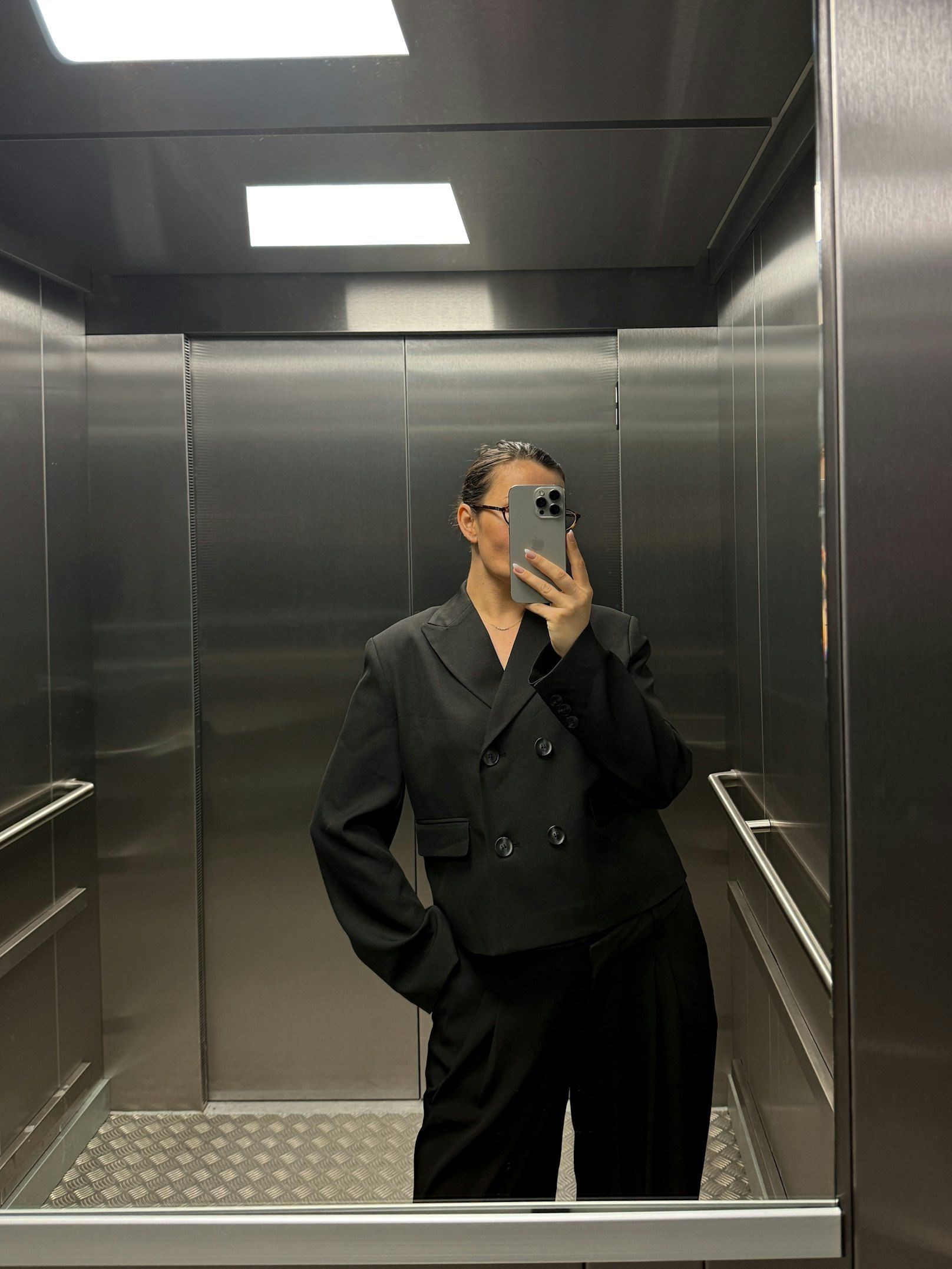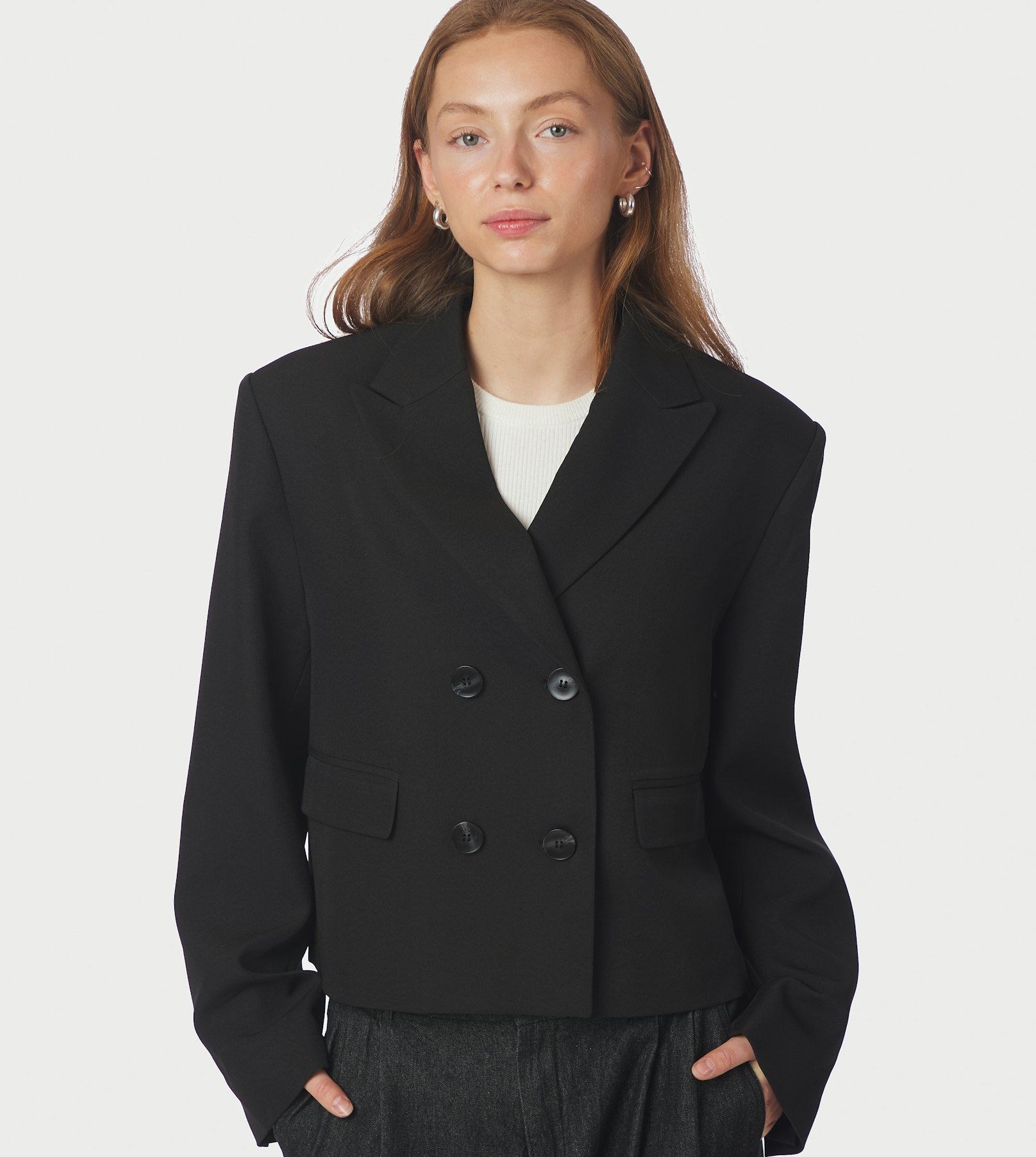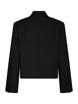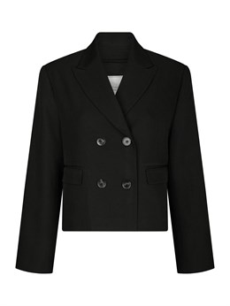 Flot sort blazer fra Neo Noir med dobbeltsidet lukning i virkelig flot struktureret stof med løs pasform og kort længde. Modellen er 176 cm og bærer en størrelse 36.