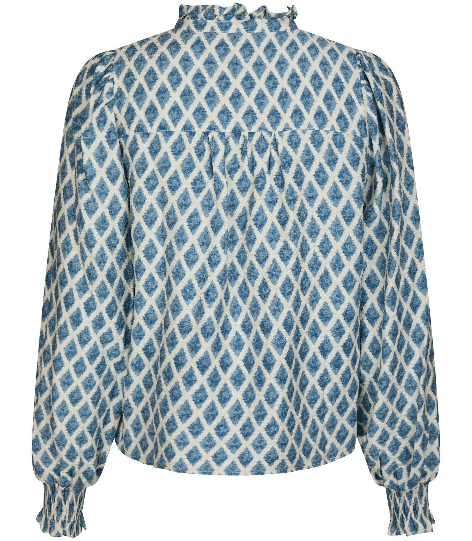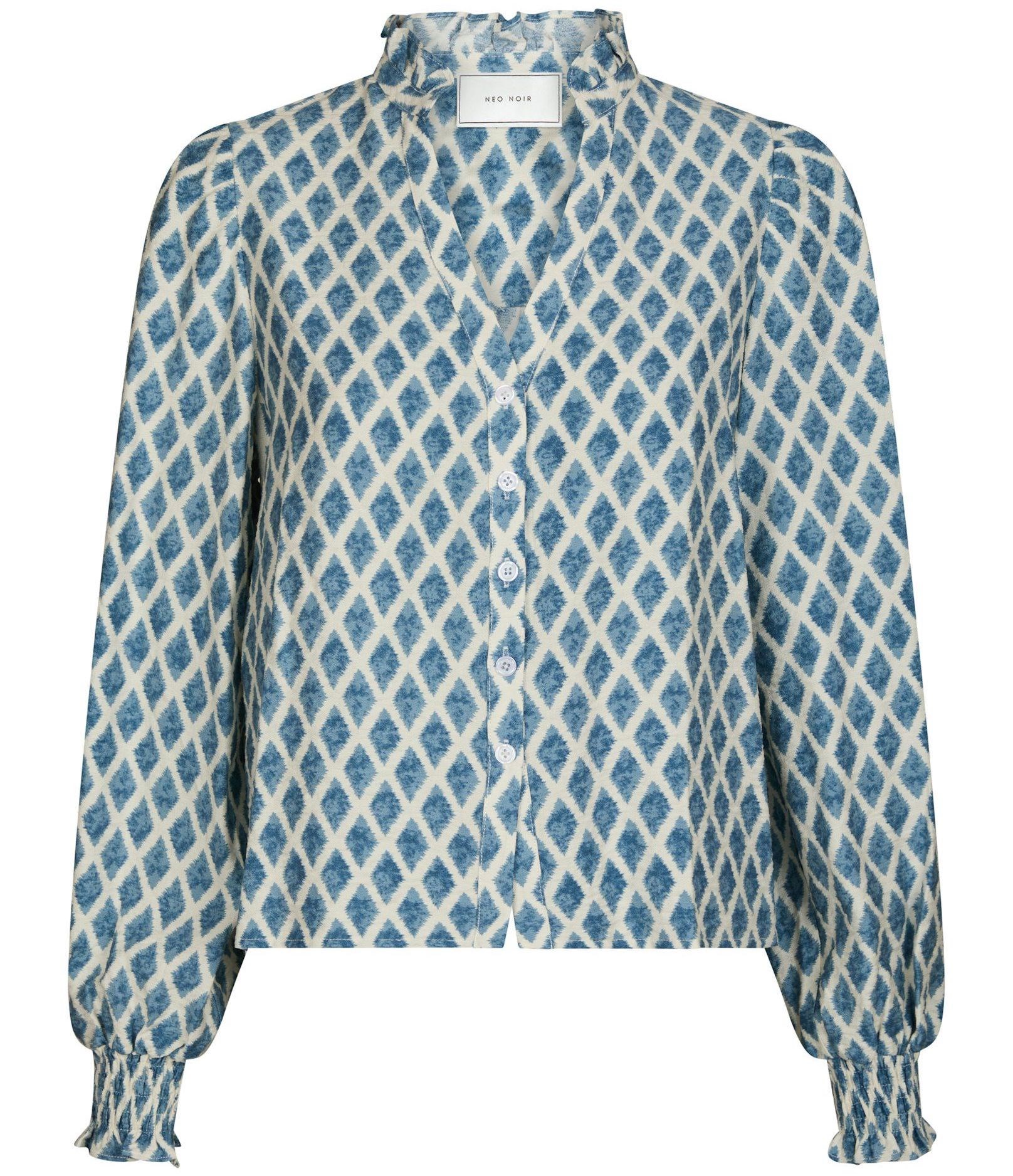 Fin bluse fra Neo Noir med blåt print og mange fine detaljer. Foran har den knappelukning og en smuk v-udskæring og flæsekant ved halsen. Ærmerne er lange og har en bred smock-elastik med flæsekant omkring håndleddet.