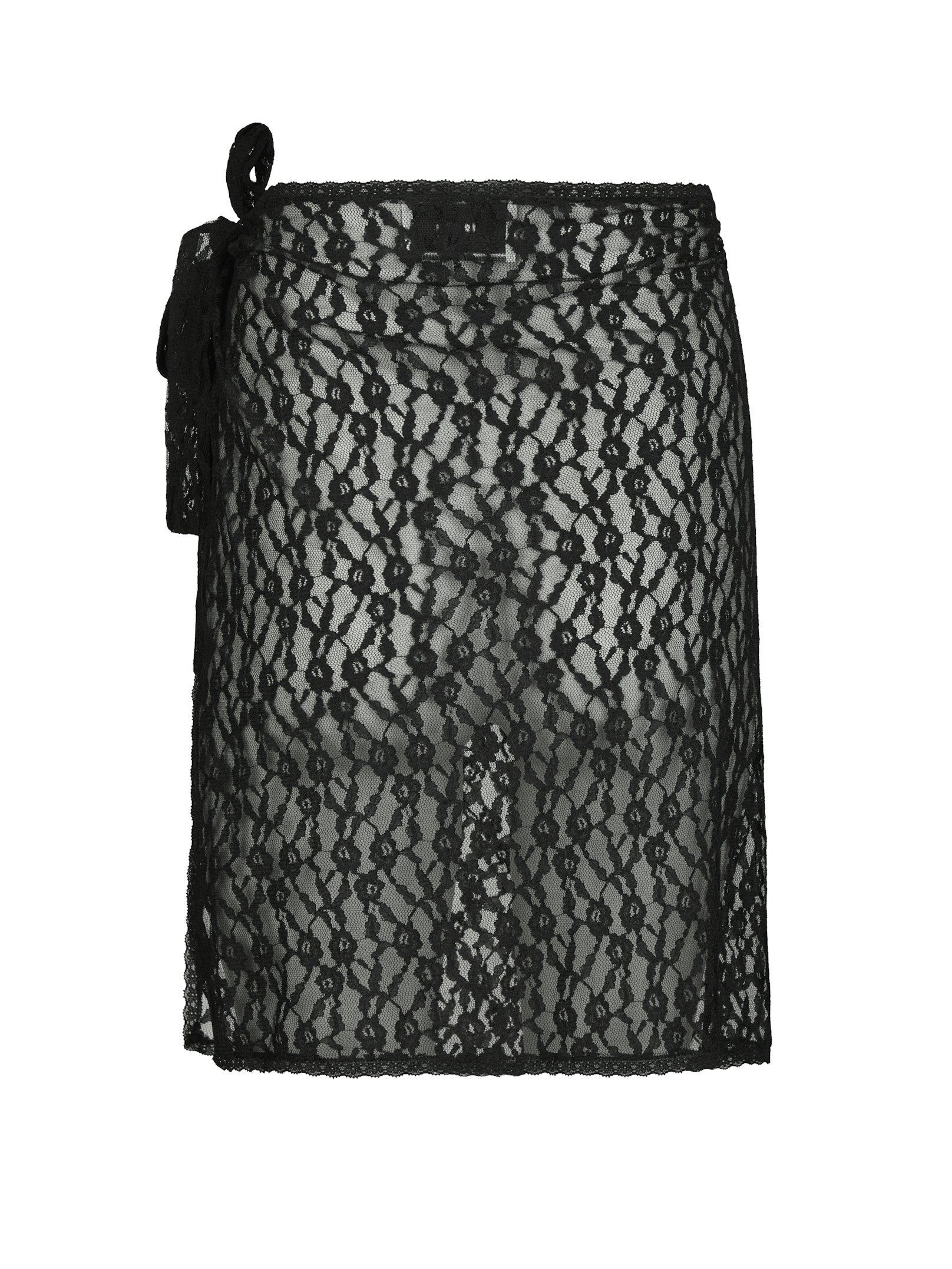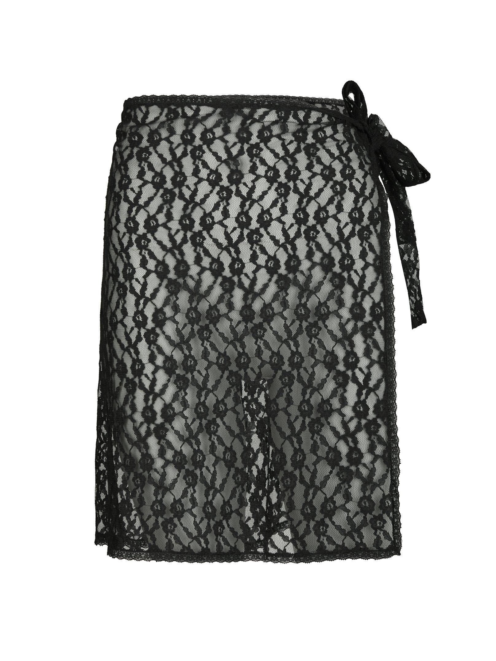 Kort slå-om nederdel fra Neo Noir i sort blondestof. Den bindes i siden og er virkelig cool over et par bukser eller jeans.. Modellen er 176 cm høj og bruger størrelse 36.