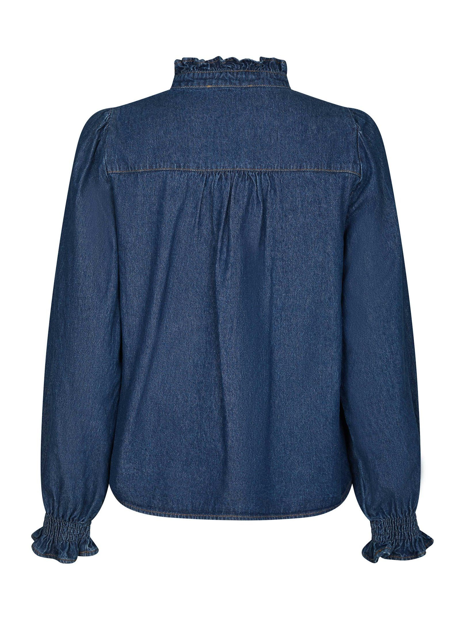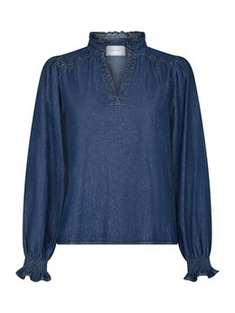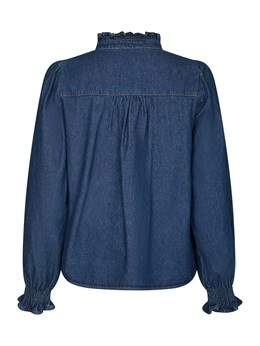 Fin mørkeblå denimbluse fra Neo Noir med løs pasform, v-udskæring og fine ærmer med smock og flæsekant ved håndleddet. Modellen på billedet er 176 cm og iført størrelse 36.