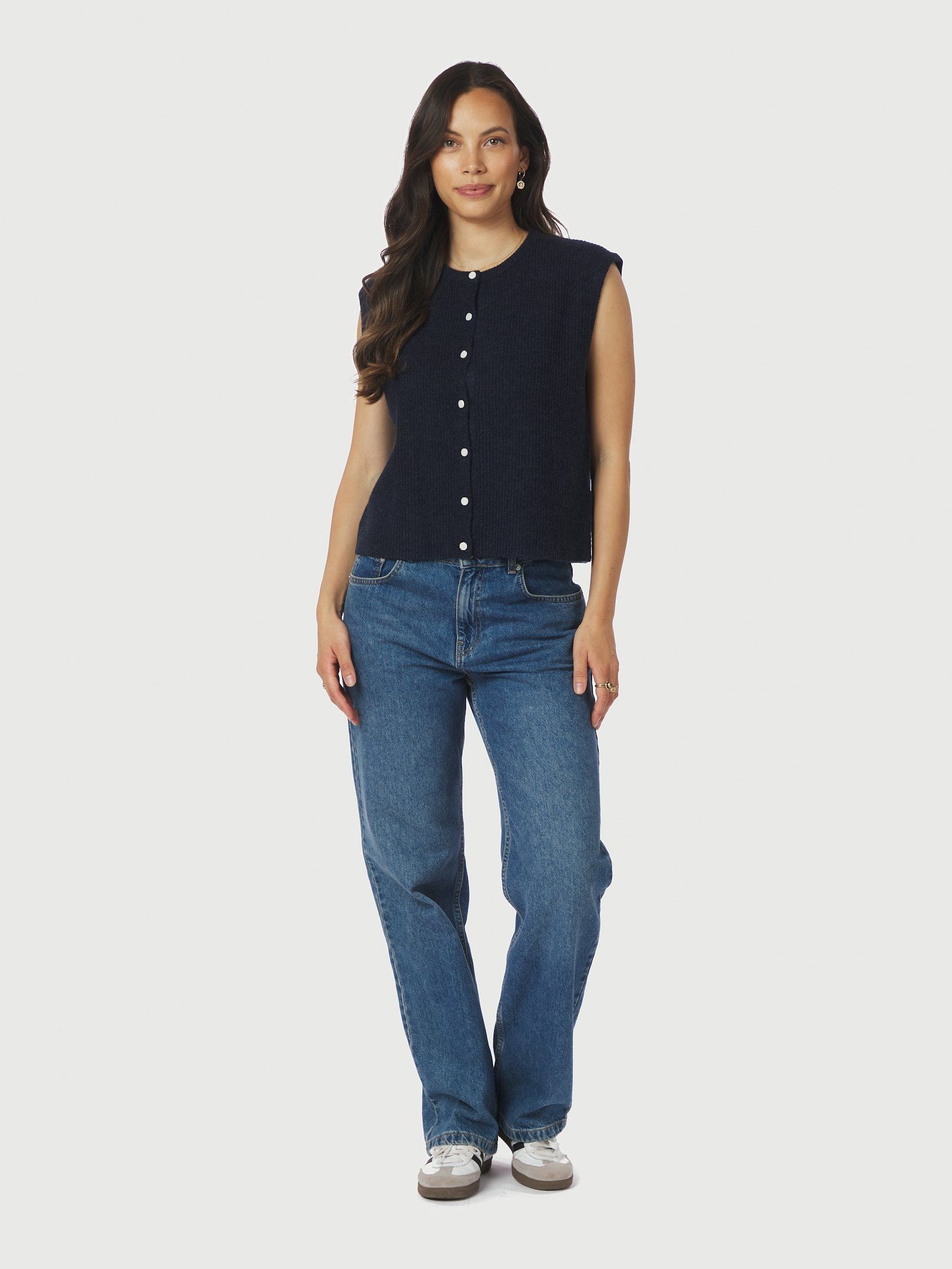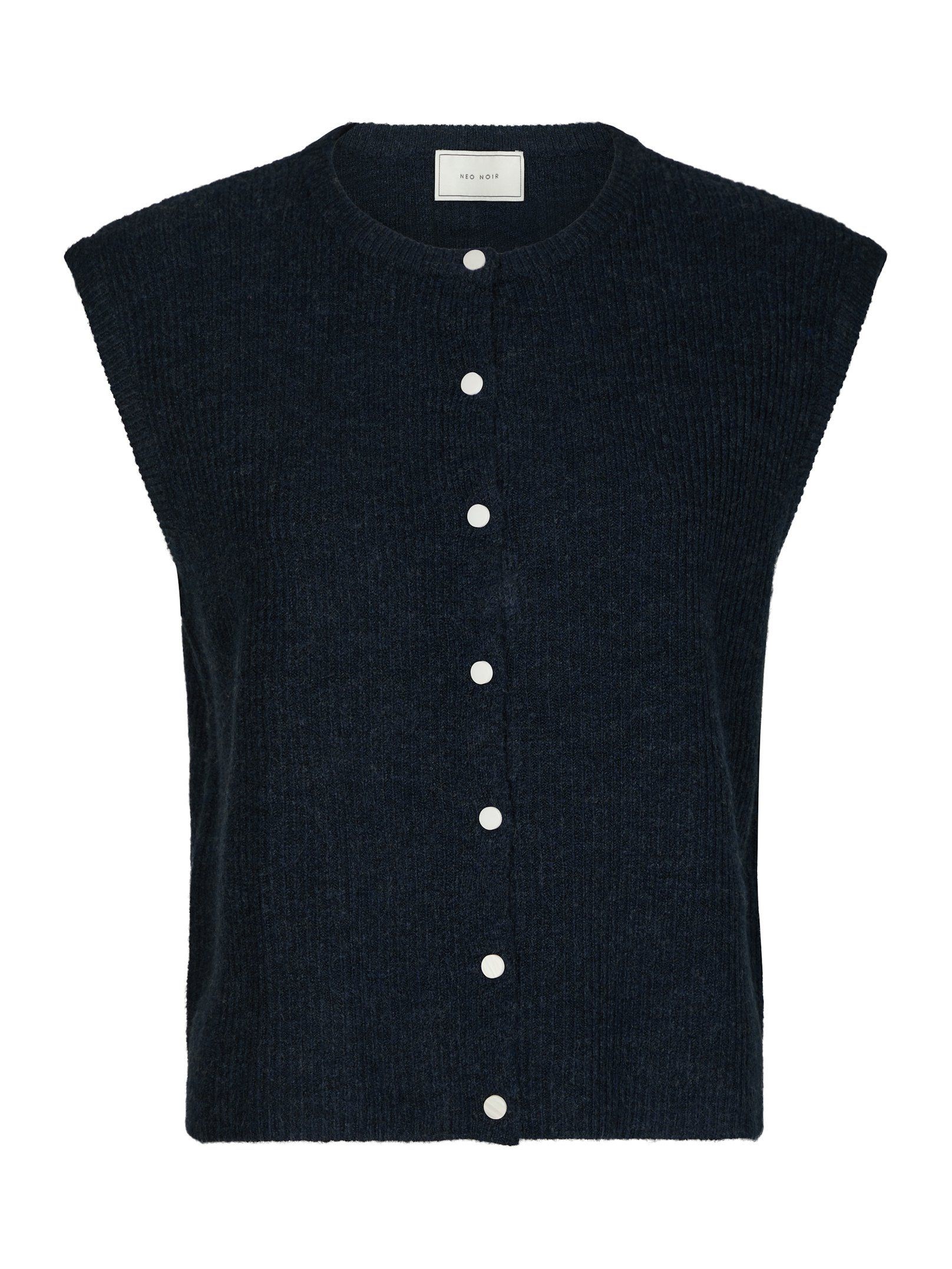 Fin strikket vest fra Neo Noir med boxy pasform og små knapper. Modellen er 176 cm høj og bruger størrelse 36.