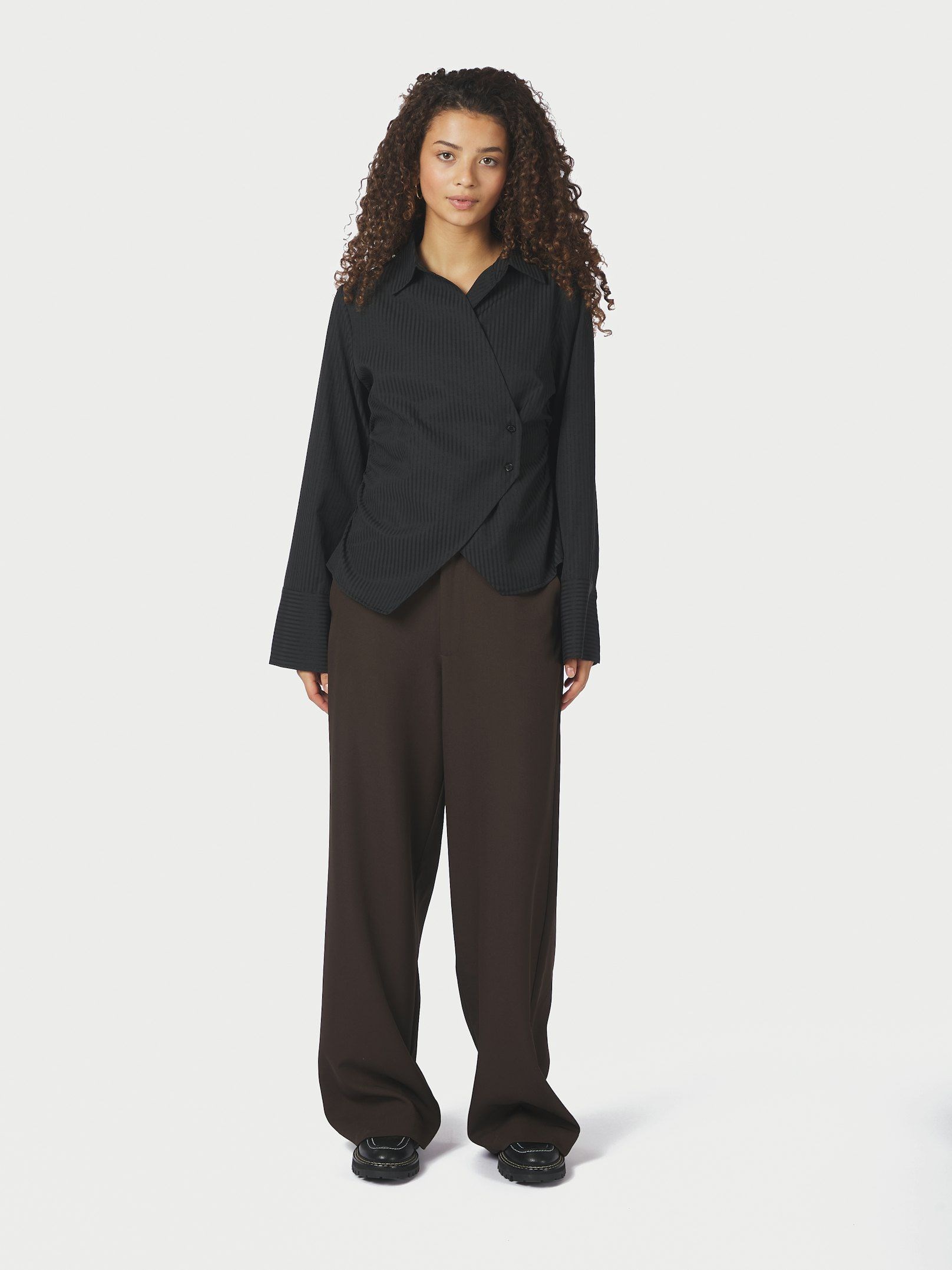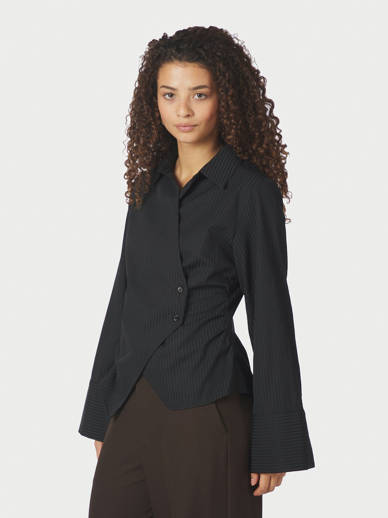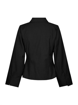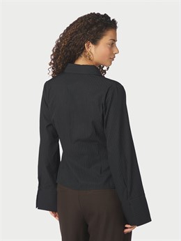 Fin skjorte fra Neo Noir med sorte tone i tone striber og en virkelig smuk facon med asymetrisk lukning og en flot fremhævning af taljen. Modellen på billedet er 176 cm og iført størrelse 36.