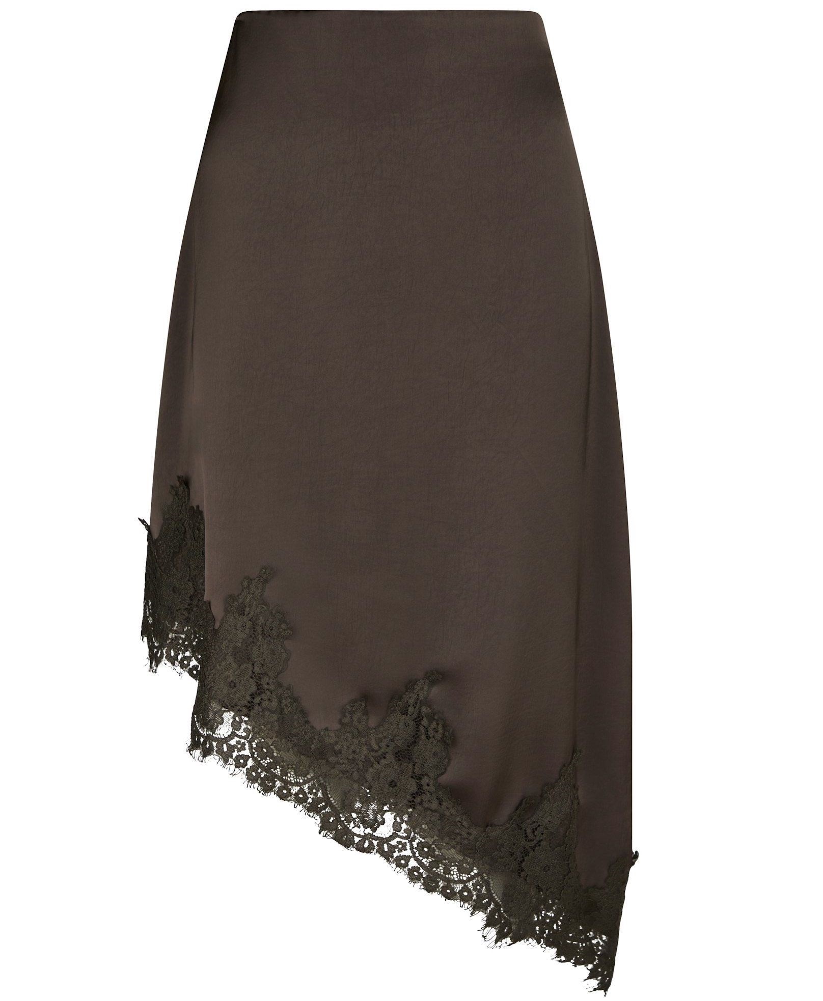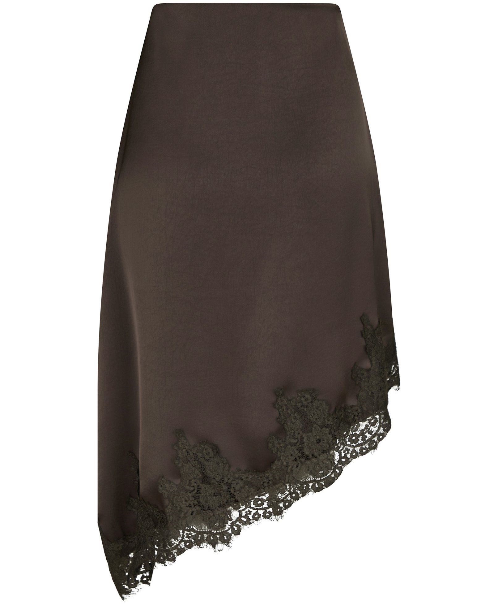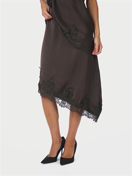Smuk asymetrisk nederdel fra Neo Noir i mørkebrun satinkvalitet med elastisk talje og dekorativ blondekant nederst. Modellen er 176 cm høj og bruger størrelse 36.