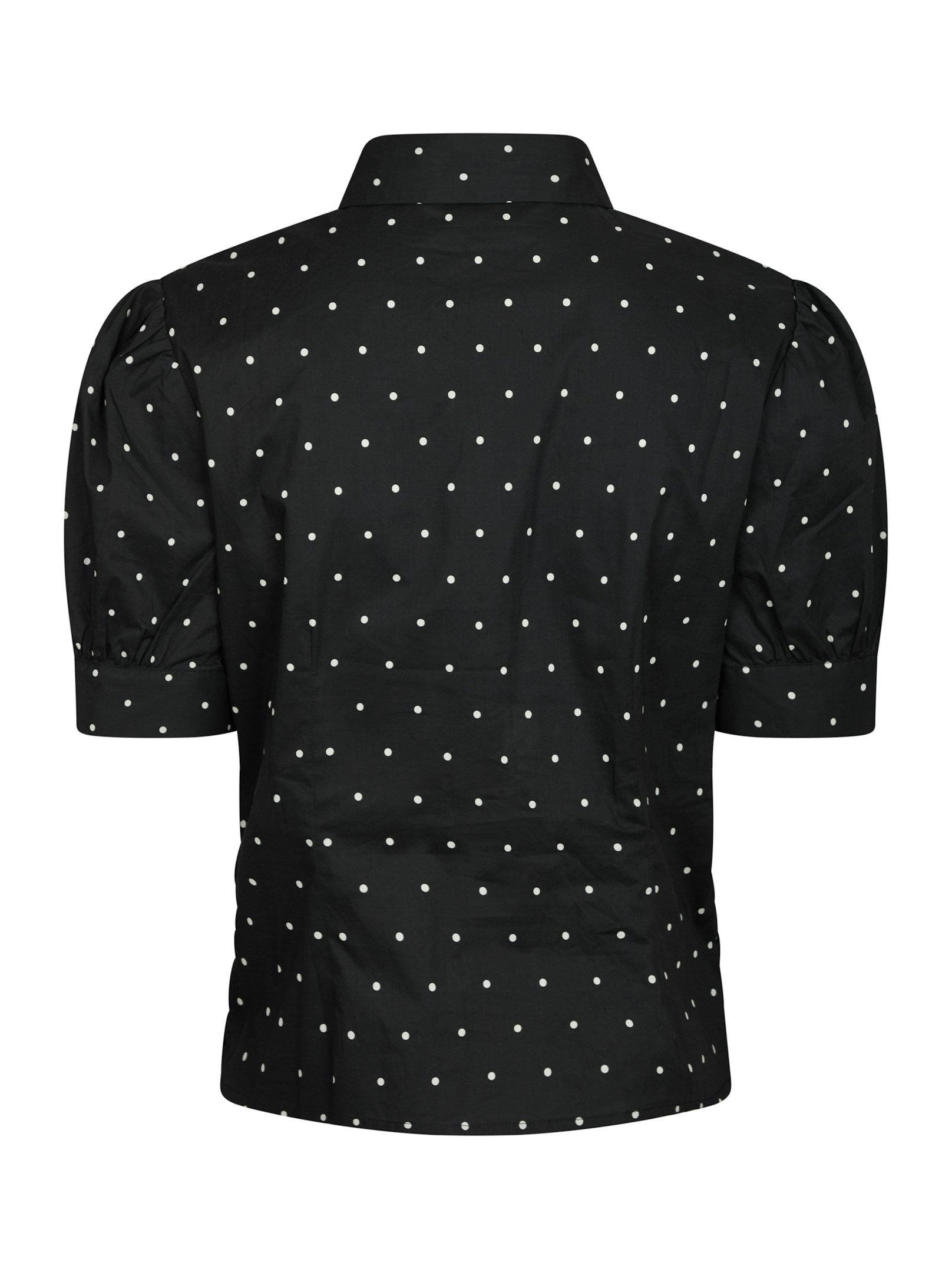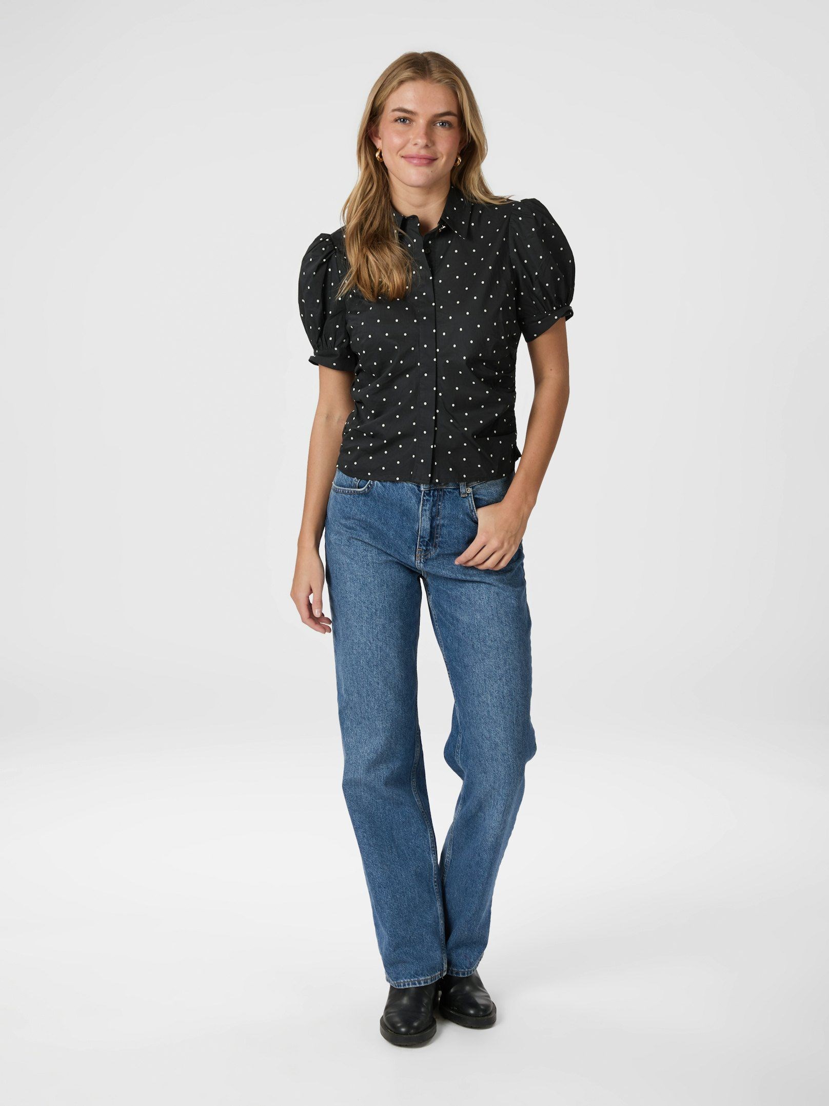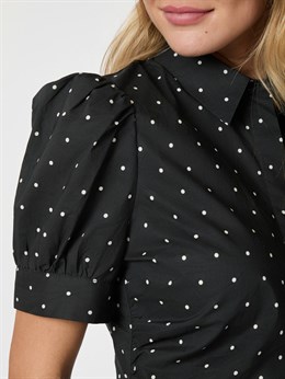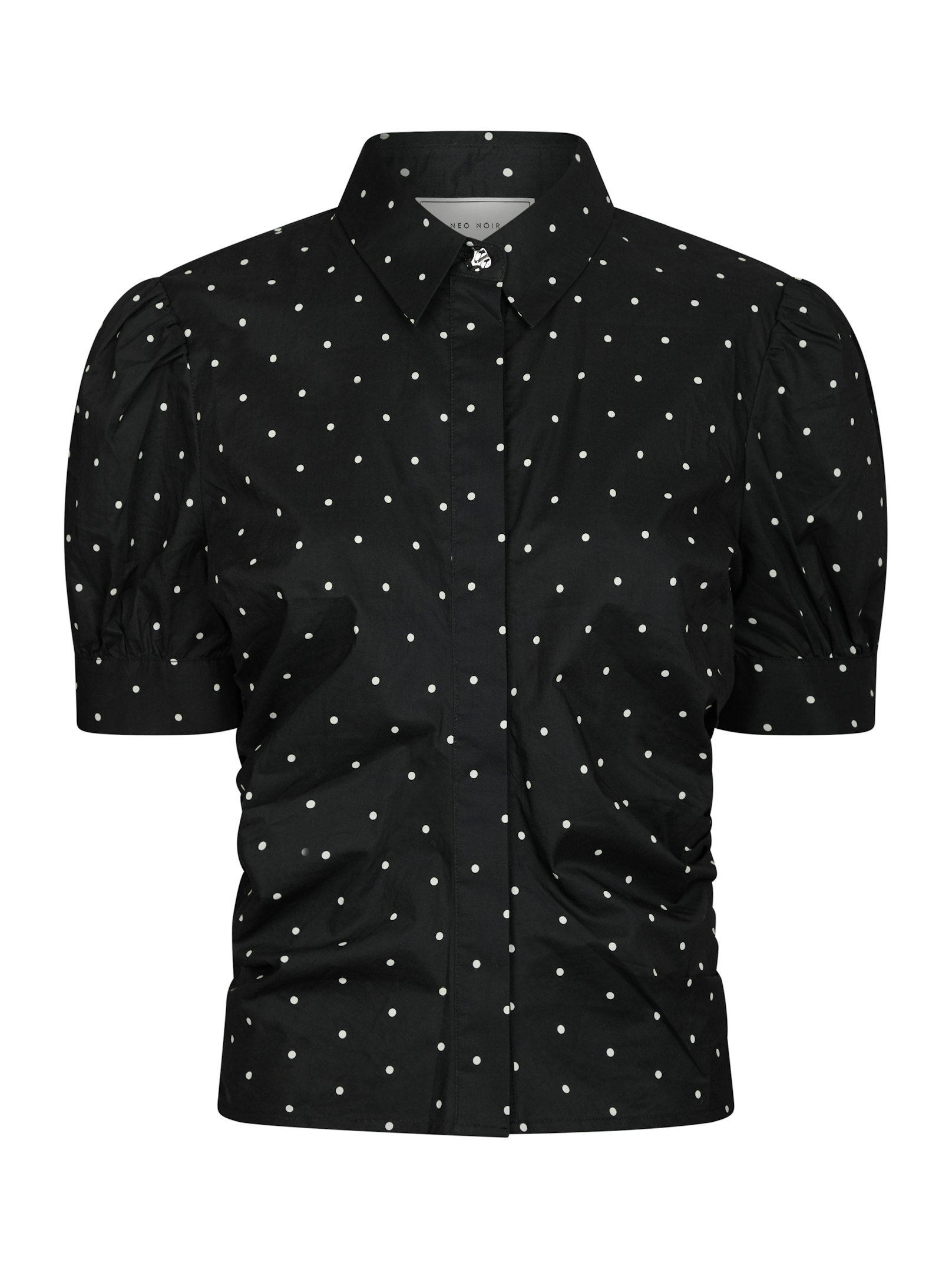Fin kortærmet skjorte fra Neo Noir med hvide prikker på sort bund. Skjorten har en skøn pasform med pufærmer og en dekorativ knap ved kraven. Modellen er 176 høj og iført størrelse 36.