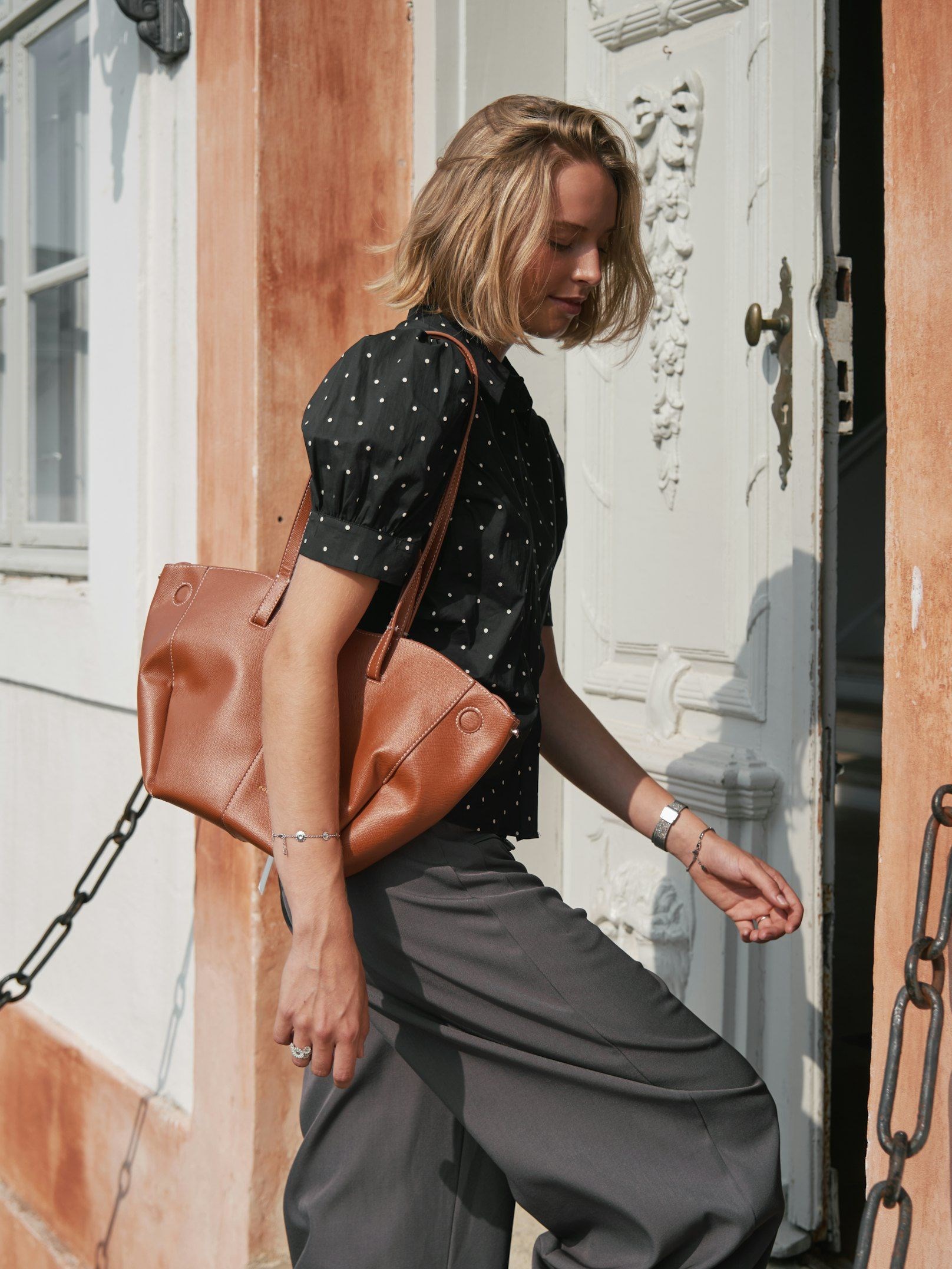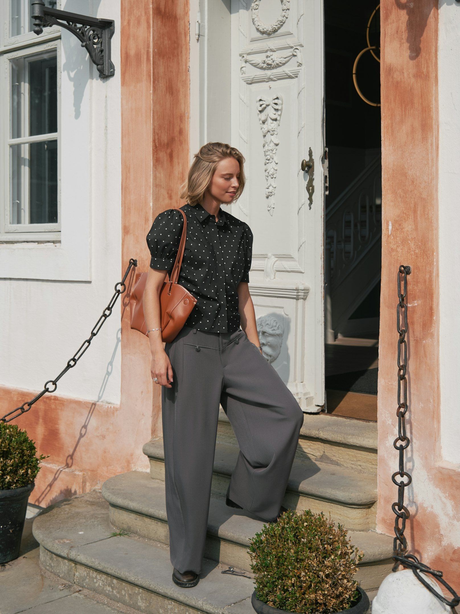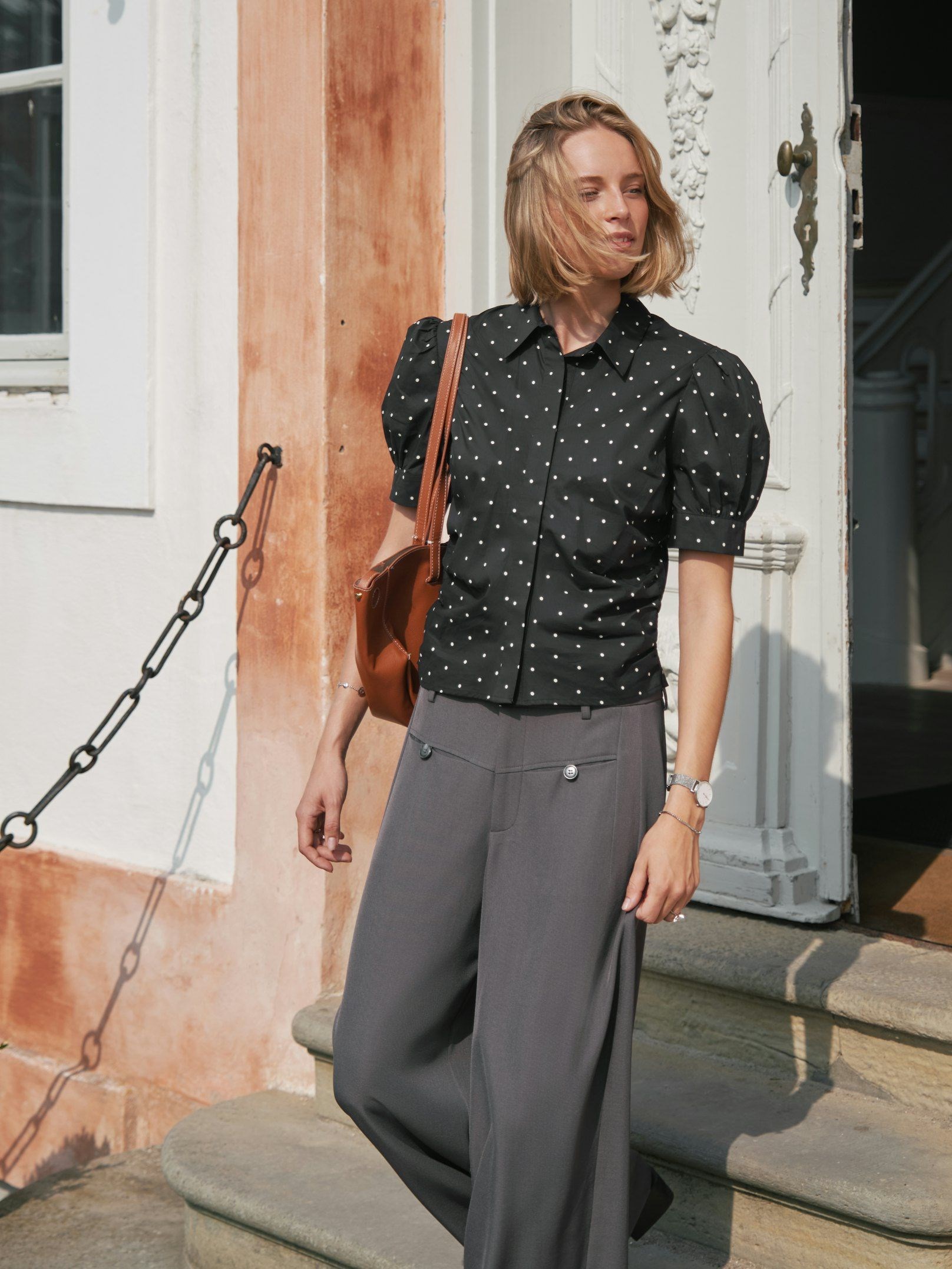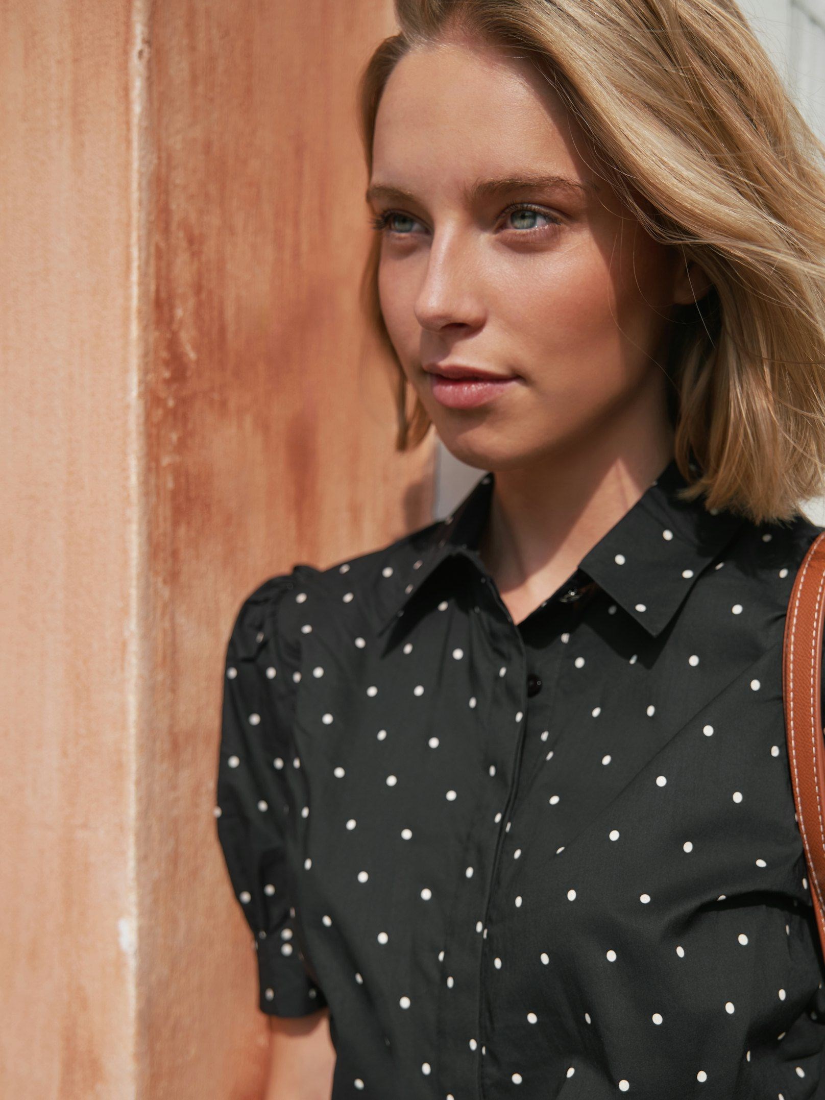 Fin kortærmet skjorte fra Neo Noir med hvide prikker på sort bund. Skjorten har en skøn pasform med pufærmer og en dekorativ knap ved kraven. Modellen er 176 høj og iført størrelse 36.