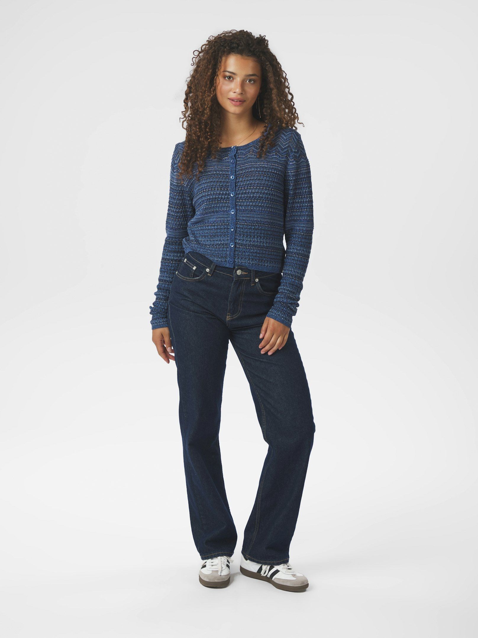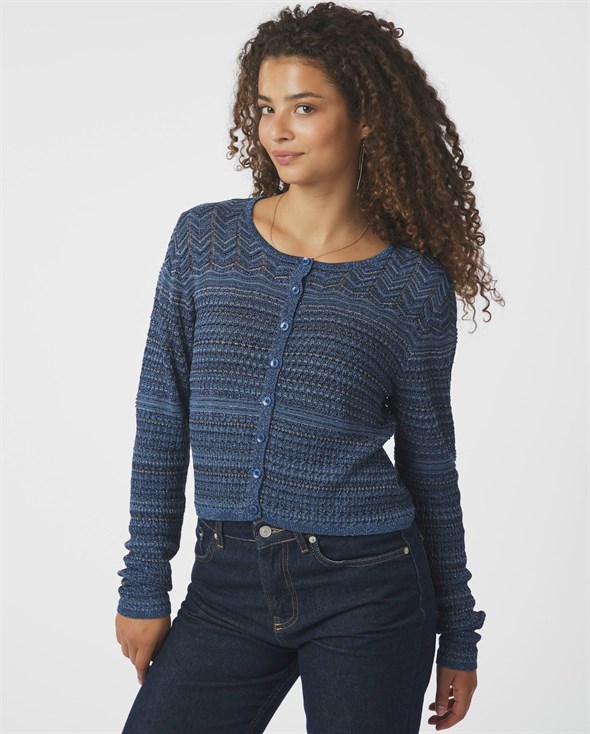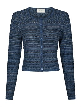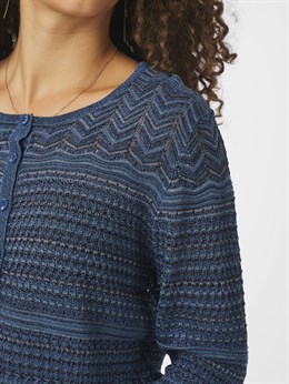 Fin cardigan fra Neo Noir i flot viskoseblanding med glitter og mønster i smukke blå nuancer. Cardiganen har rund hals og knappelukning. Modellen på billedet er 176 cm høj og iført en str. 36.