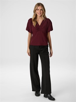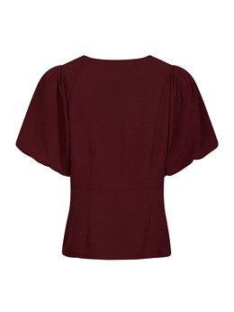Fin vinrød bluse fra Neo Noir med en meget smuk halsudskæring og detalje på fronten. Materialet er blødt og med en fin struktur. Pasformen er tætsiddende og figursyet med skjult lynlåslukning og store pufærmer. Modellen er 176 høj og iført størrelse 36.