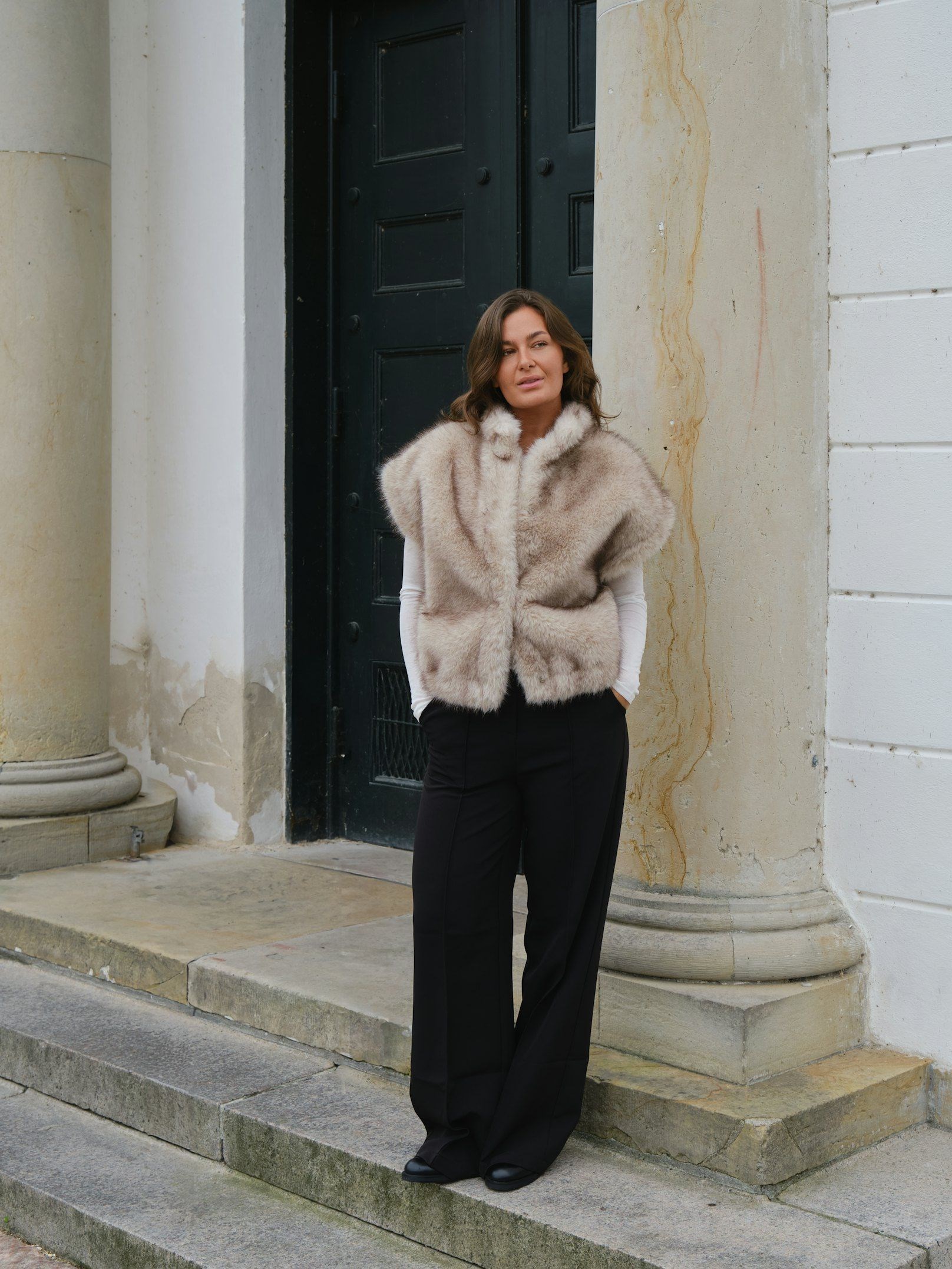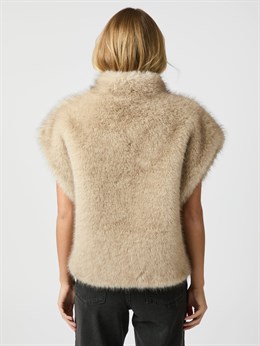 Mega flot vest fra Neo Noir i beige faux fur materiale med trykknapper. Modellen er 176 høj og iført størrelse 36.