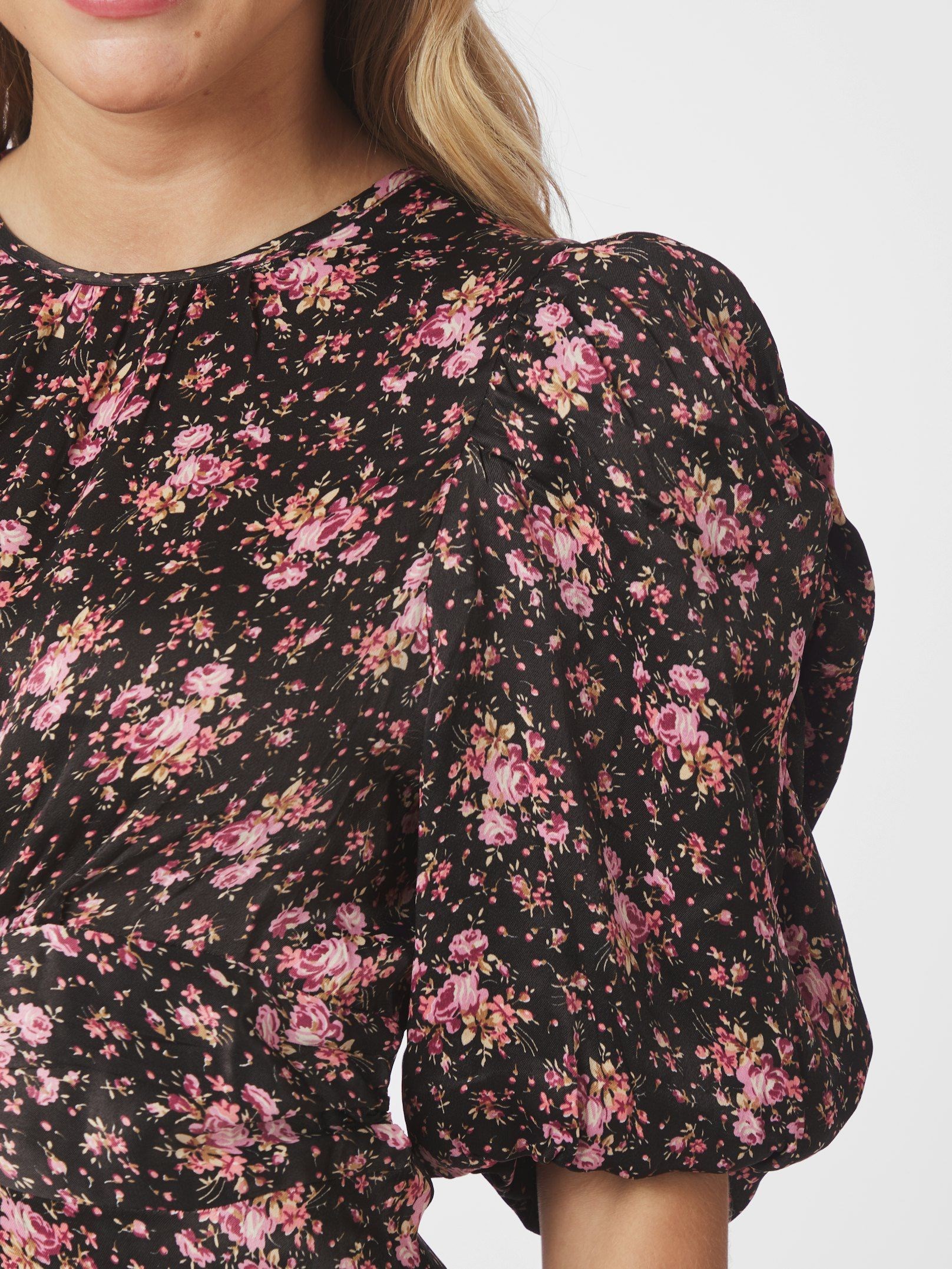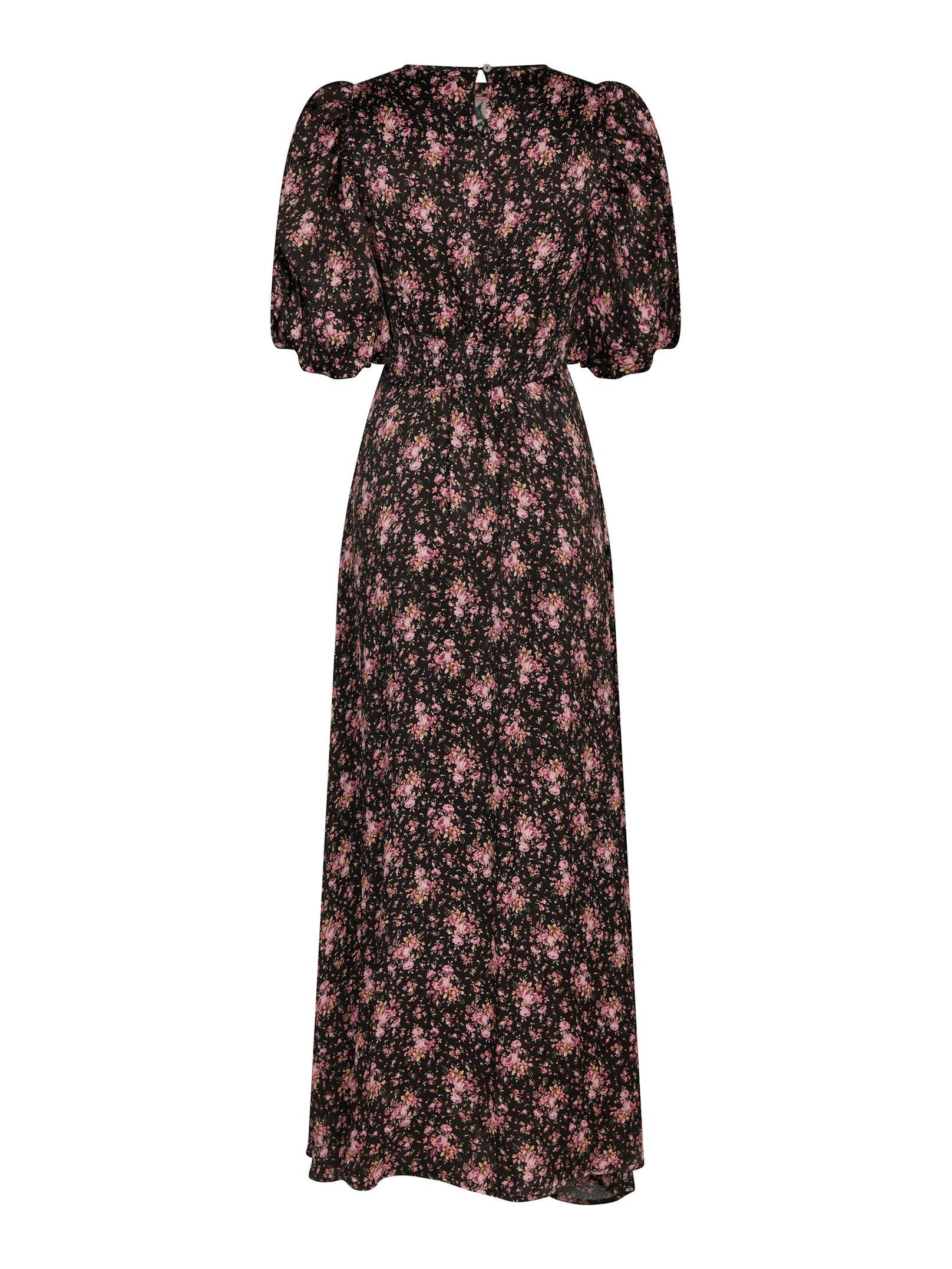 Elegant og feminin lang kjole fra Neo Noir. Kjolen har trekvartlange ærmer med rynk og et smukt blomsterprint på sort bund. Den har rund halsudskæring og i taljen fremhæves rigtig flot med smock-elastik i ryggen. Modellen er 176 cm og bærer en størrelse 36.