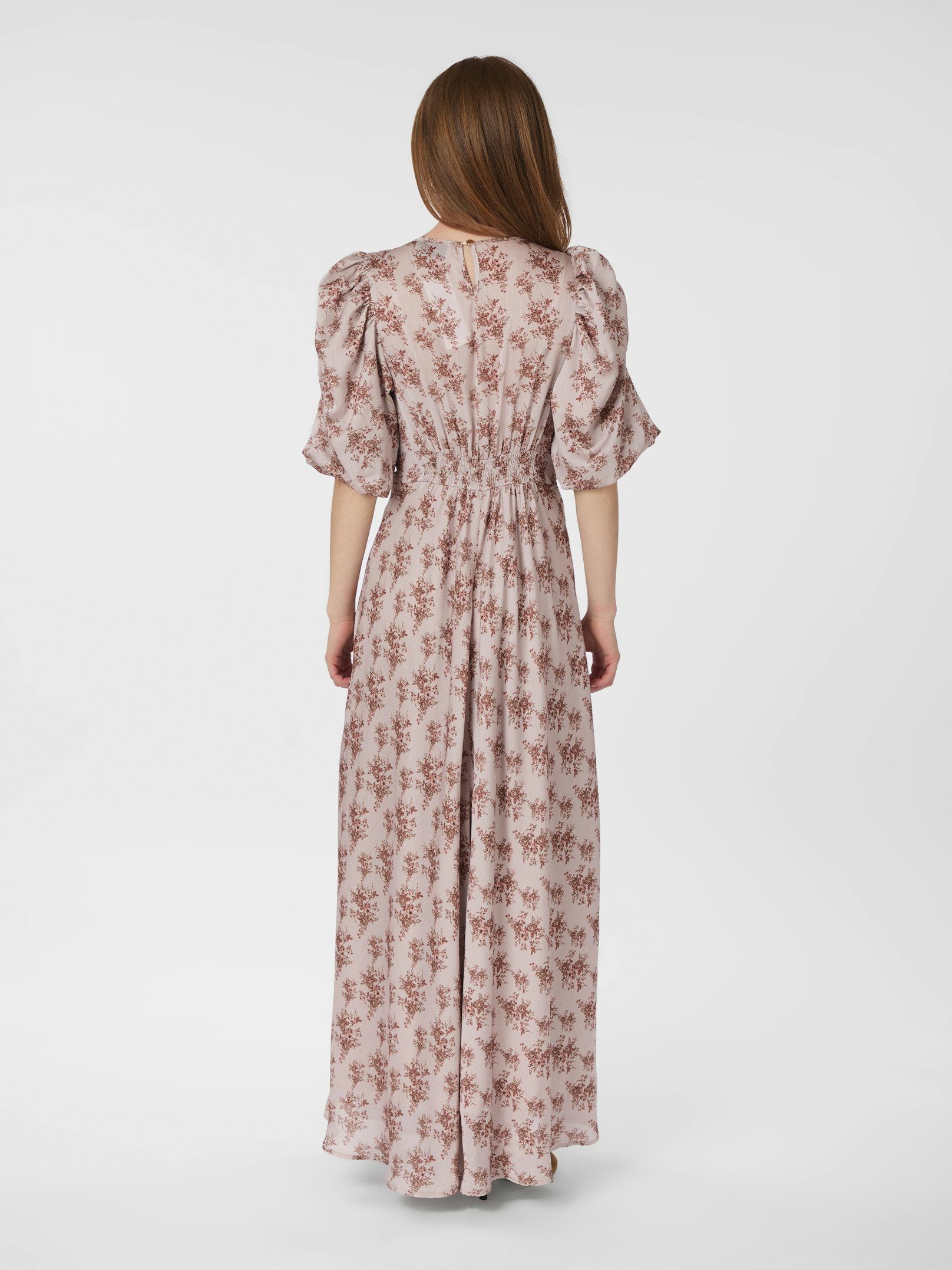 Elegant og feminin lang kjole fra Neo Noir. Kjolen har trekvartlange ærmer med rynk og et smukt blomsterprint på rosa bund. Den har rund halsudskæring og i taljen fremhæves rigtig flot med smock-elastik i ryggen. Modellen er 176 cm og bærer en størrelse 36.