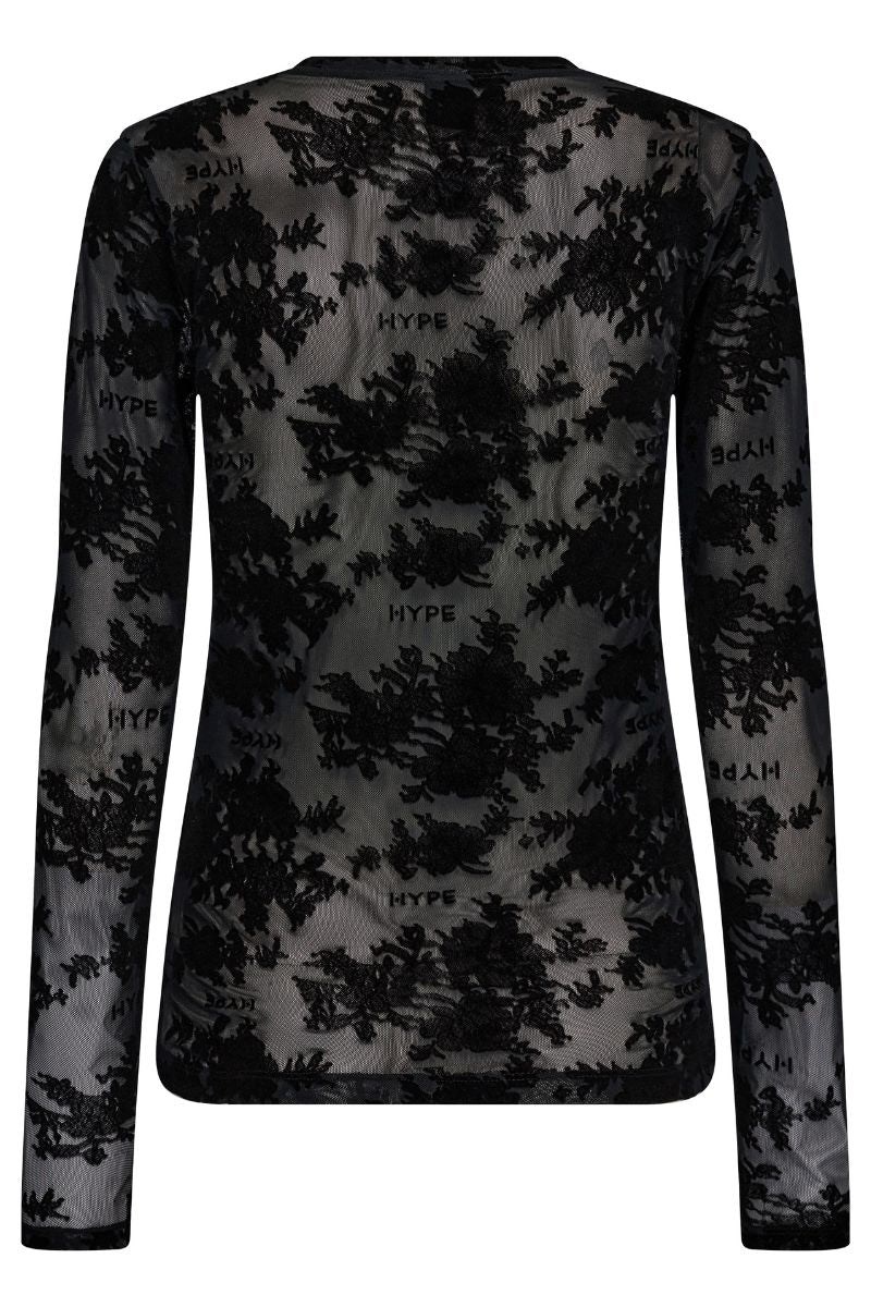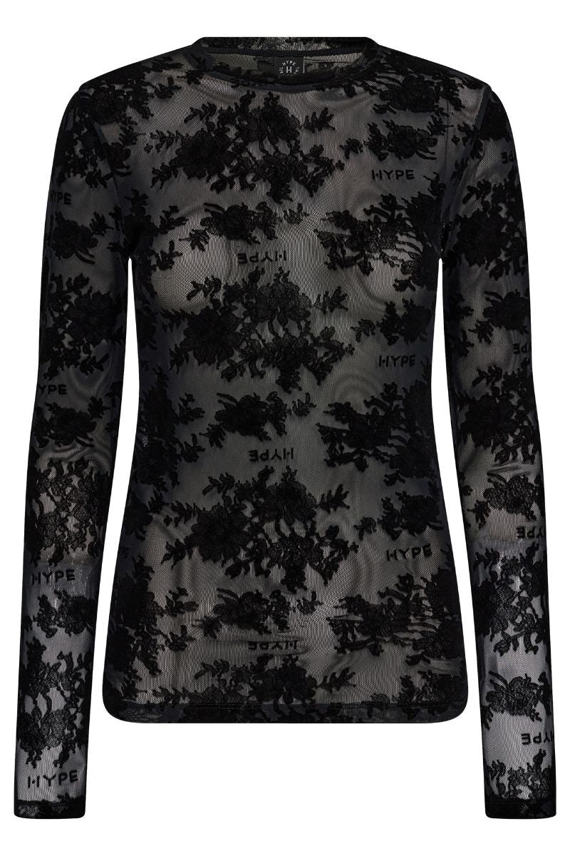 Fin sort bluse fra Hype the Detail i blød blondekvalitet, der er let transparent. Blusens pasform er tætsiddende og behagelig at have på, da kvaliteten er superblød. Den har lange ærmer og rund hals.