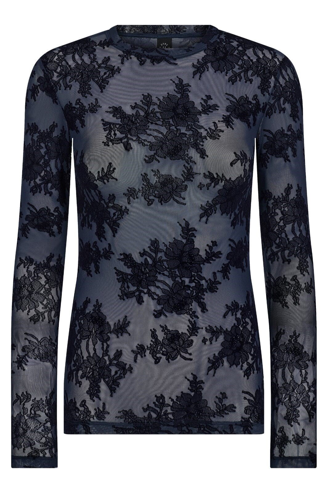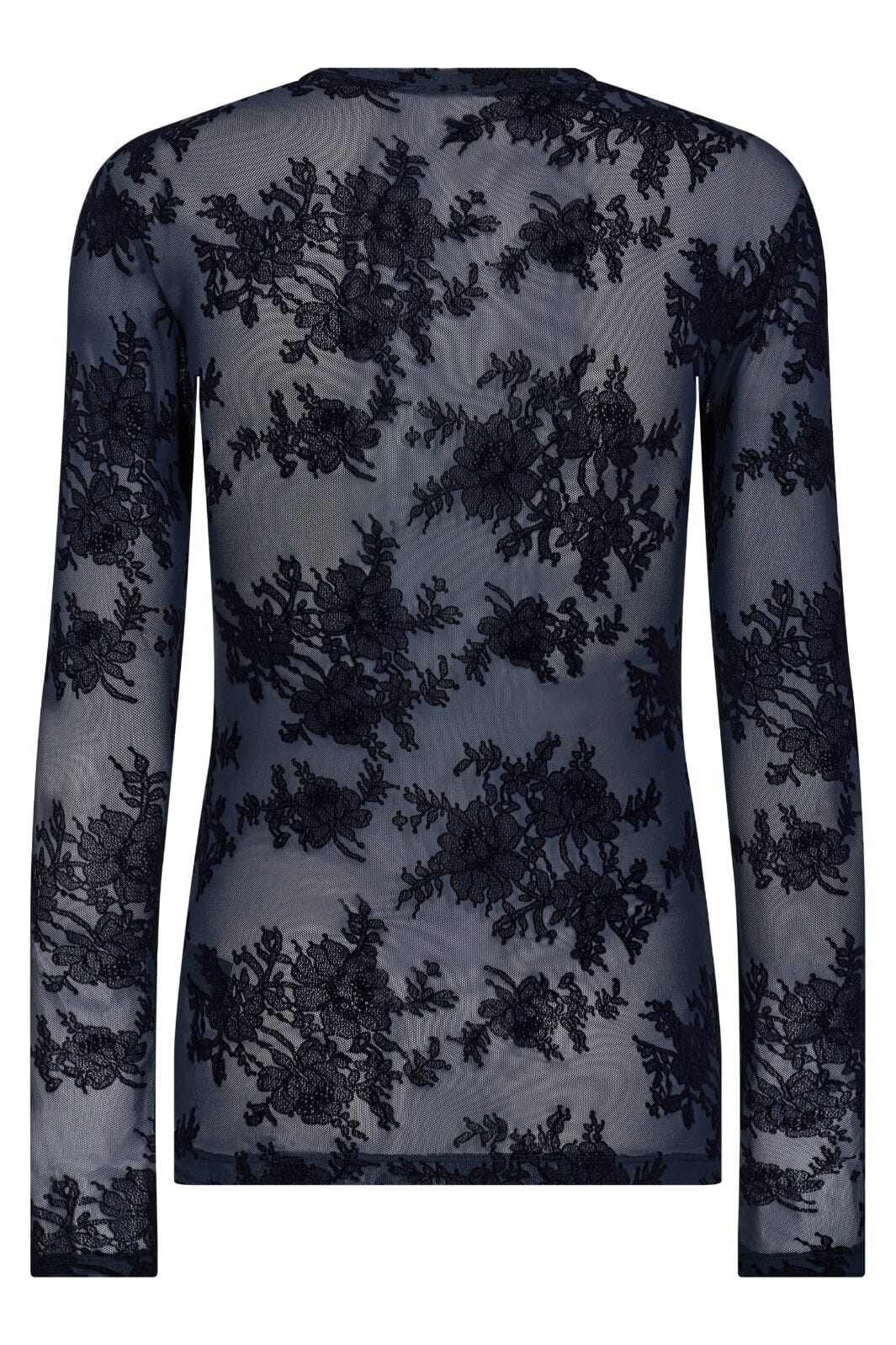 Fin mørkeblå bluse fra Hype the Detail i blød blondekvalitet, der er let transparent. Blusens pasform er tætsiddende og behagelig at have på, da kvaliteten er superblød. Den har lange ærmer og rund hals.