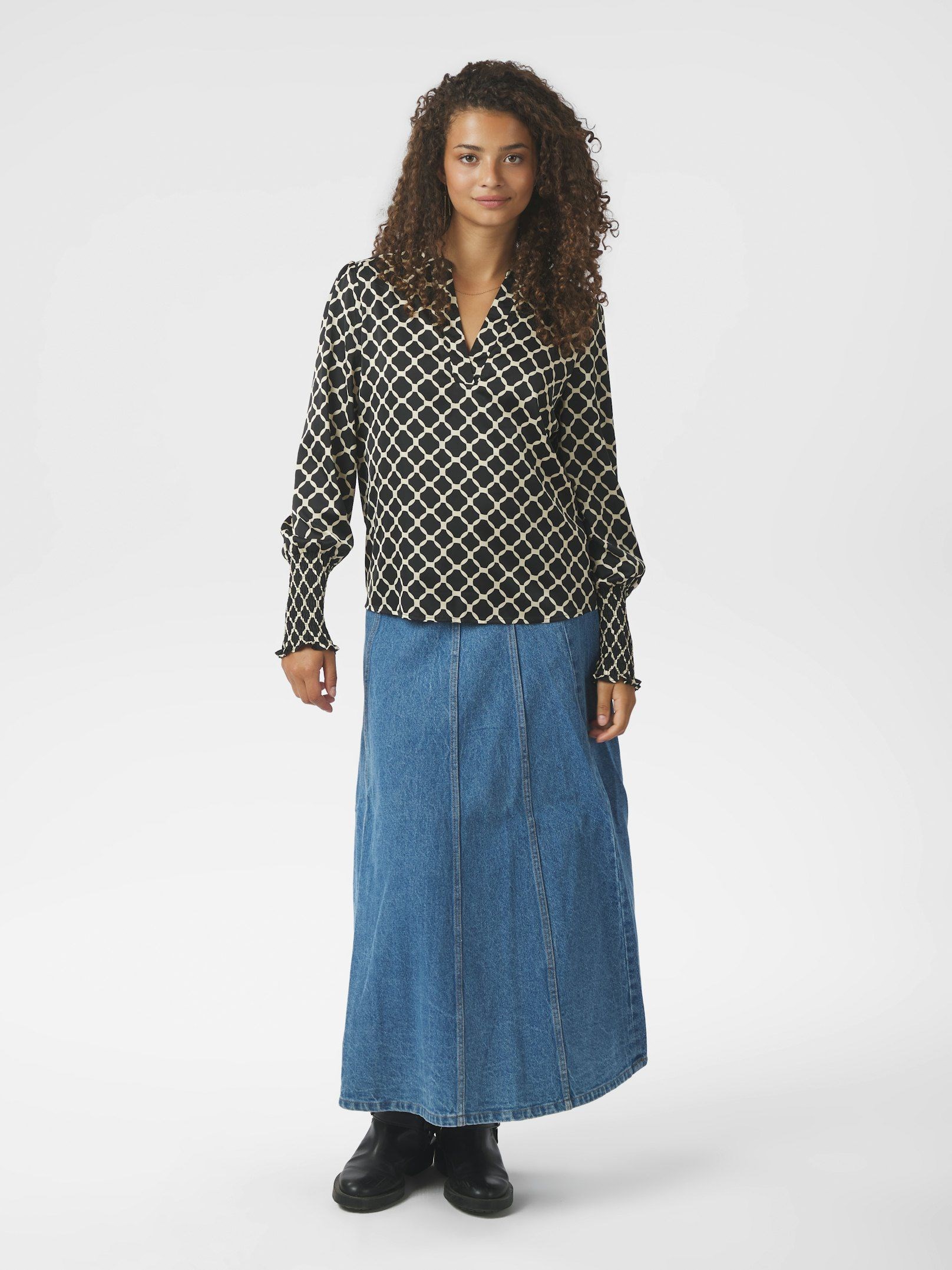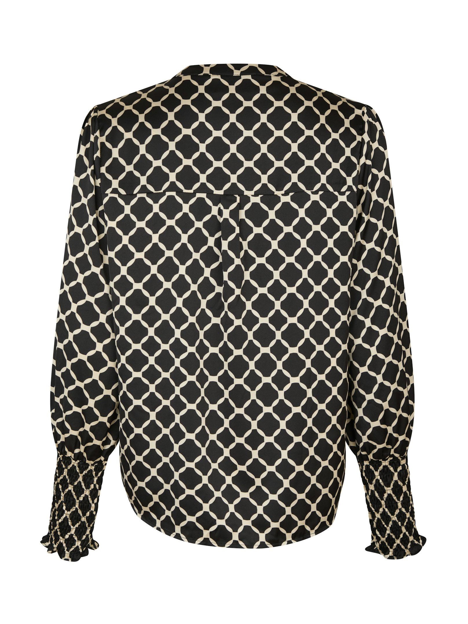 Smuk bluse fra Neo Noir i blød kvalitet med grafisk print. Blusen har en fin v-udskæring ved halsen samt lange ærmer med et bredt smock-stykke og flæsekant nederst. Modellen på billedet er 176 cm og iført størrelse 36.