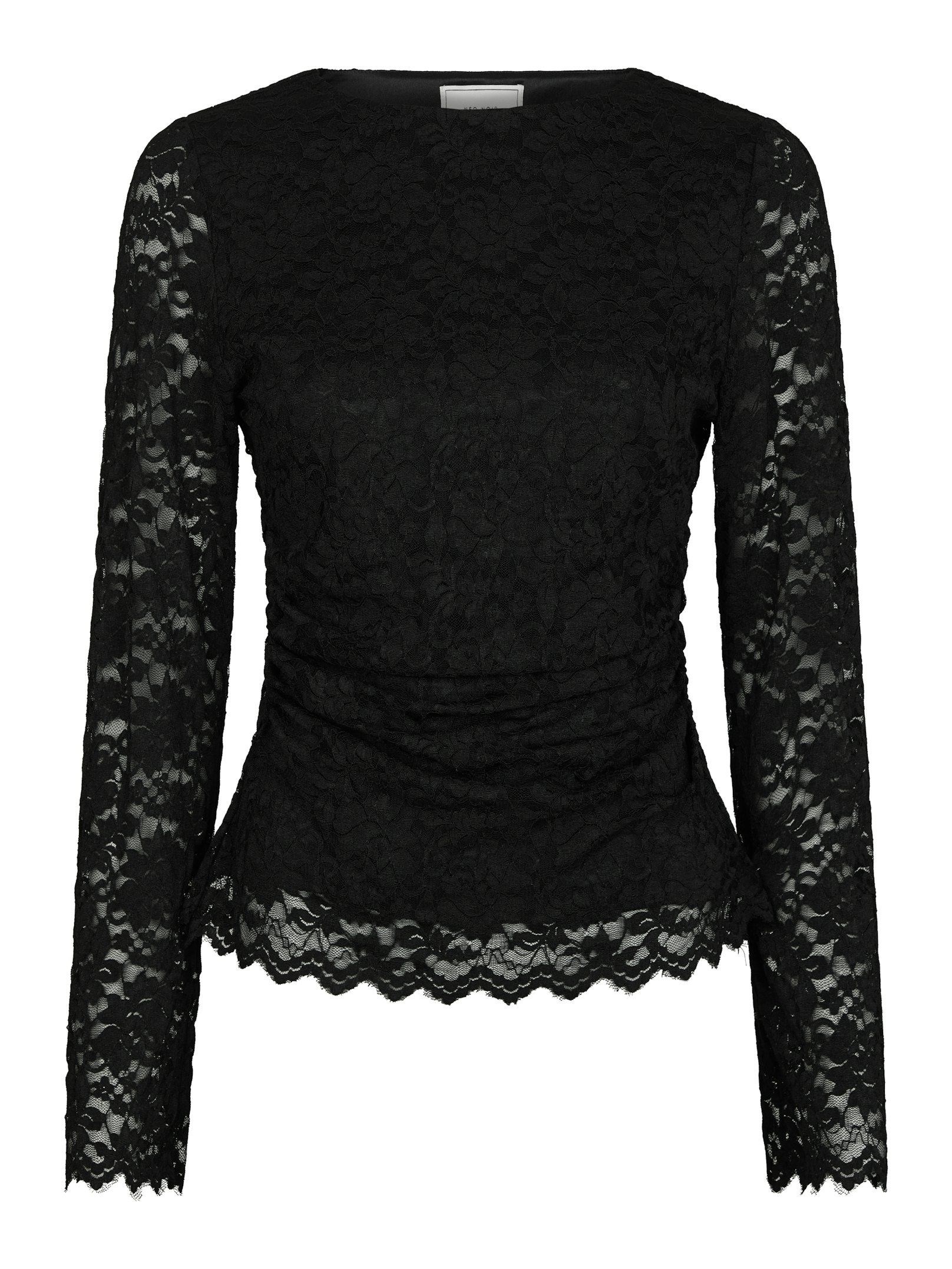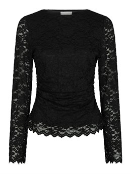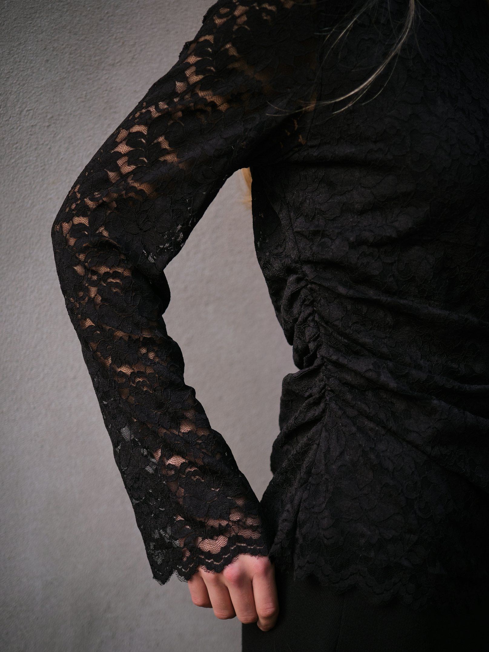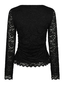 Smuk sort blondebluse fra Neo Noir med en flot tætsiddende pasform med rynk i siderne. Blusen har rund halsudskæring og lange ærmer med vidde forneden og en smuk blondeafslutning nederst. Modellen er 176 cm høj og er iført en str. 36.