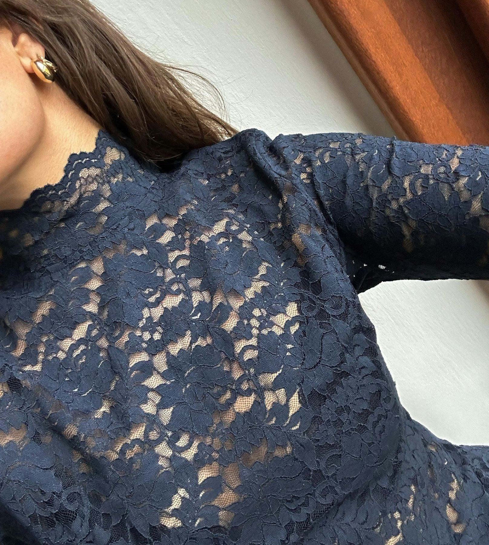 Smuk mørkeblå blondebluse fra Neo Noir i virkelig fin kvalitet med det fineste mønster og en flot tætsiddende pasform med stræk og høj hals med knappelukning i nakken. Modellen på billedet er 176 cm høj og bruger størrelse 36.