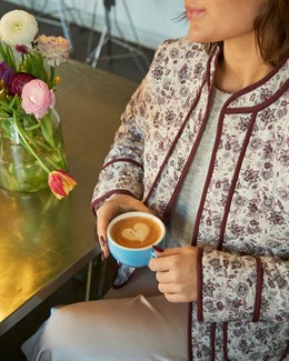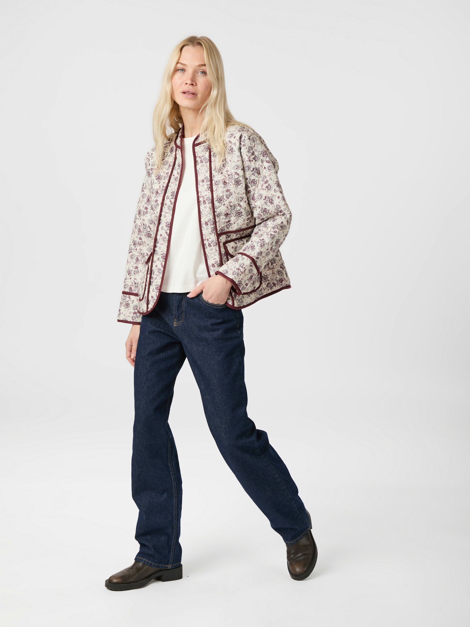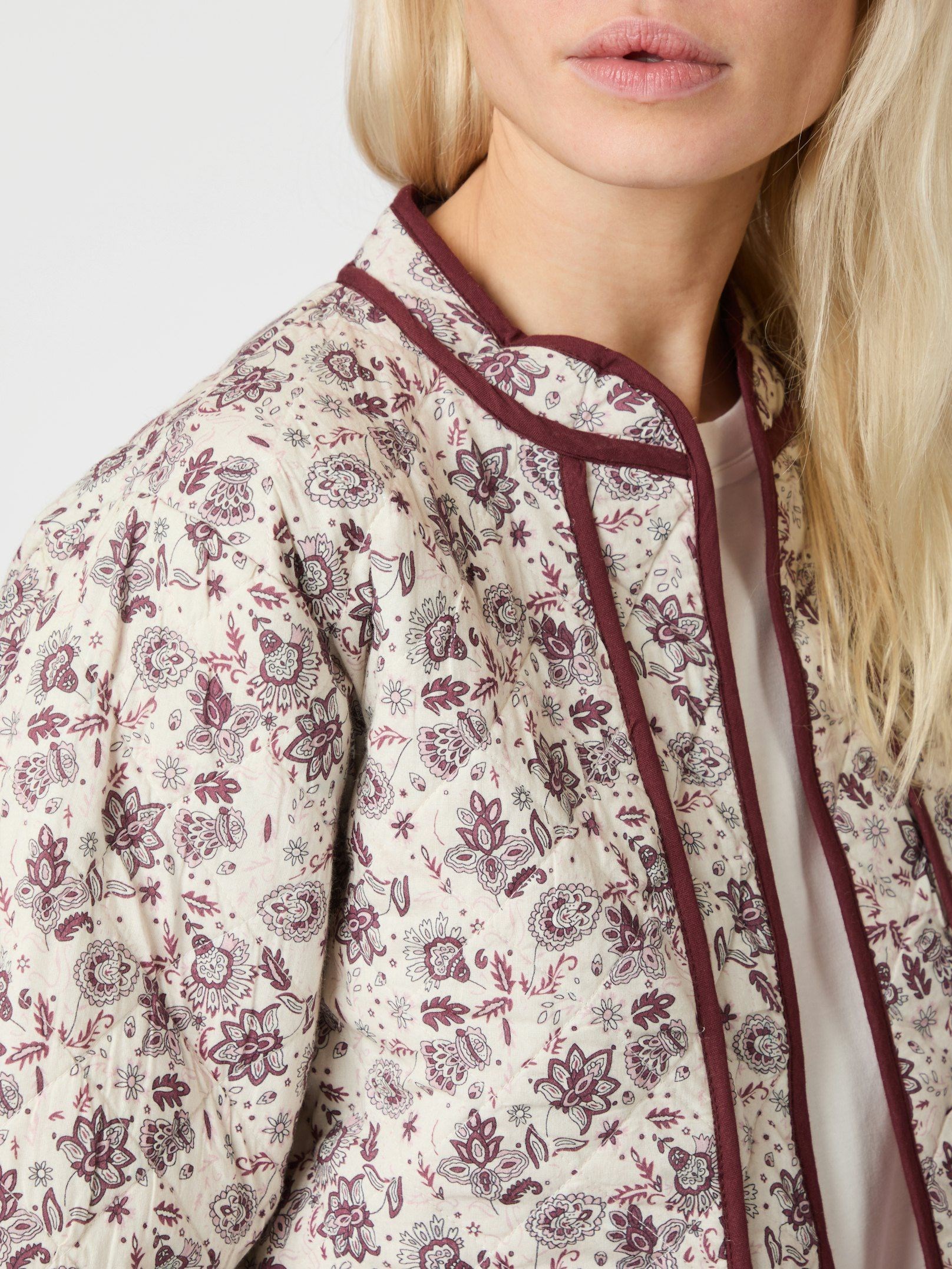 Fin quiltet jakke fra Neo Noir med feminint blomsterprint i rosa farver. Modellen er 176 cm og bærer en størrelse 36.