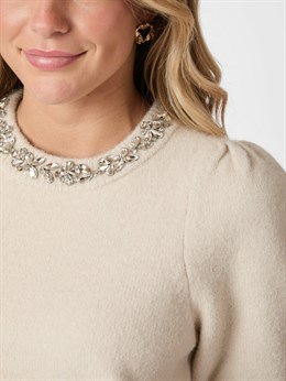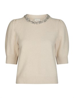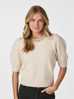 Dejlig blød strikket bluse med korte ærmer fra Neo Noir. Blusen har de fineste pufærmer og en flot smykkedetalje ved halsen. Den har en rigtig skøn pasform og en dejlig lun kvalitet. Modellen er 176 høj og iført størrelse 36.