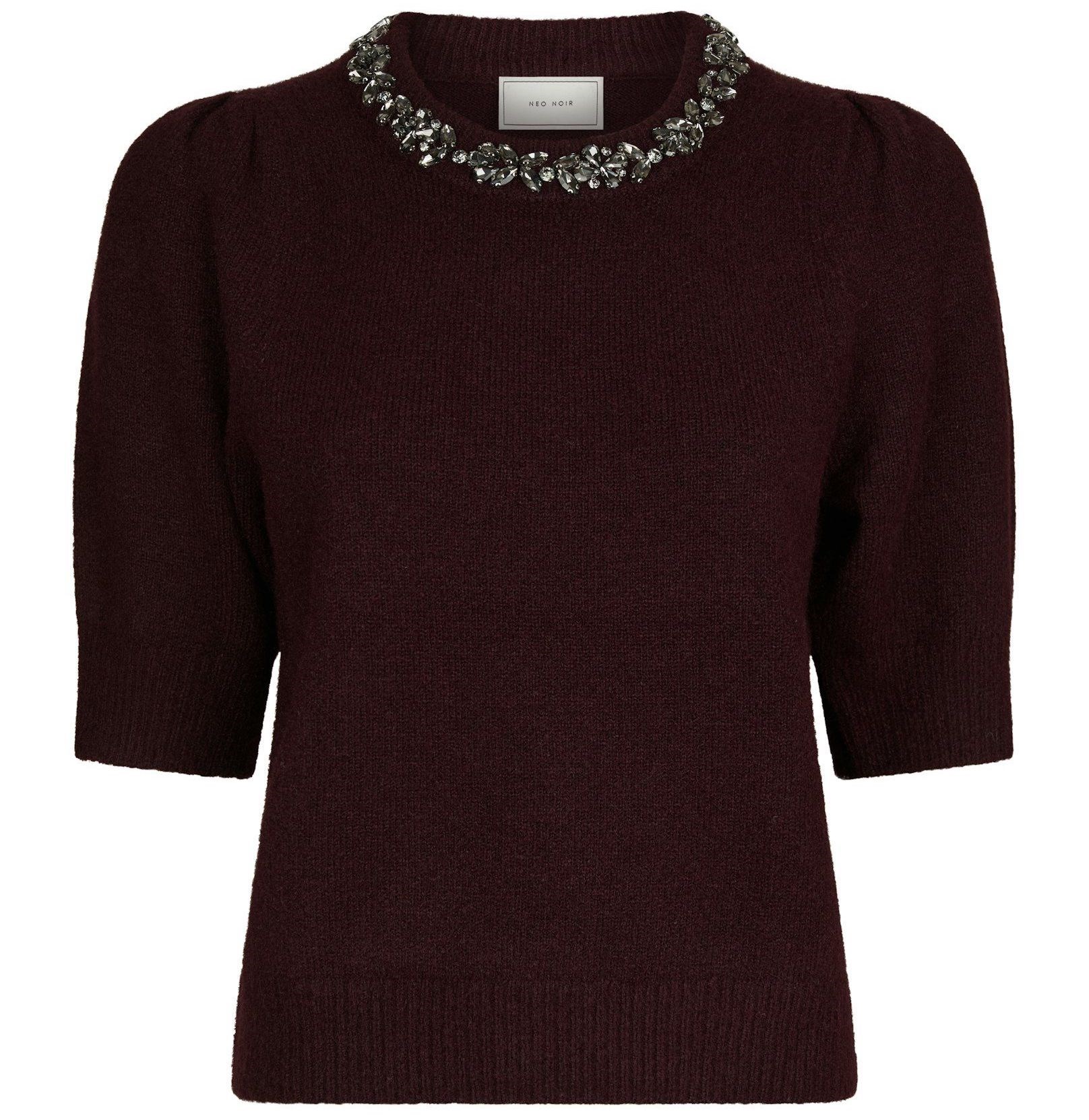 Dejlig blød strikket bluse med korte ærmer fra Neo Noir. Blusen har de fineste pufærmer og en flot smykkedetalje ved halsen. Den har en rigtig skøn pasform og en dejlig lun kvalitet. Modellen er 176 høj og iført størrelse 36.