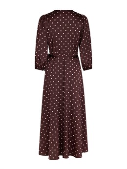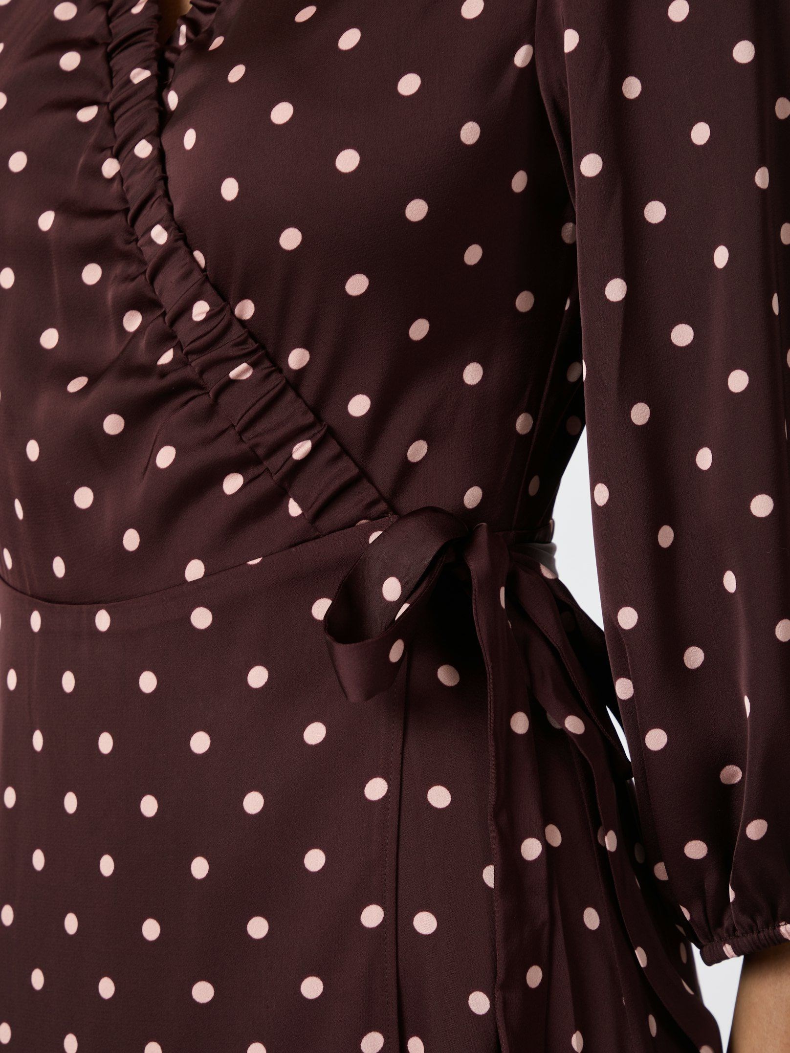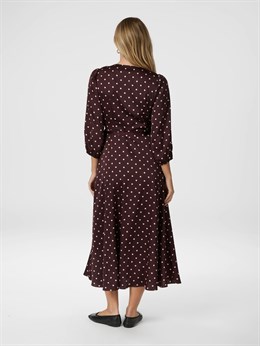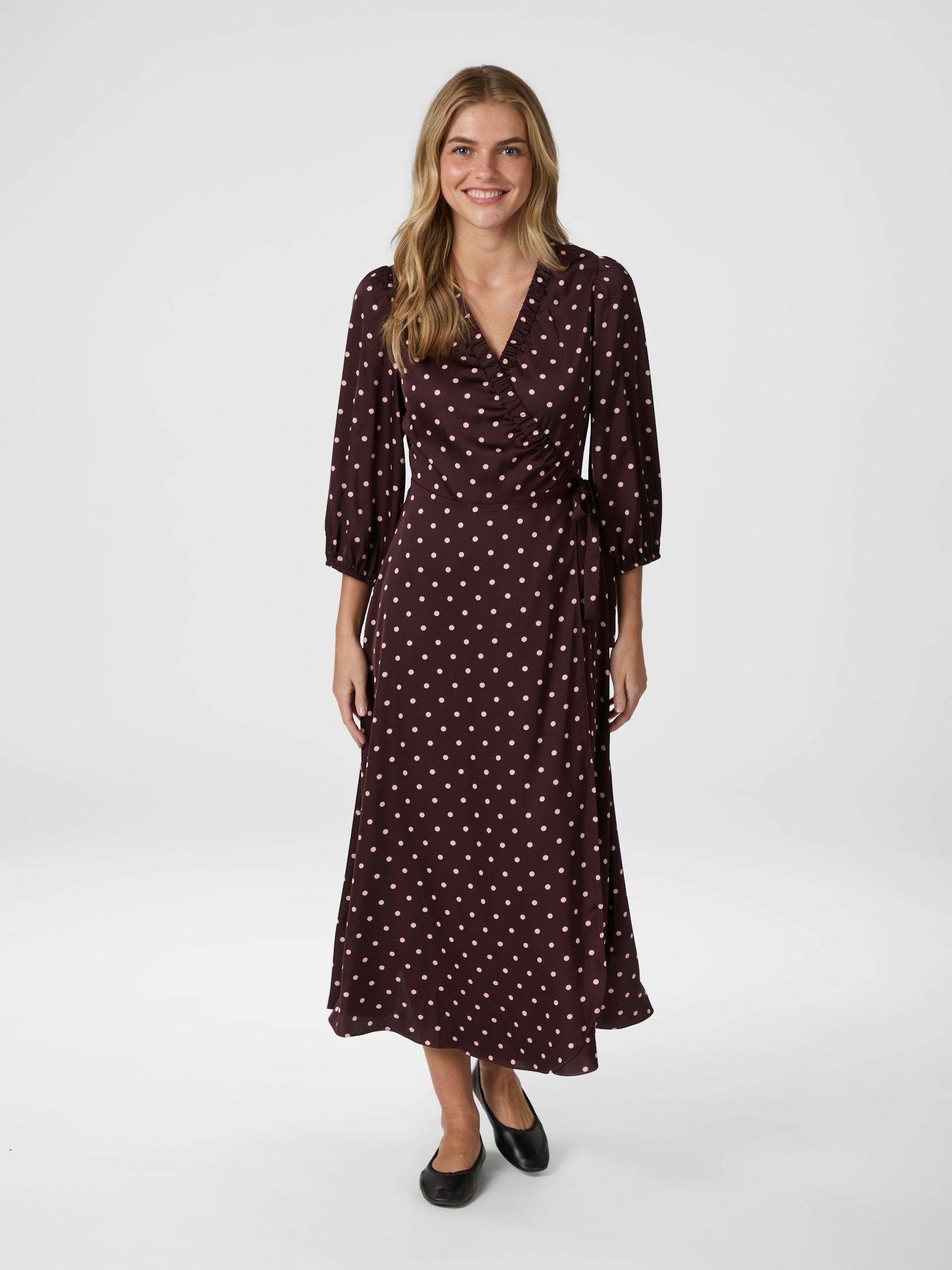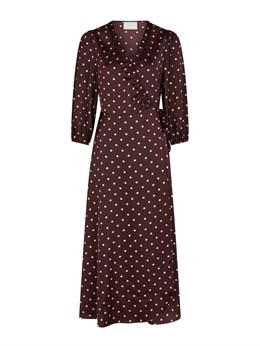 Smuk vinrød slå-om kjole fra Neo Noir med lyse prikker. Kjolen har en skøn midi-længde og trekvartlange ærmer. Den har en flot pasform der fremhæver taljen og elastisk kant med rigtig fine rynkedetaljer. Modellen er 176 cm og bærer en størrelse 36.