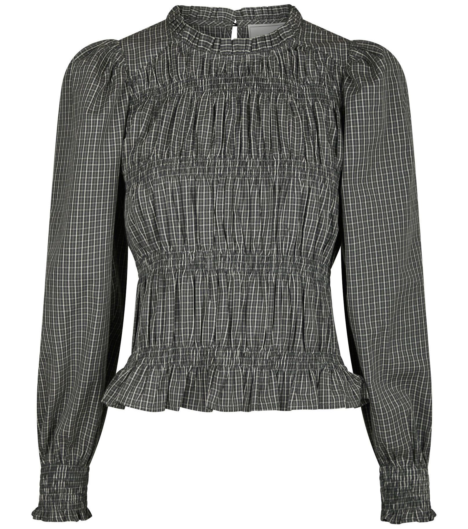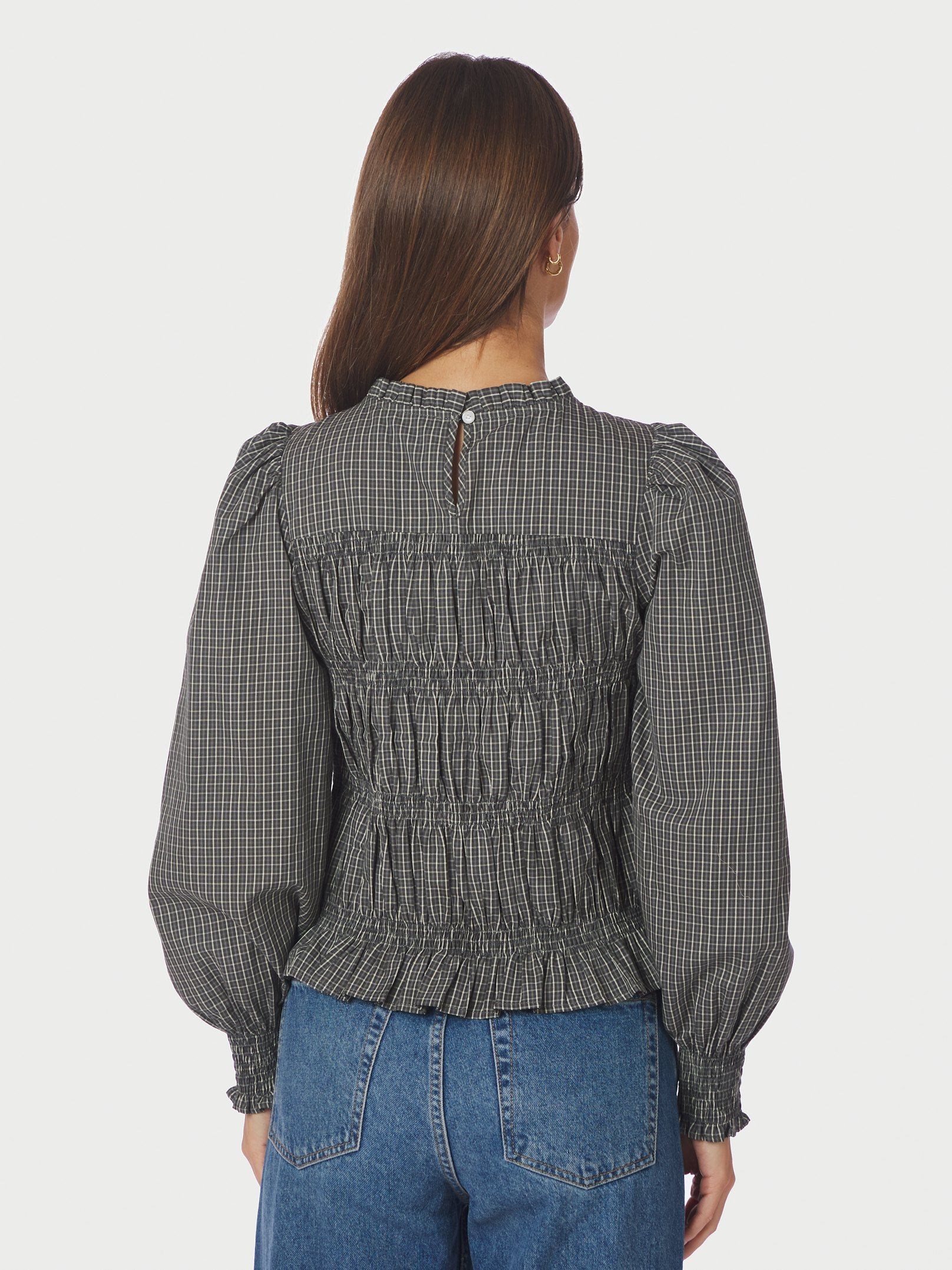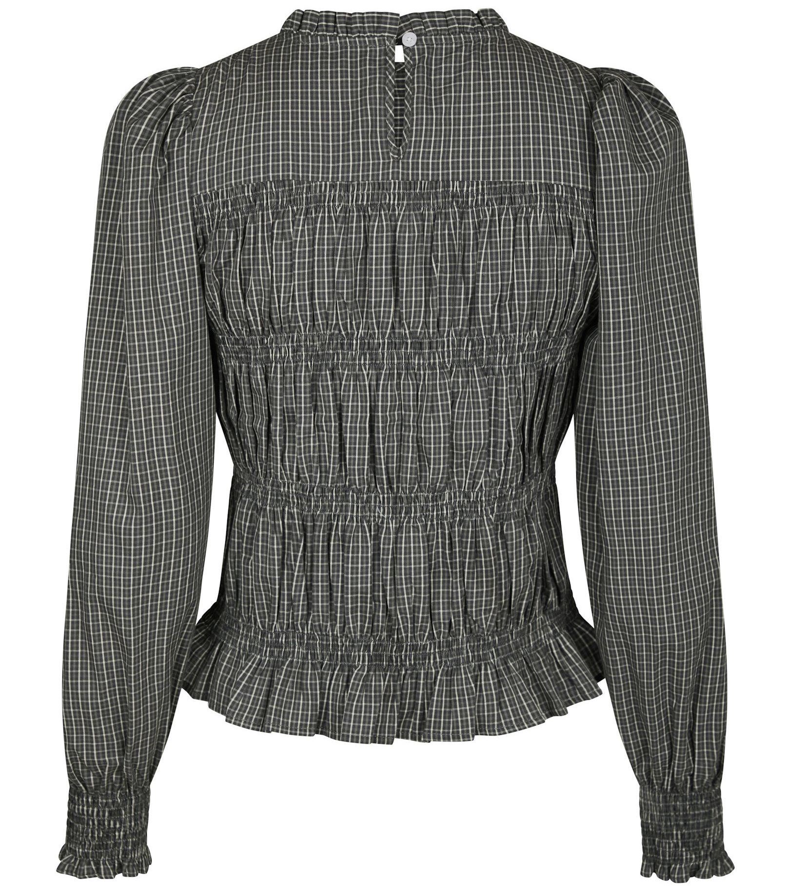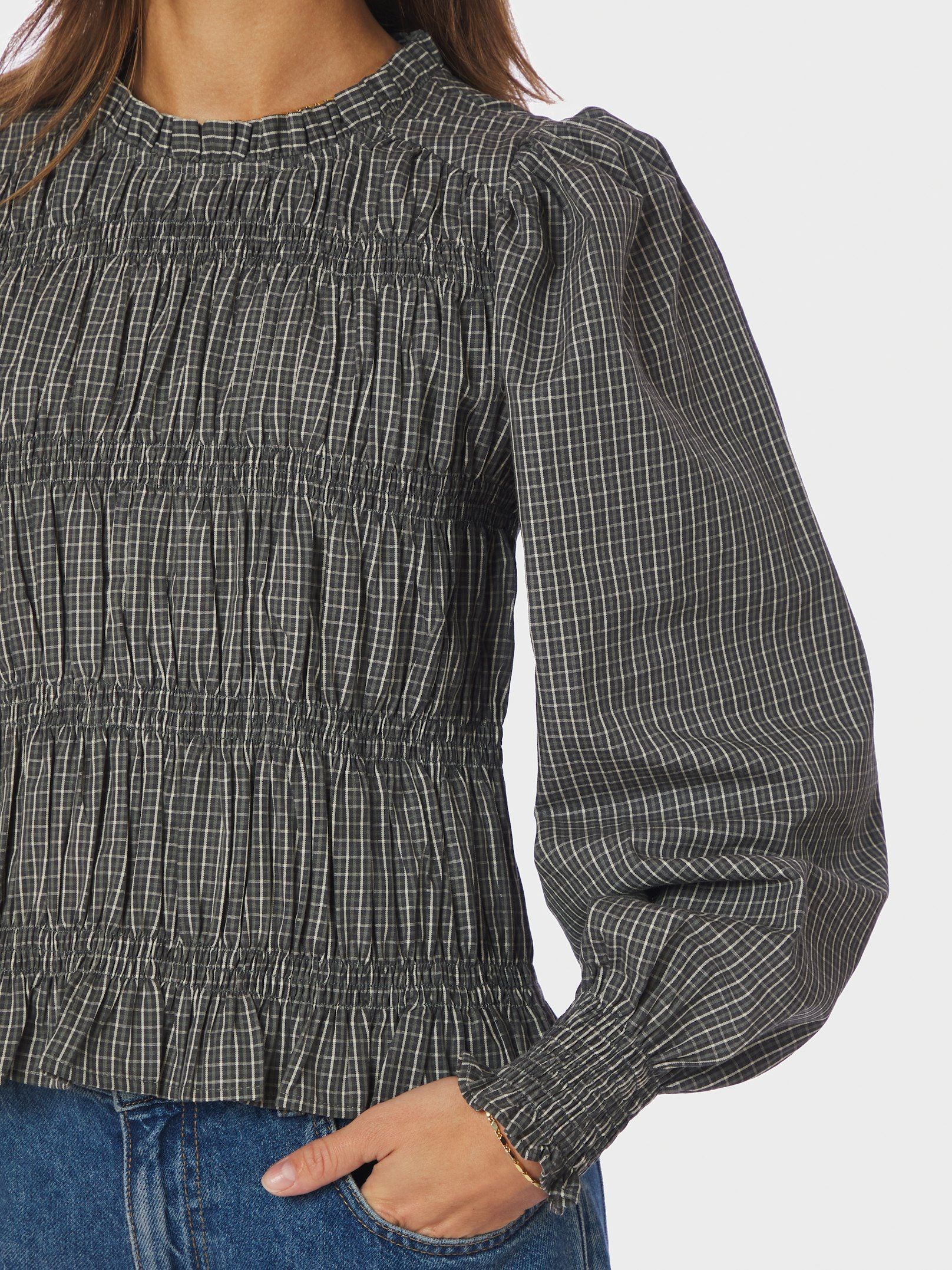 Fin langærmet bluse fra Neo Noir med ternet print og smock på kroppen samt fine lange ballonærmer og flæsehals med knap i nakken. Modellen på billedet er 176 cm og iført størrelse 36.