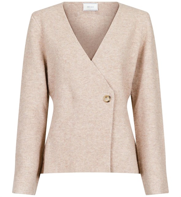 Sandfarvet strik-cardigan fra Neo Noir i lækker blød kvalitet. Cardiganen har en delikat timeglas form med knappelukning i siden og en smuk v-udskæring. Den har lange ærmer med vidde og en rigtig skøn pasform.