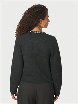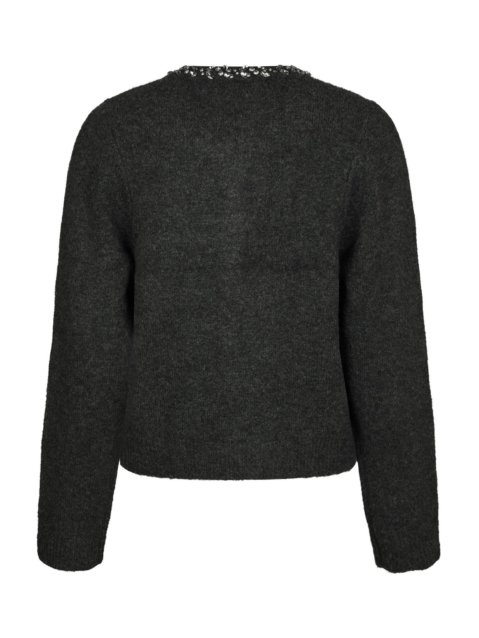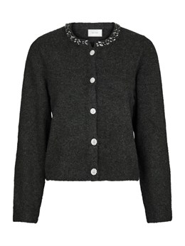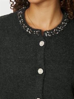 Sød strikket cardigan fra Neo Noir med diamanter ved halsen og virkelig fine dekorative perleknapper. Den har en rigtig skøn pasform og en dejlig lun kvalitet. Modellen er 176 høj og iført størrelse 36.