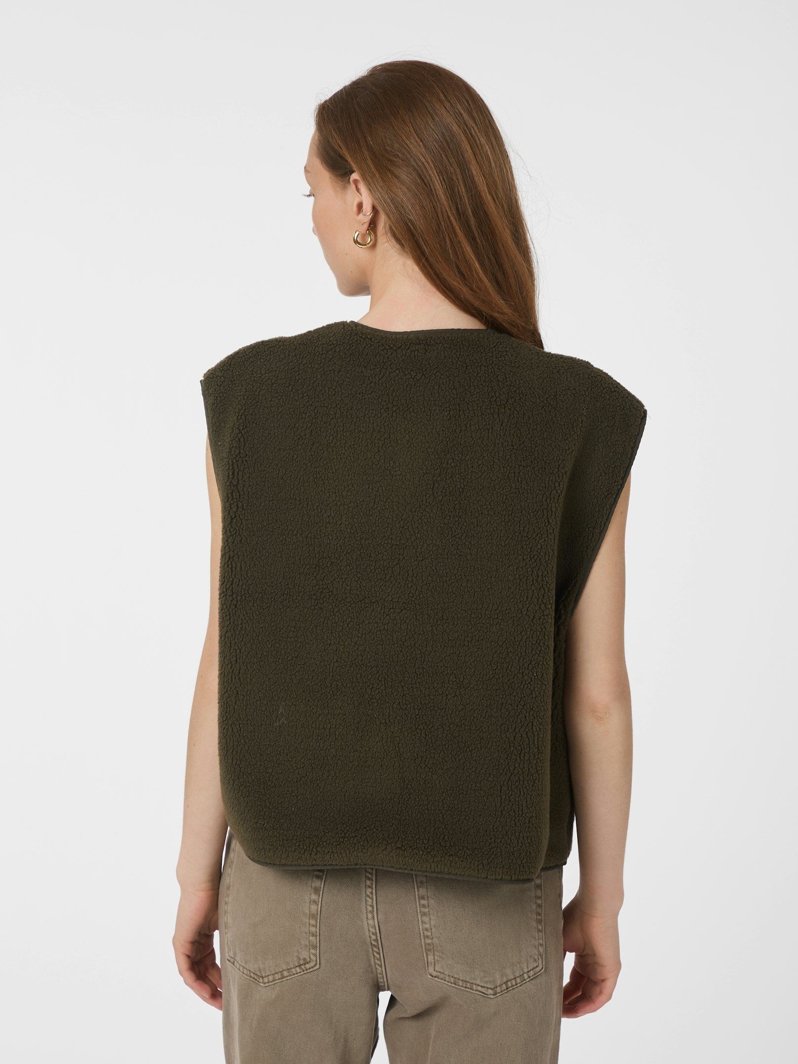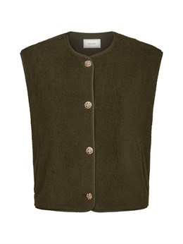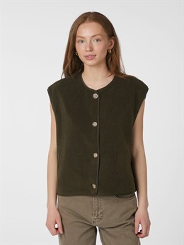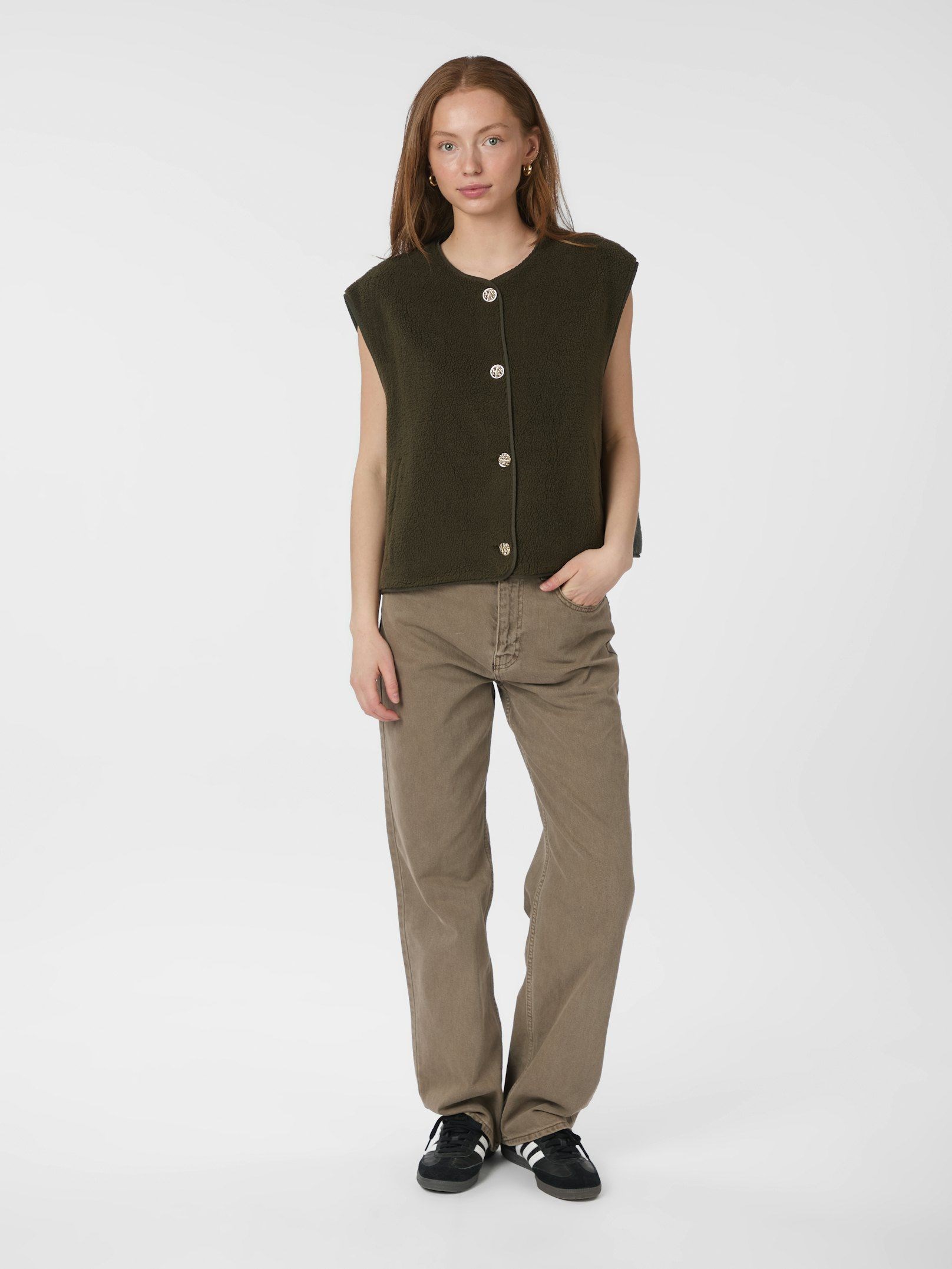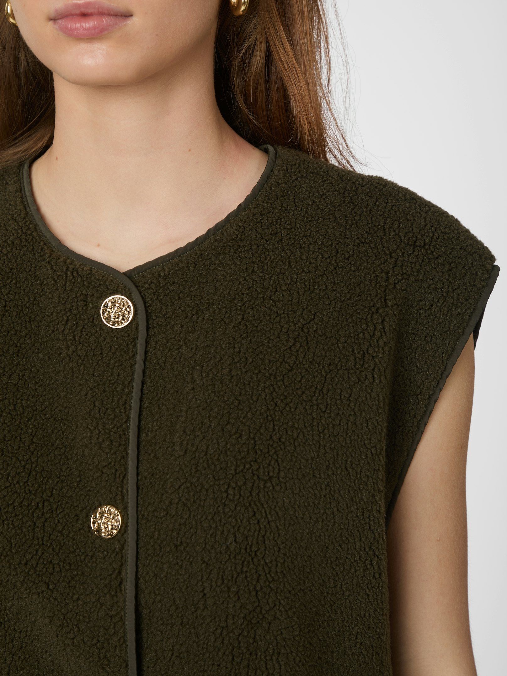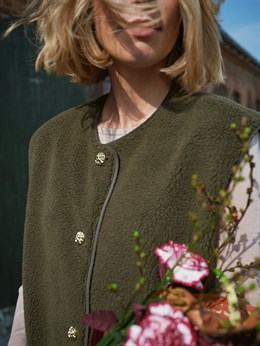 Fin og komfortabel teddyvest med guldknapper. Modellen er 176 cm og bærer en størrelse 36.