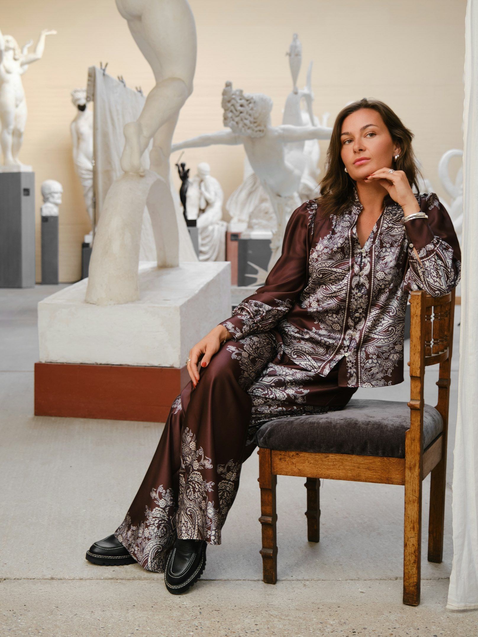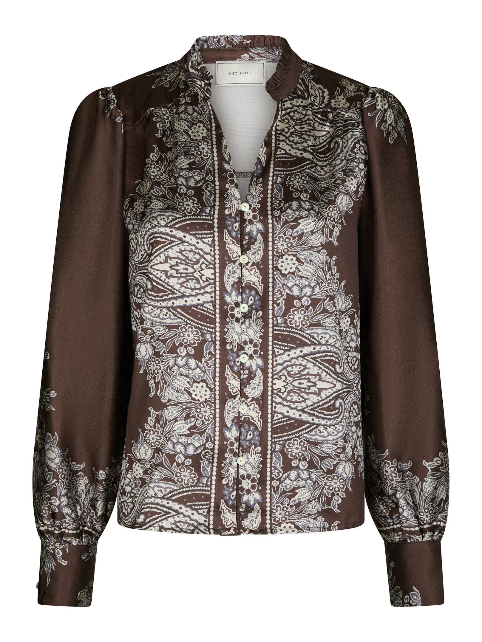 Smuk mørkebrun skjortebluse fra Neo Noir i blød satinkvalitet med et smukt paisley print. Blusen har lange ærmer, v-udskæring ved halsen og dekorative knapper. Modellen på billedet er 176 cm og iført størrelse 36.