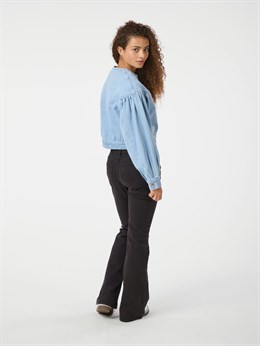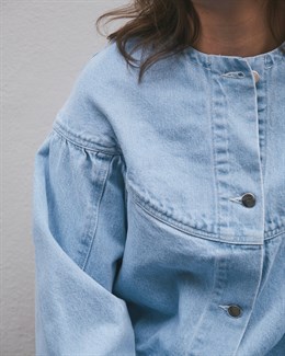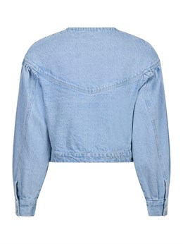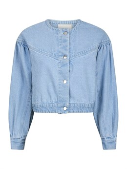 Fin lyseblå denimjakke fra Neo Noir med pufærmer og knappelukning. Modellen er 176 cm og bærer en størrelse 36.