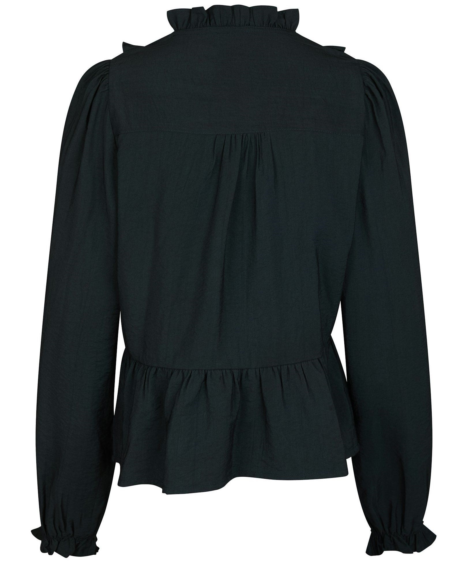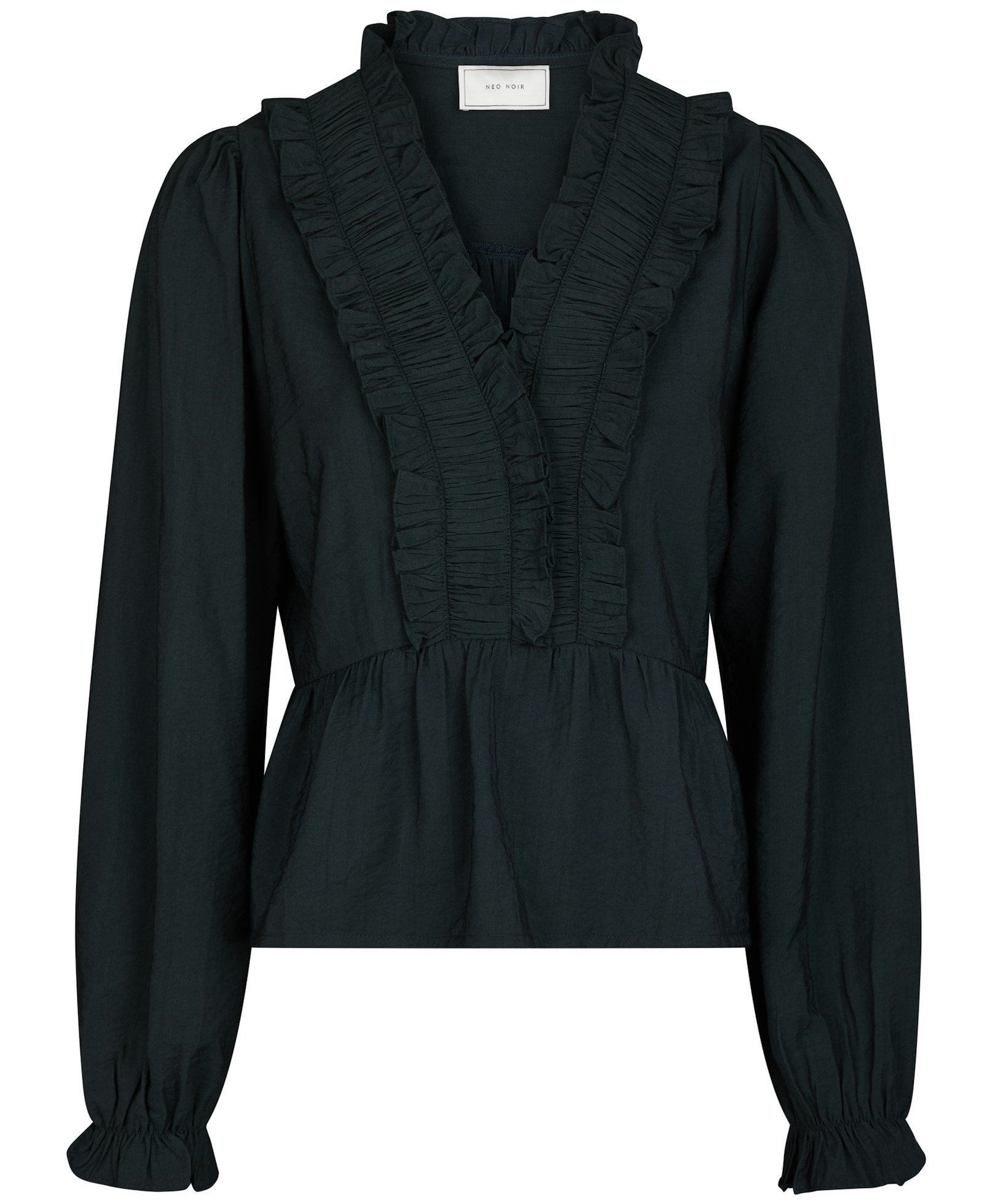 Virkelig pæn mørkeblå bluse fra Neo Noir med v-udskæring og smukke flæser og elastik-detaljer. Blusen har en flot facon og en dejlig blød kvalitet. Modellen er 176 høj og iført størrelse 36.