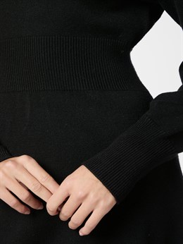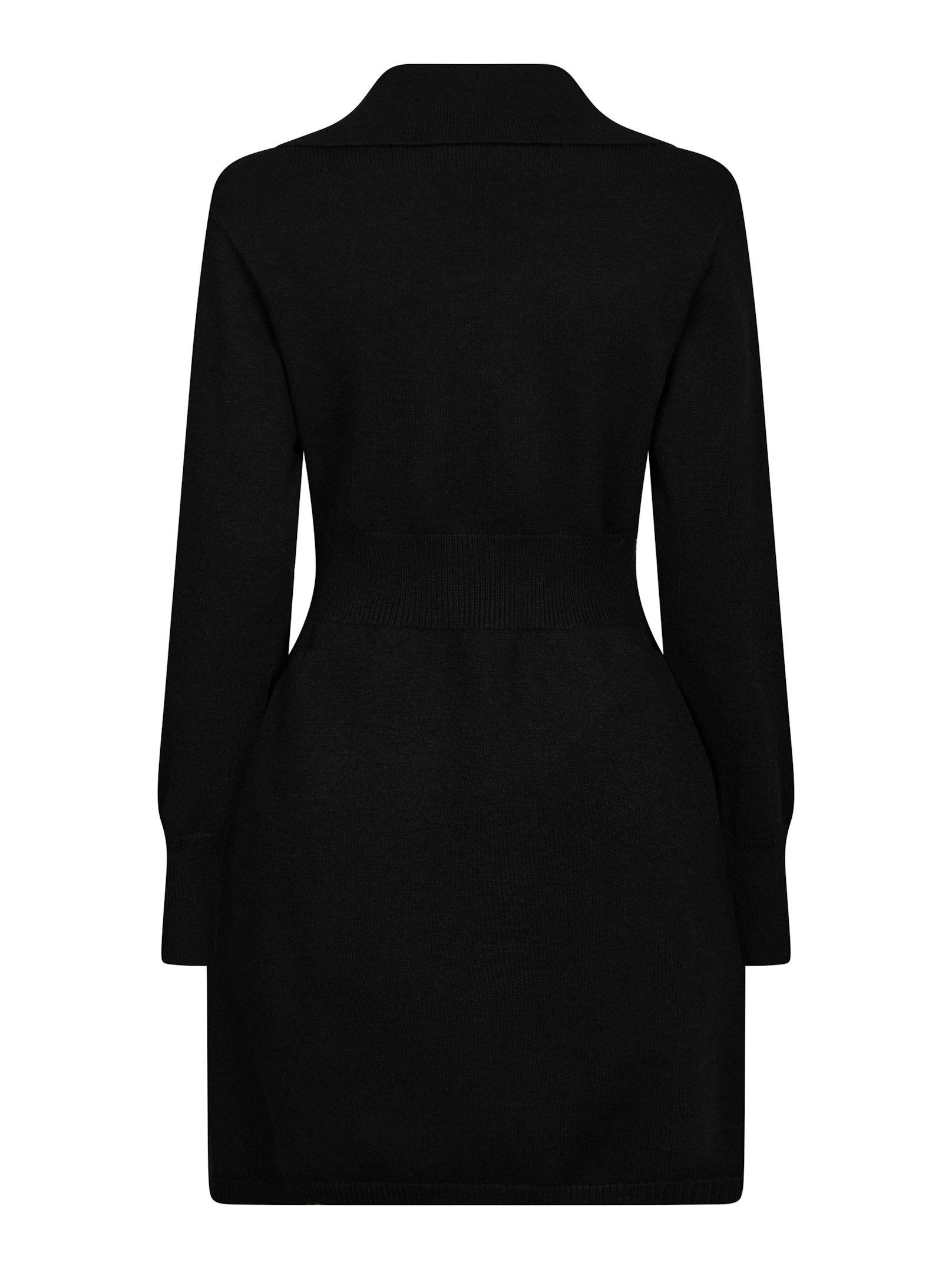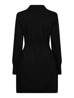 Fin sort strikkjole fra Neo Noir med ribbede kanter og tætsiddende pasform der fremhæver taljen (resten af kjolen er løstsiddende). Modellen er 176 cm og bærer en størrelse 36.