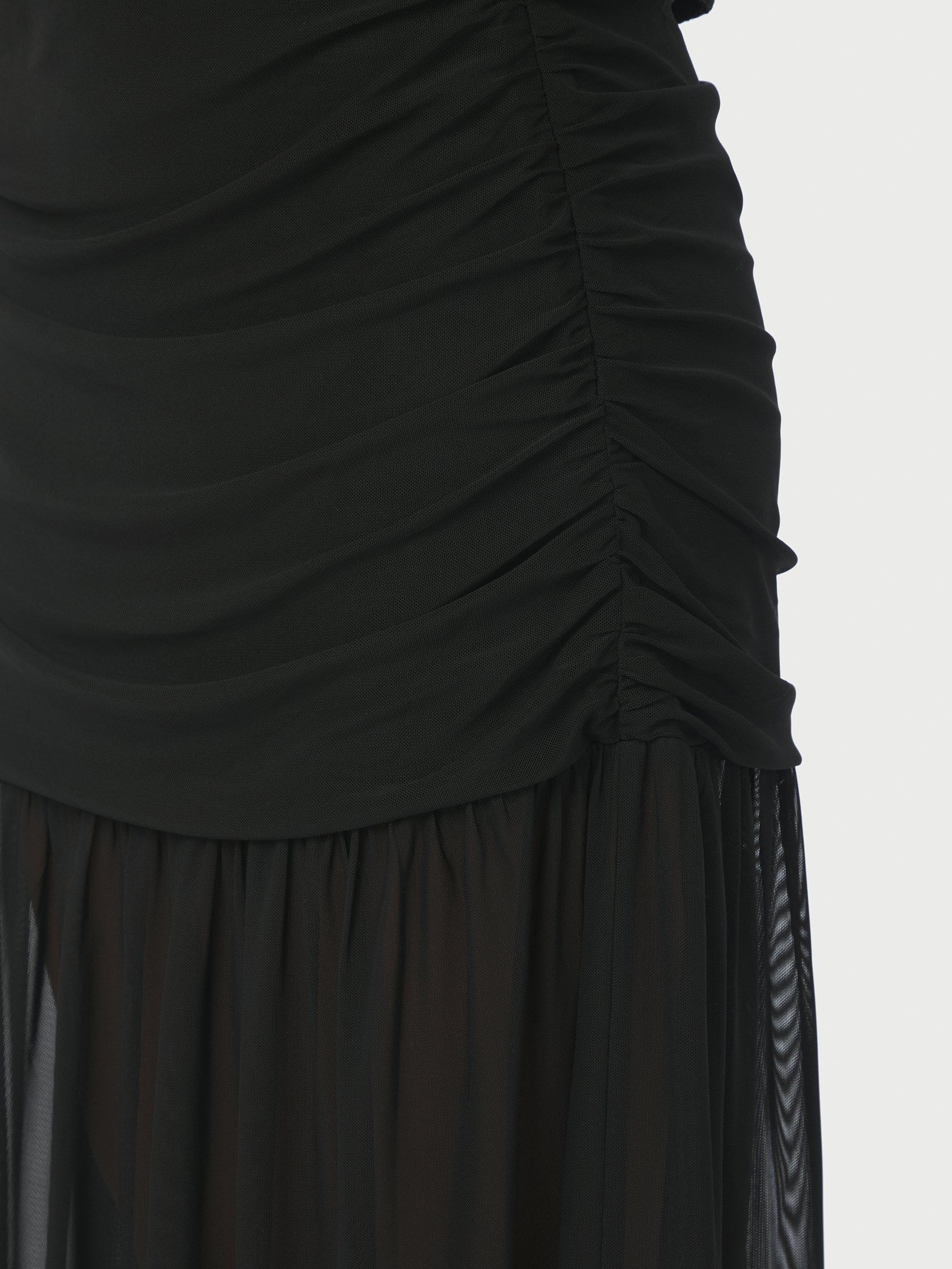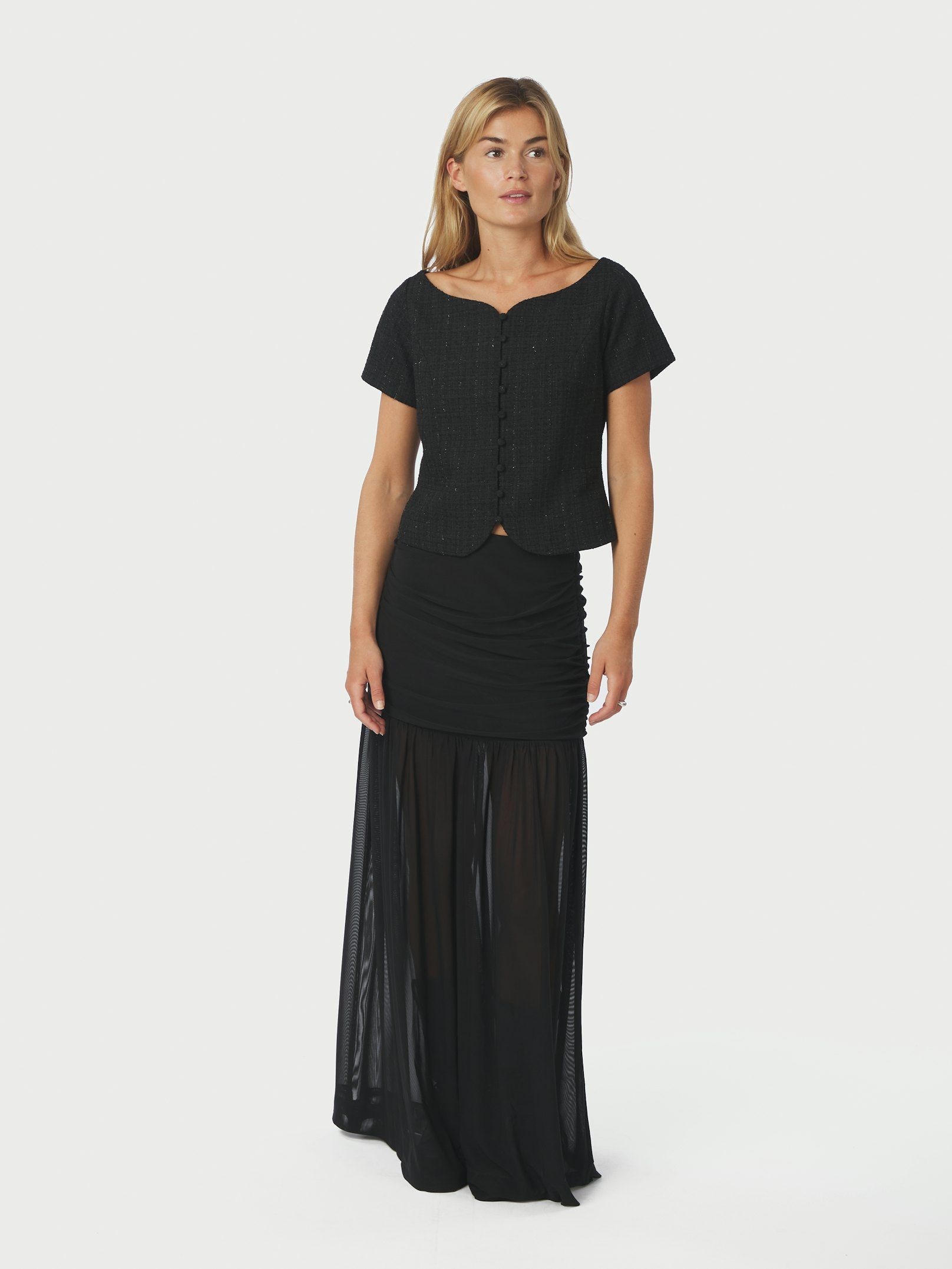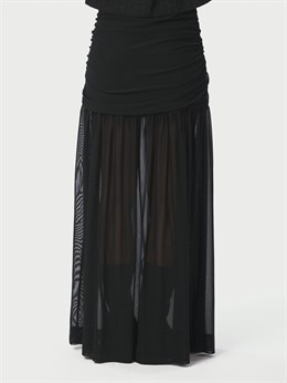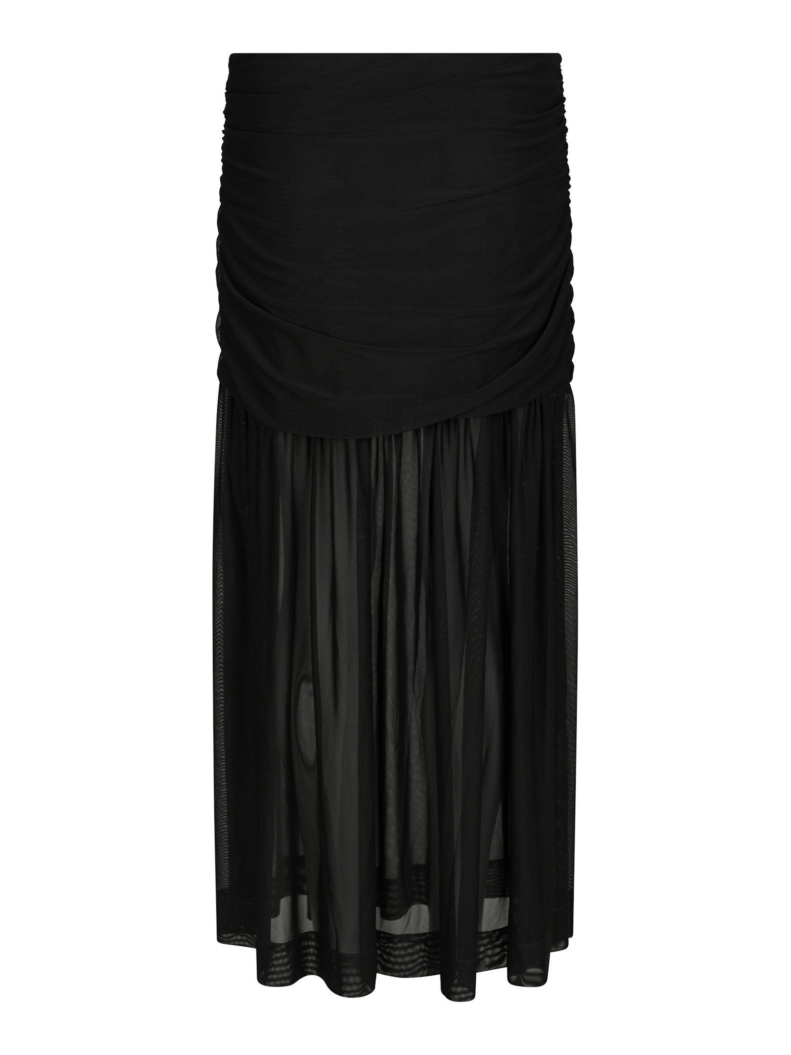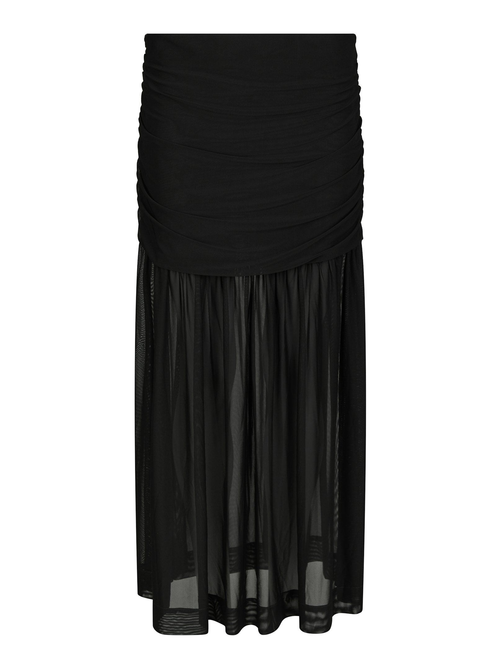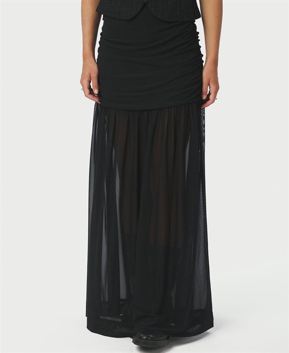 Lang sort mesh nederdel fra Neo Noir med dobbelt lag i den øverste halvdel, som sidder tæt med fine rynkedetaljer, og et gennemsigtigt stykke nederst. Modellen er 176 cm høj og bruger størrelse 36.