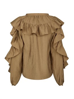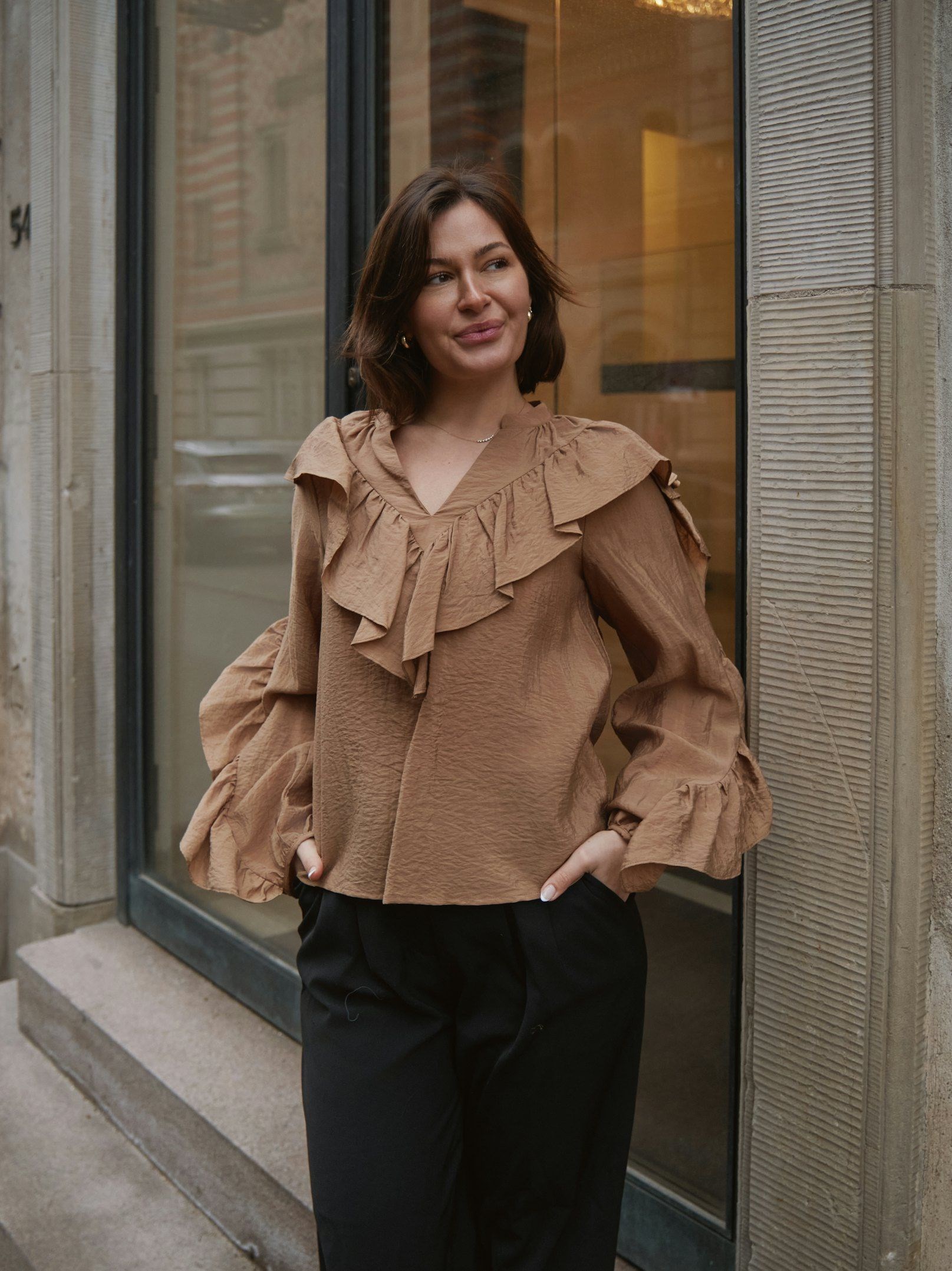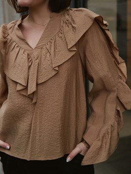 Smuk sandfarvet bluse fra Neo Noir med løs pasform og mange feminine flæser. Blusen har en flot v-udskæring ved halsen. Modellen på billedet er 176 cm og iført størrelse 36.