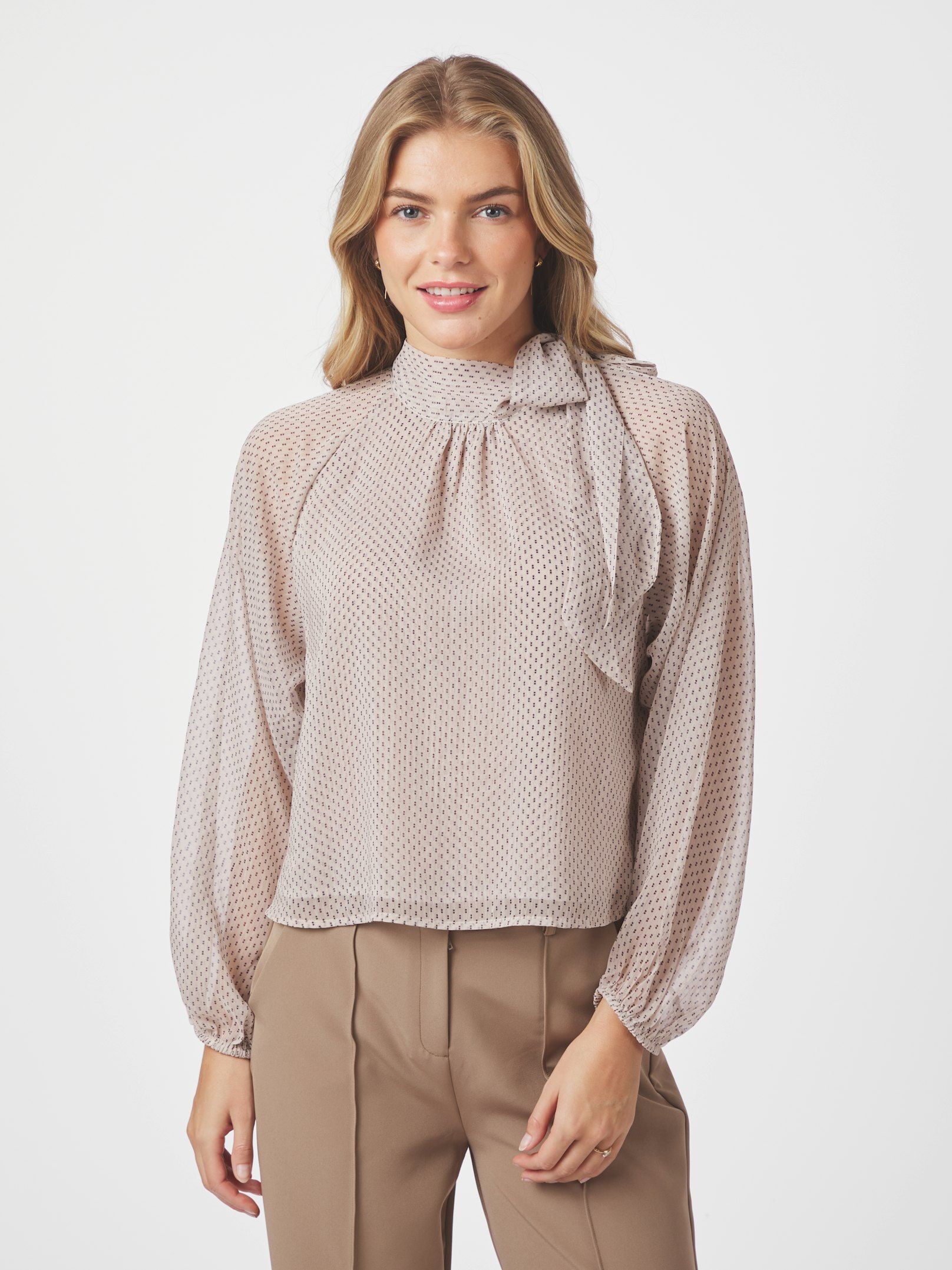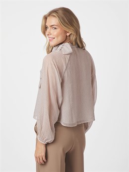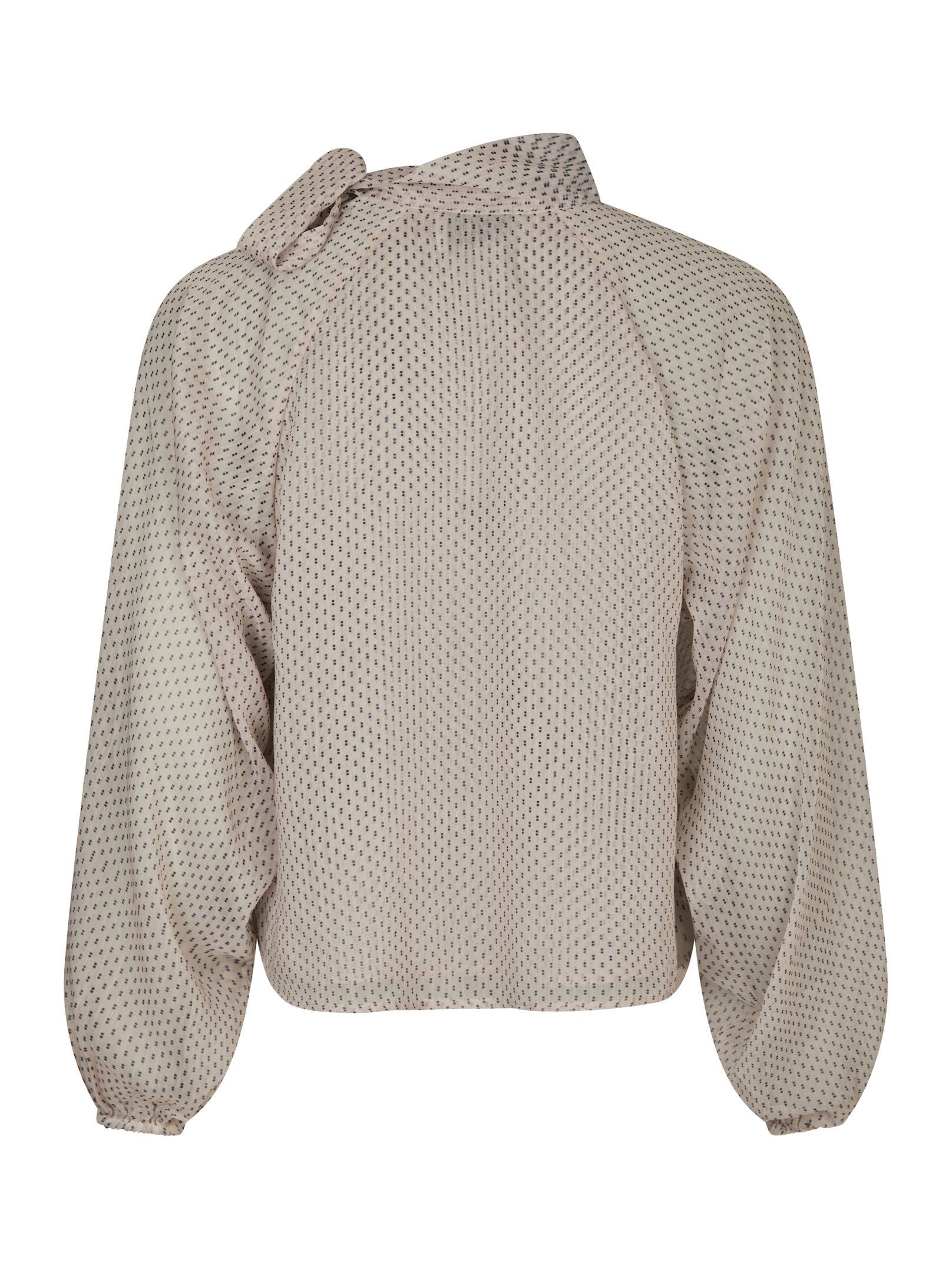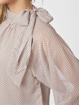 Smuk bluse fra Neo Noir i let chiffonkvalitet med prikket print. Blusen har løs pasform, elastiske mancetter og bindebånd ved halsen. Modellen på billedet er 176 cm og iført størrelse 36.