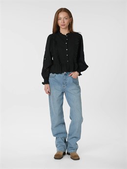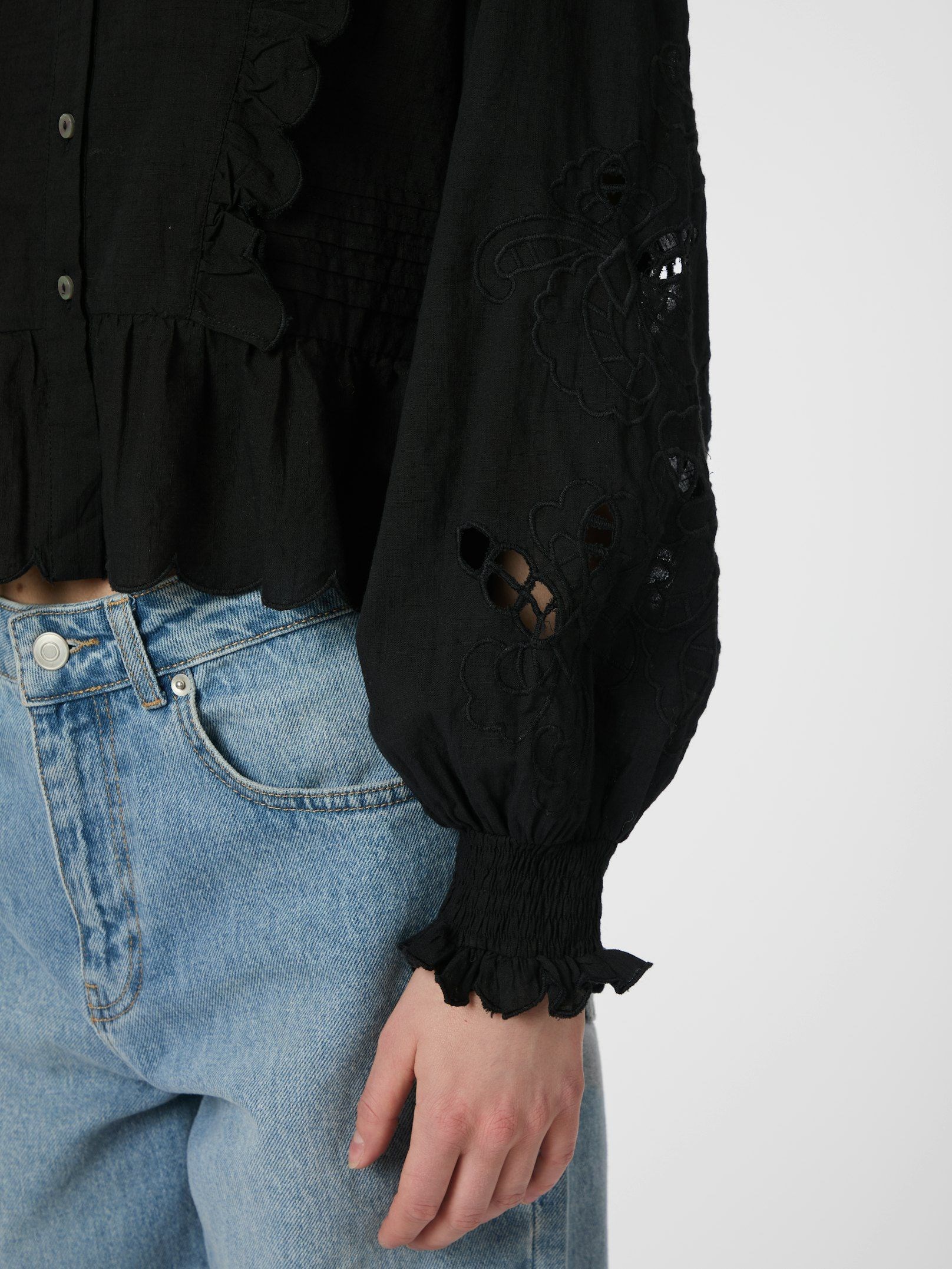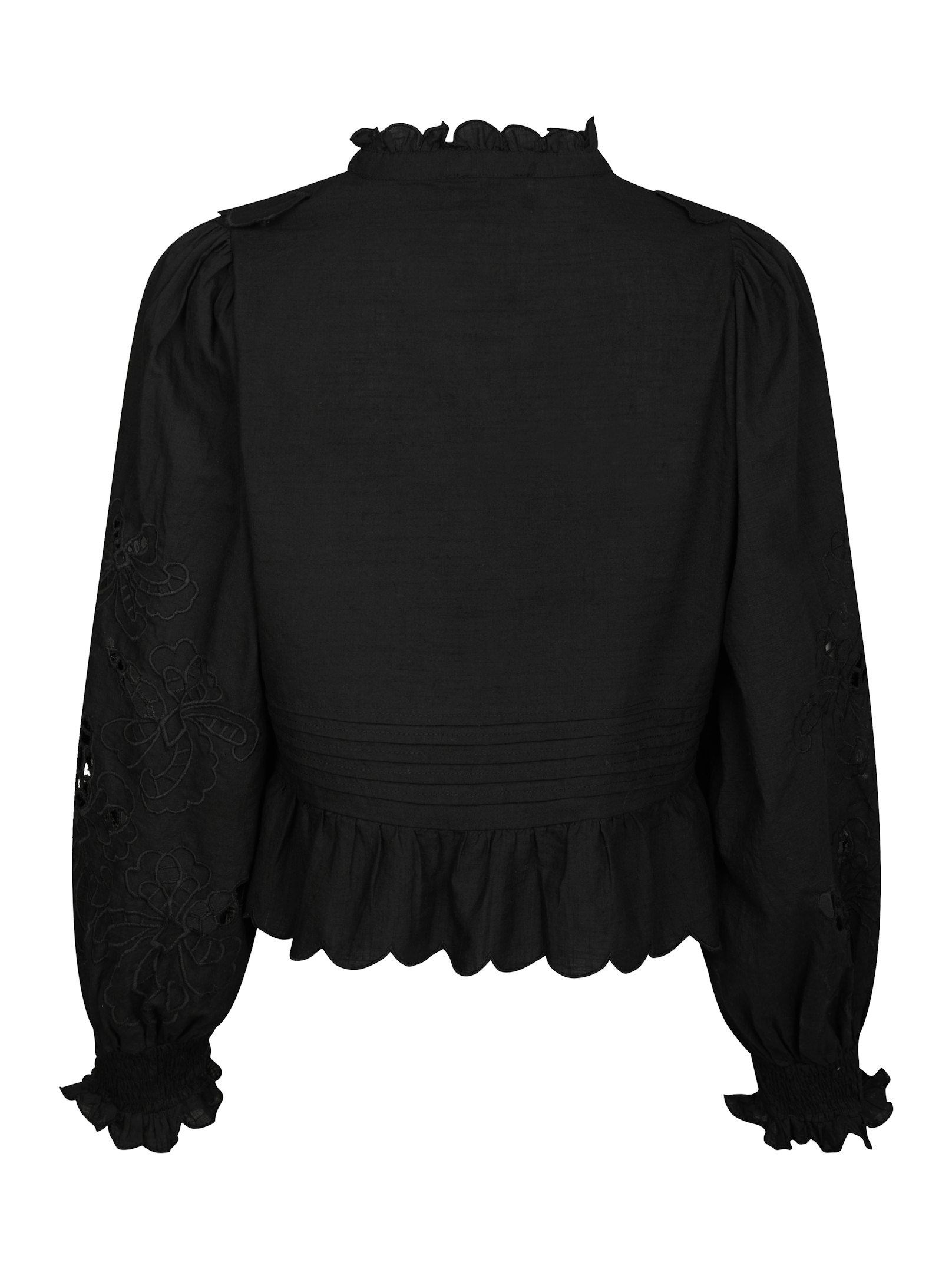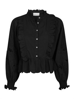 Kort sort skjorte fra Neo Noir med flæsedetaljer og broderi anglaise. Skjorten har knappelukning foran og en virkelig fin detalje med flæser ved taljen og elastik omme i lænden. Modellen på billedet er 176 cm og iført størrelse 36.