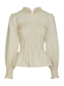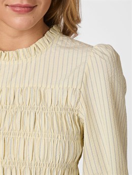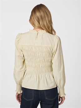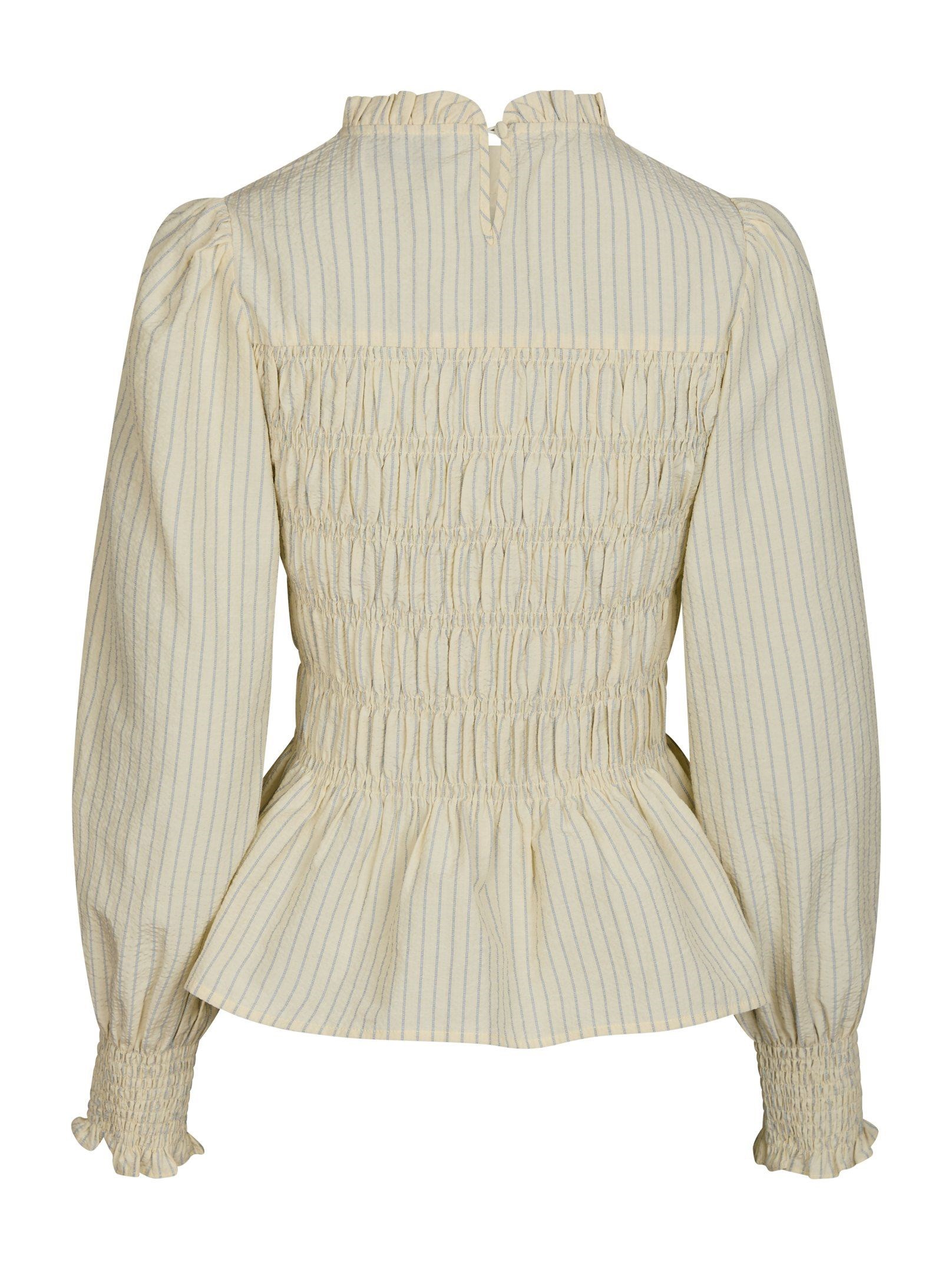 Fin kropsnær skjorte-bluse fra Neo Noir med smock-detaljer og stribet design med flæse nederst samt ved hals og håndled. Modellen er 176 høj og iført størrelse 36.