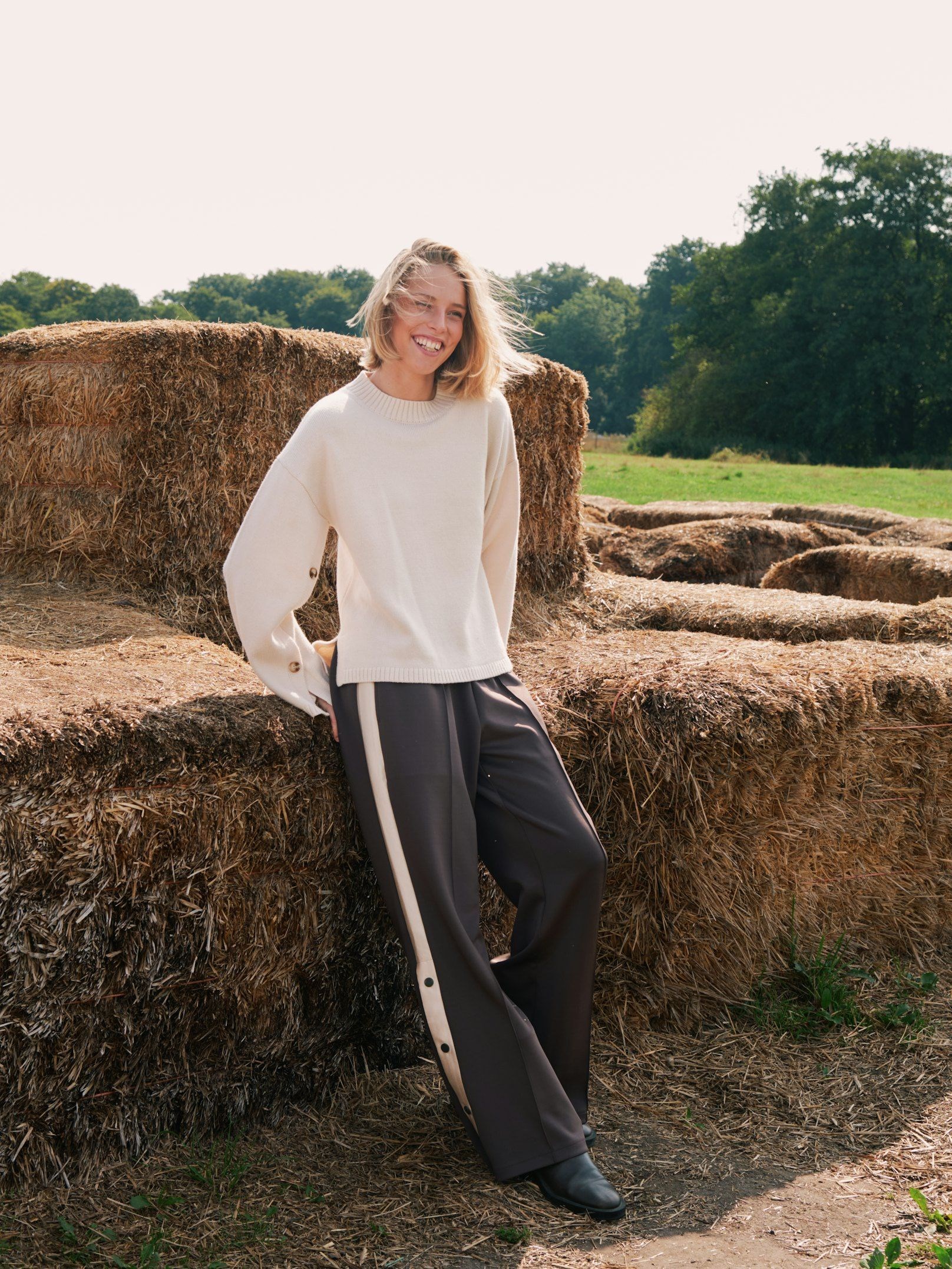 Cool træningsbukser fra Neo Noir i glat materiale med elastisk talje samt brede ben med knapper i sidesømmen. Modellen på billedet er 176 cm og iført størrelse 36.