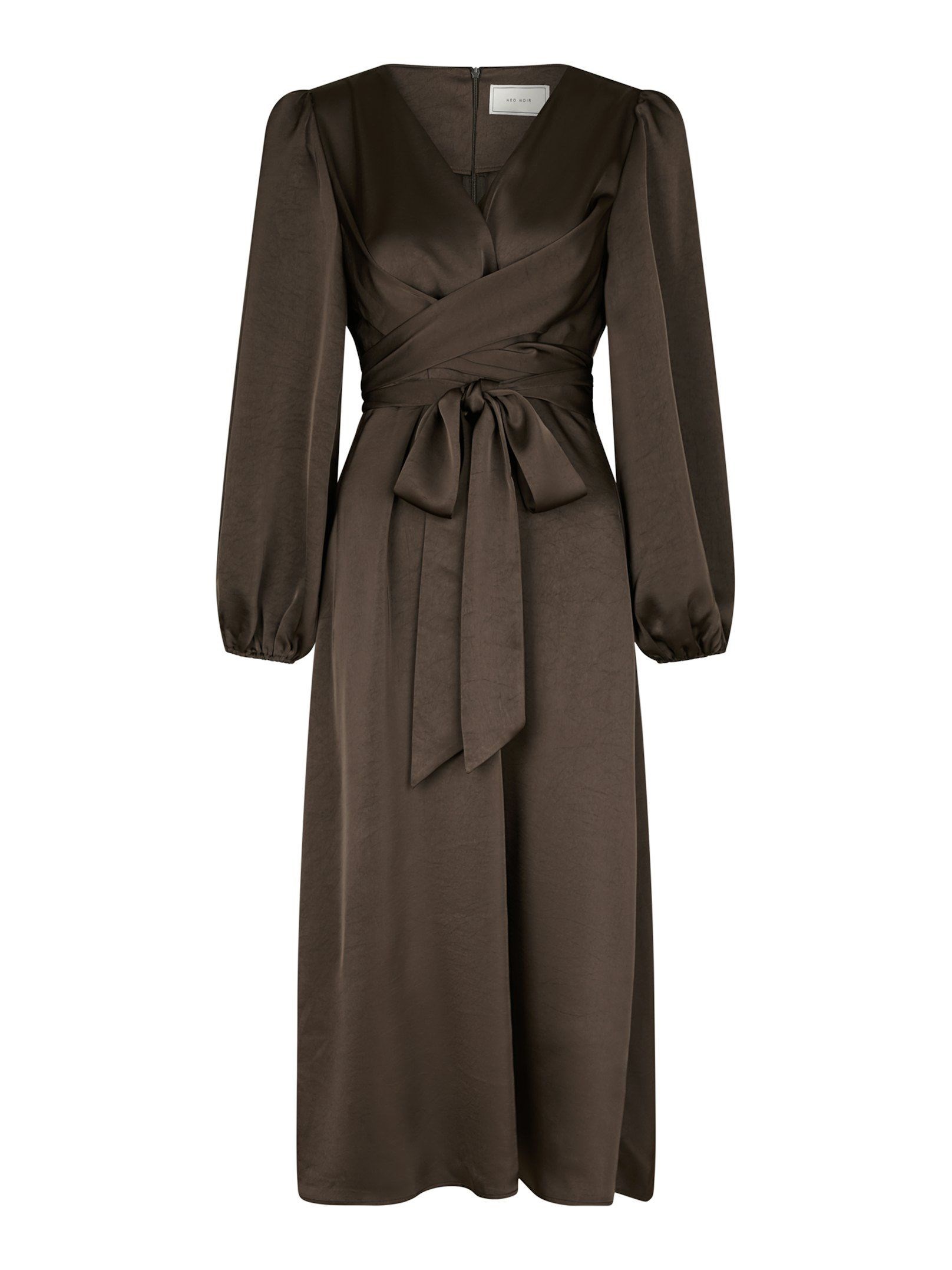 Smuk feminin kjole fra Neo Noir med omslag om taljen. Kjolen kommer i en dejlig tung brun satinkvalitet. Modellen er 176 cm og bærer en størrelse 36.