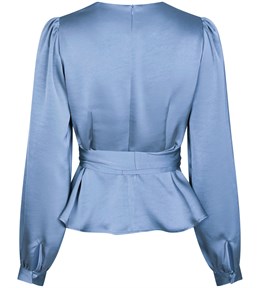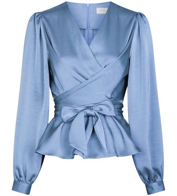 Feminin bluse fra Neo Noir i flot lyseblå satinkvalitet. Blusen har et bindebånd omkring taljen, som kan bindes foran eller bagpå, samt peplum effekt nederst. Modellen er 176 cm høj og bærer en størrelse 36.
