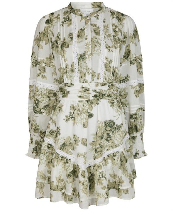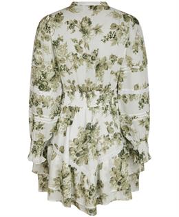 Fin bomuldskjole fra Neo Noir med grønt blomsterprint og blondedetaljer. Kjolen har skjult knappelukning foran og et bredt bånd der fremhæver taljen. Modellen er 176 cm og bærer en størrelse 36.