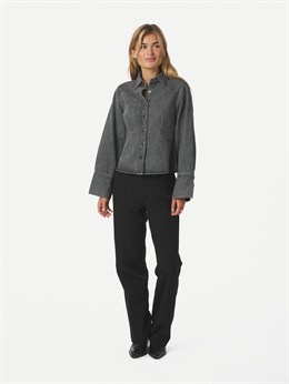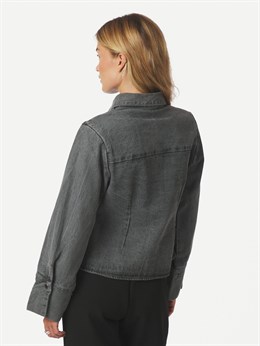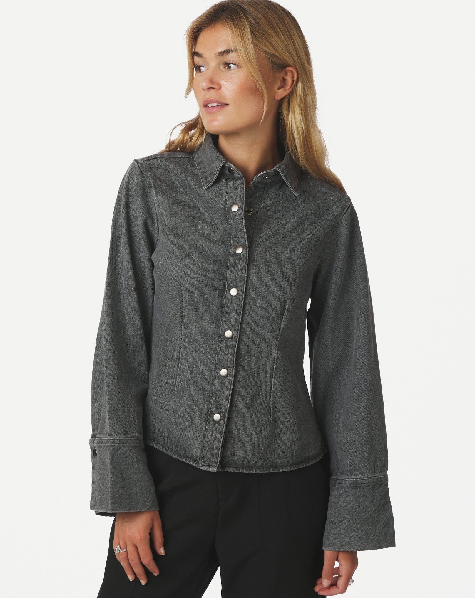 Fin figursyet denimskjorte fra Neo Noir i flot grå denimvask. Skjorten lukning foran med trykknapper samt krave og lange brede ærmer med manchetter. Modellen på billedet er 176 cm og iført størrelse 36.