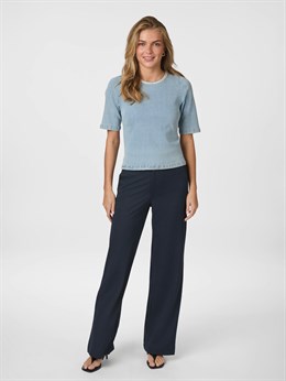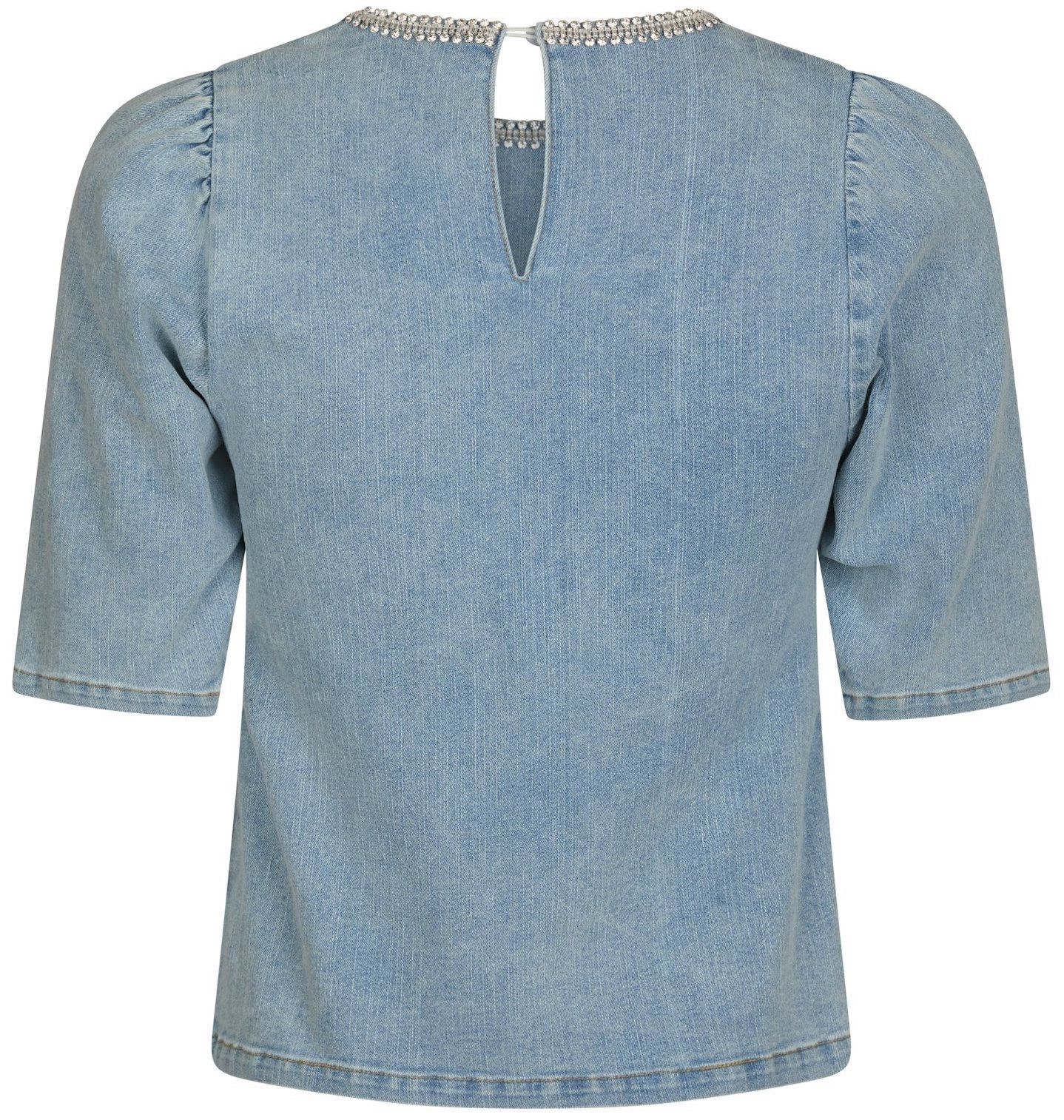 Sød bluse fra Neo Noir i blød lyseblå denimkvalitet med fine pufærmer og en smuk facon. Blusen har rund halsudskæring med fin smykkedetalje med små sten og den lukkes med en knap i nakken. Modellen er 176 høj og iført størrelse 36.